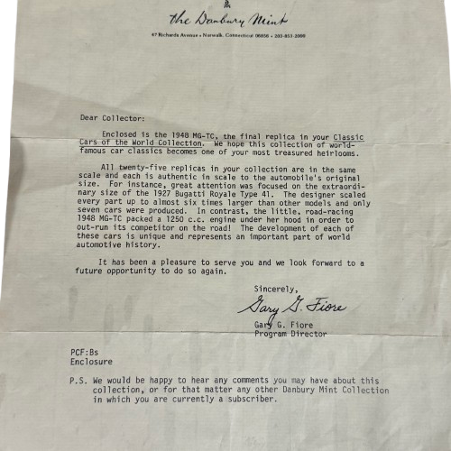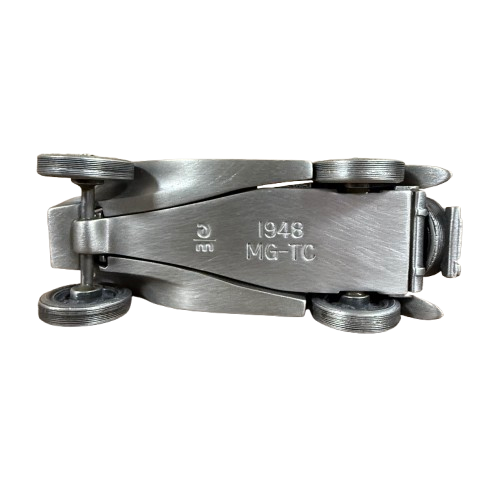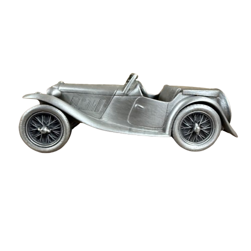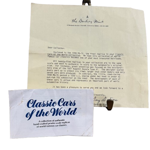 Classic post-war British sports car rendered in solid pewter. This 1948 MG-TC scale model was produced by The Danbury Mint and features open-top styling, detailed interior, and signature MG proportions.