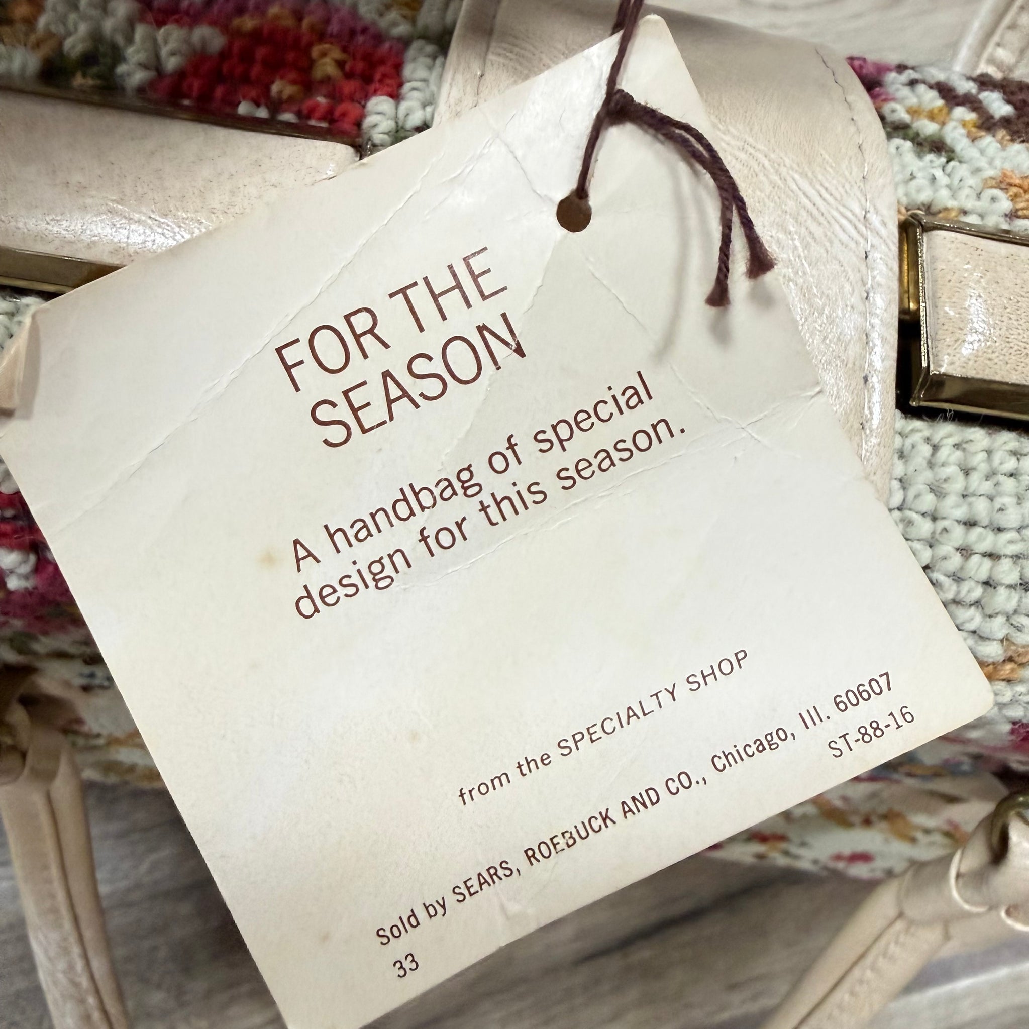A beautiful true vintage Sears handbag, new with original tags, featuring an intricate hand-style needlepoint floral tapestry with soft neutral trim. This structured silhouette is a classic mid-century design, complete with a gold-tone turn-lock closure and framed top opening.