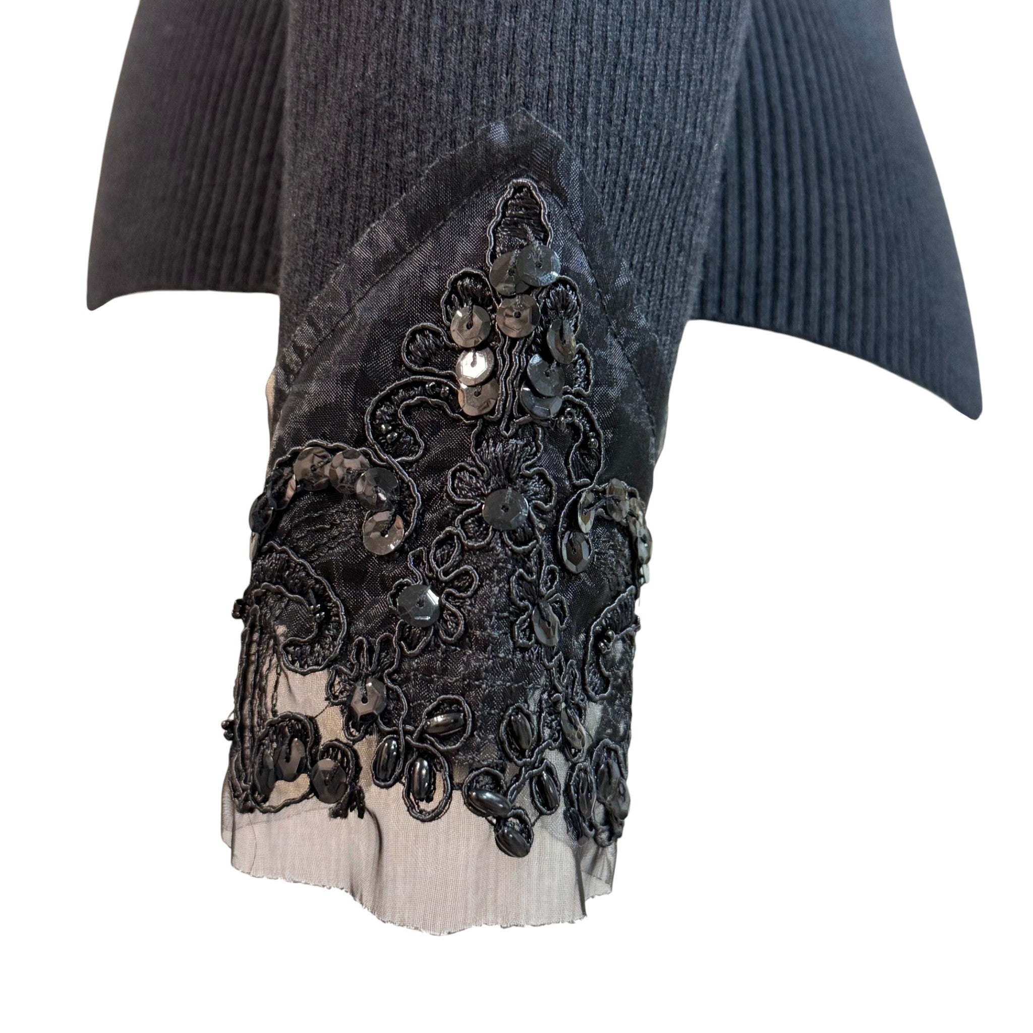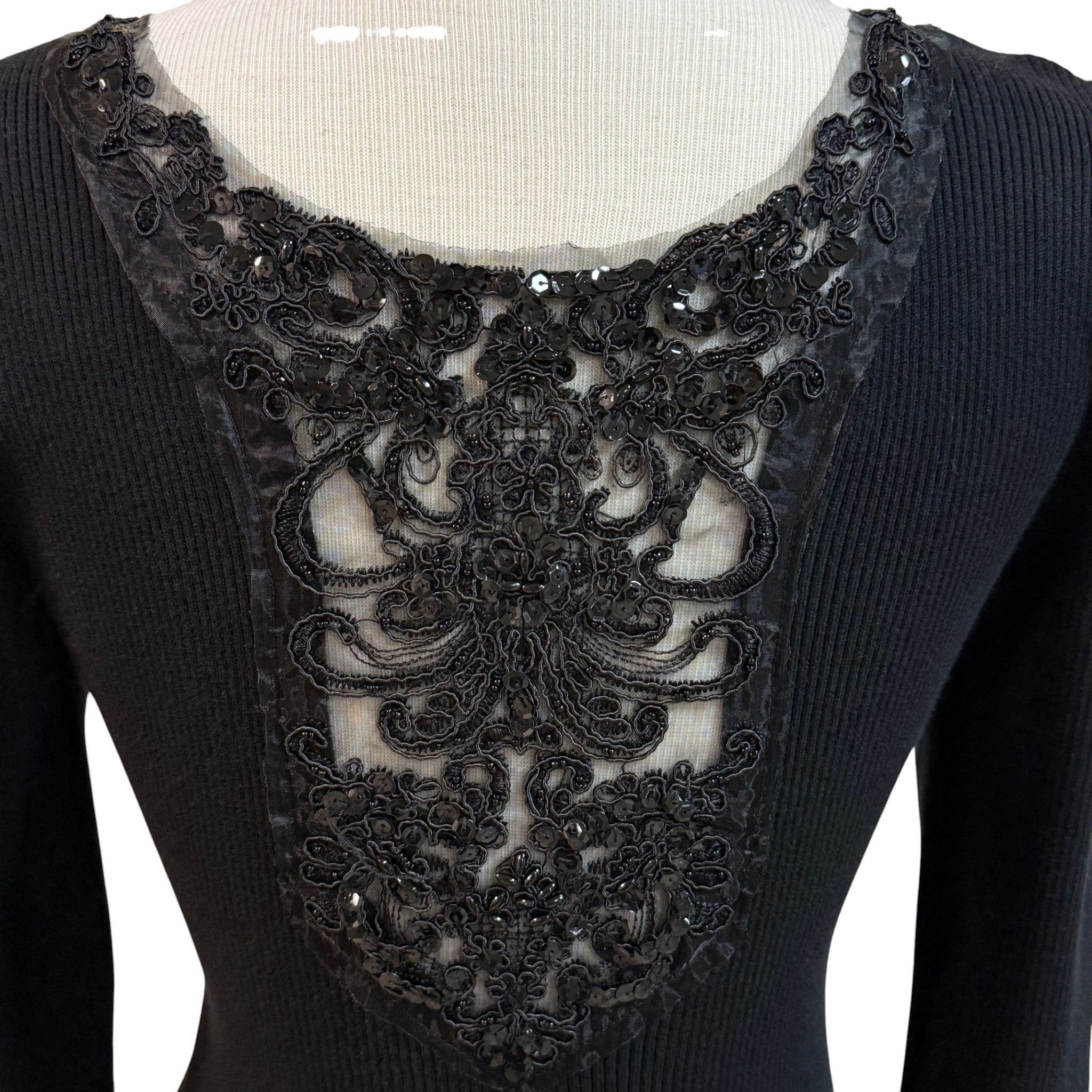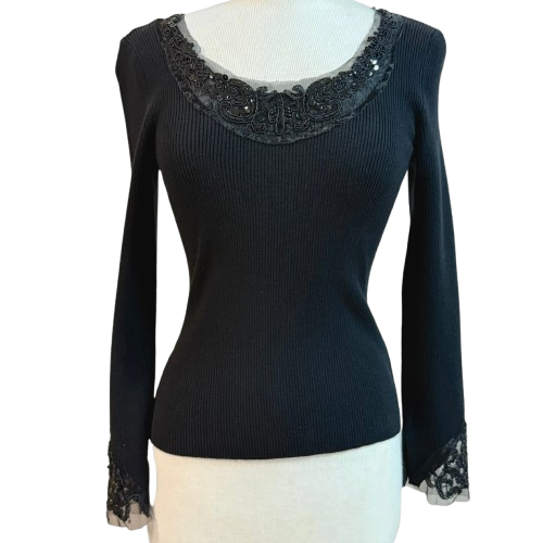 Black Ribbed Knit Sweater Sequin & Lace Trim Size Small