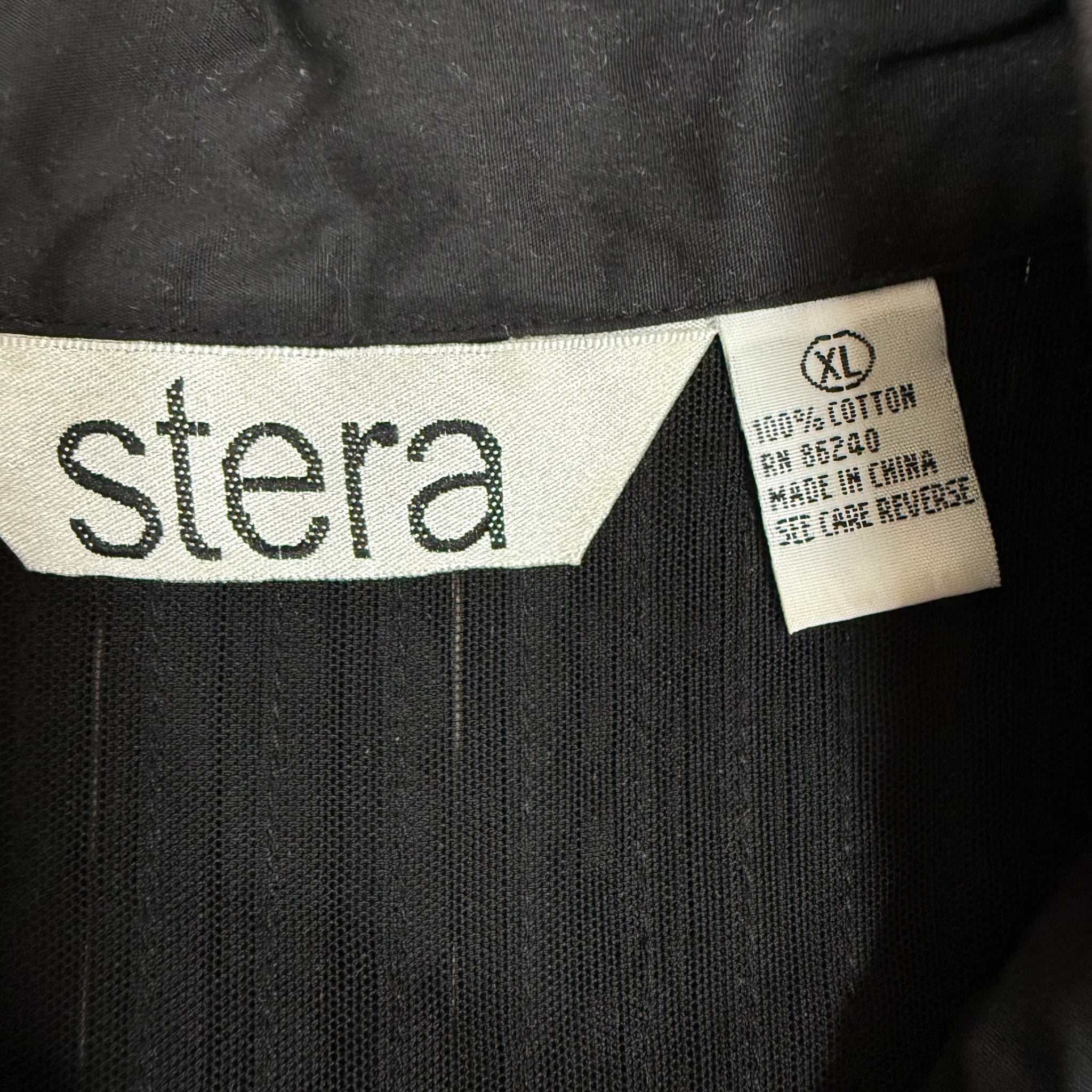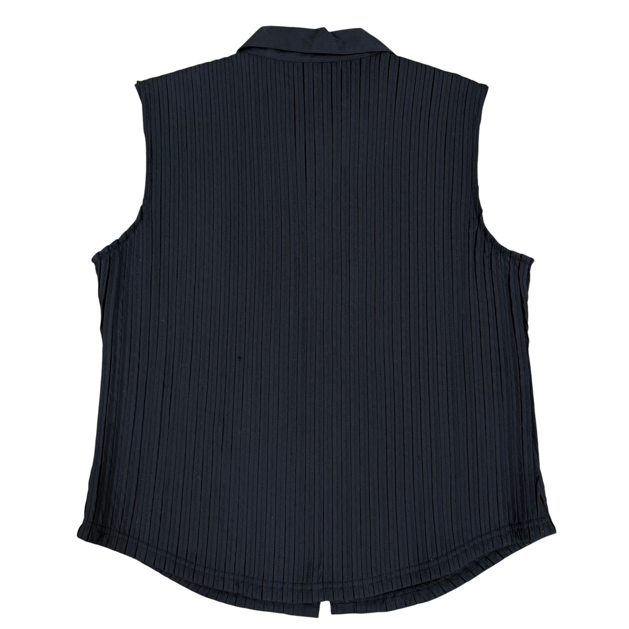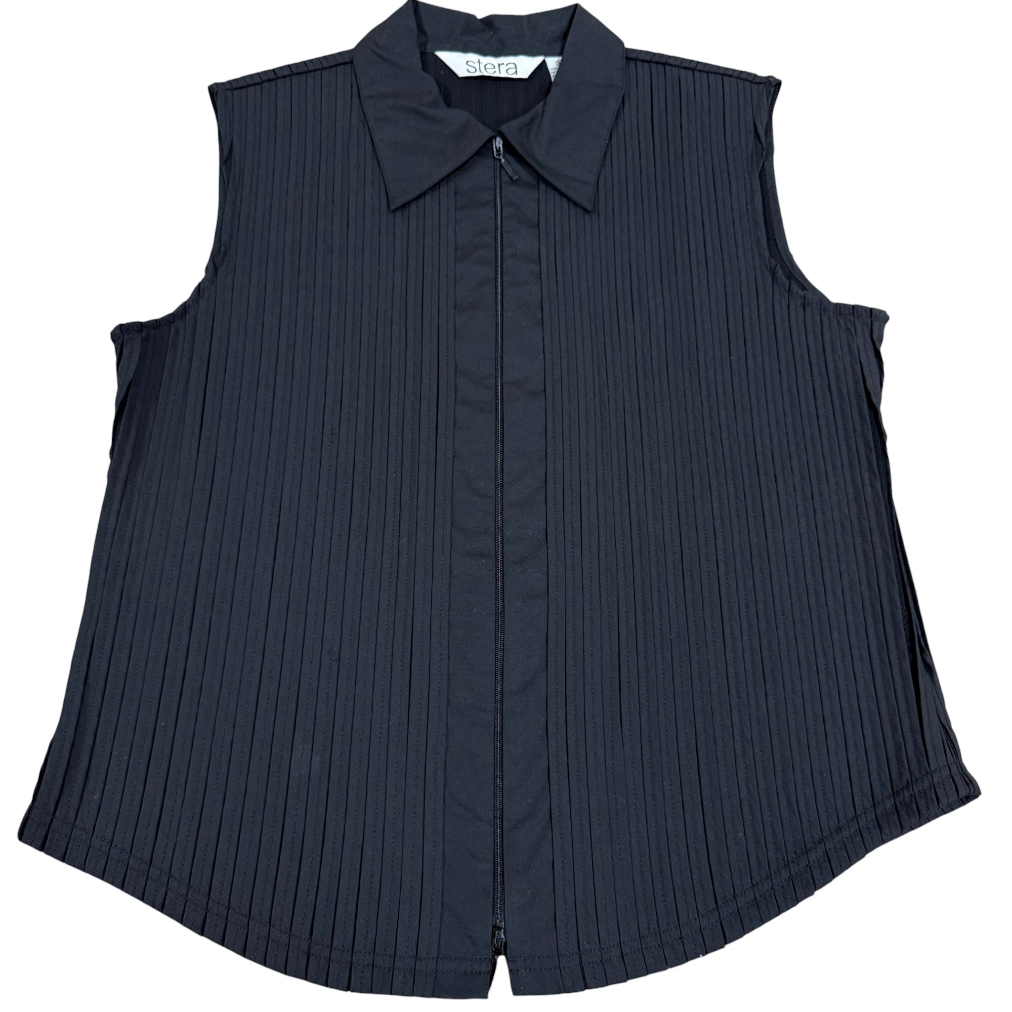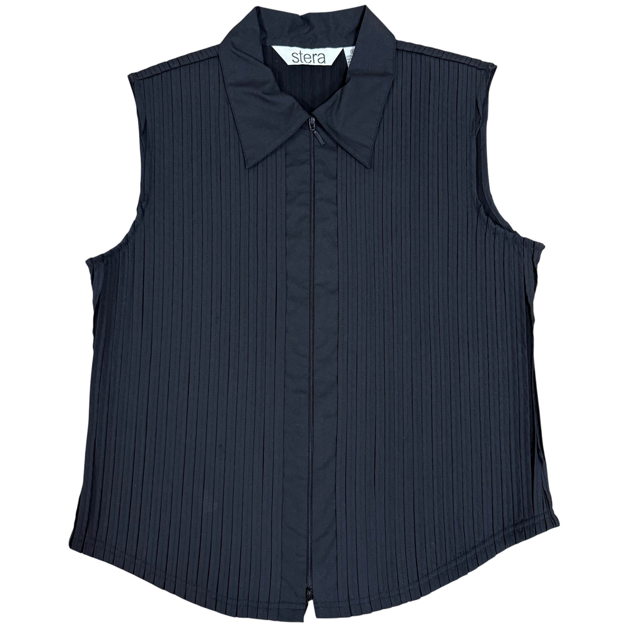 1990s Minimalist black sleeveless blouse by Stera, featuring vertical pleats and a zip front closure for a clean, modern silhouette. 100% cotton construction makes it perfect for layering or standalone wear.