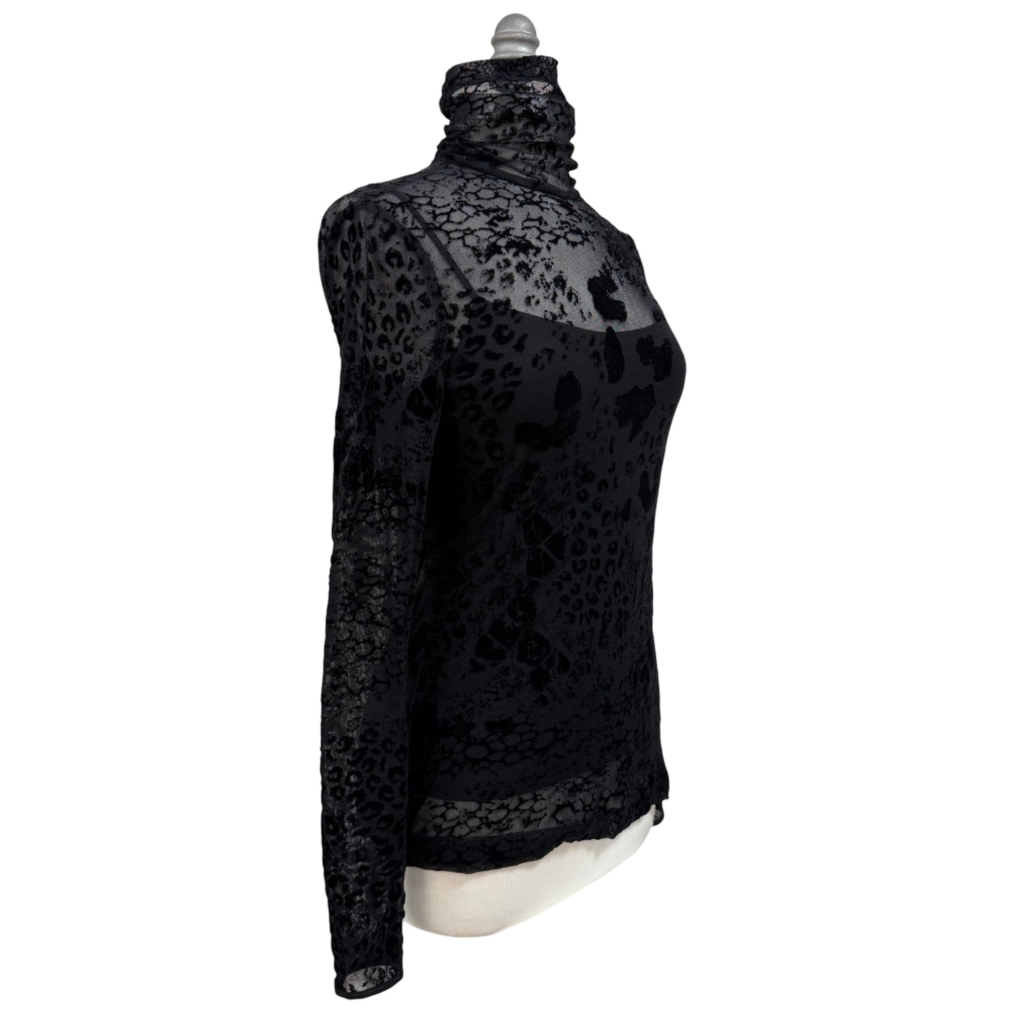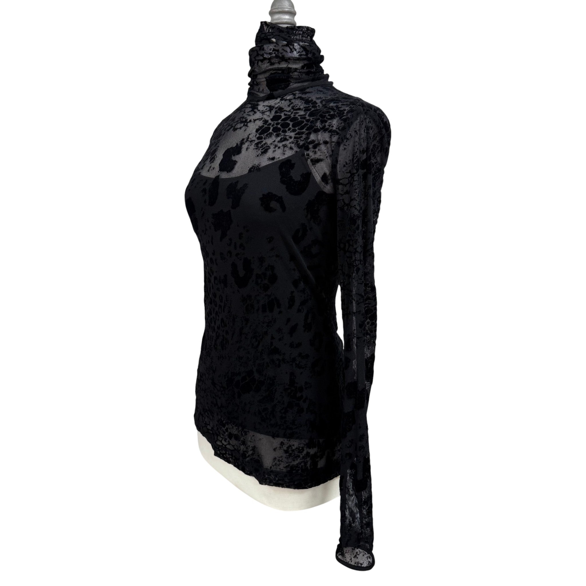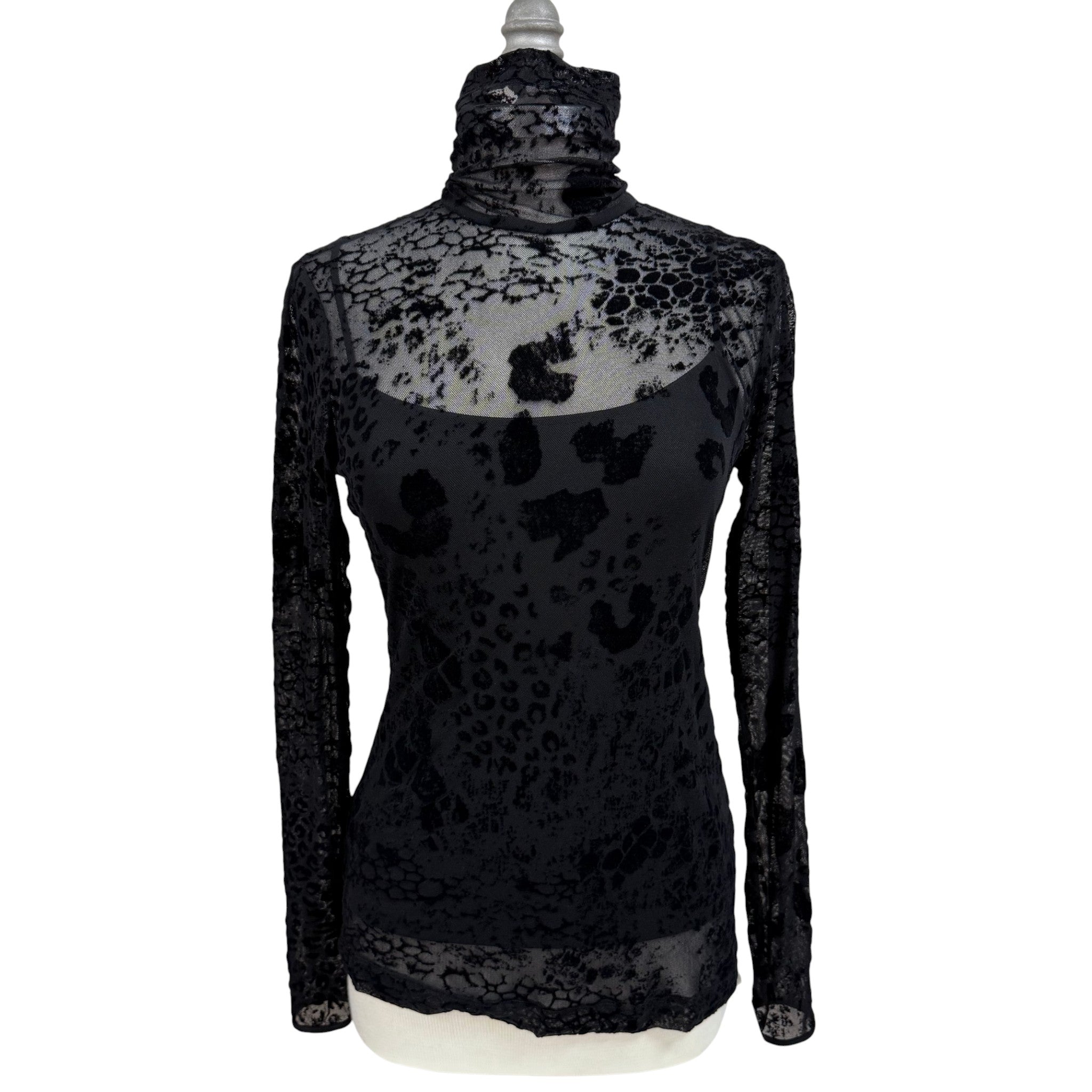 A striking late-90s/early-Y2K burnout velvet mesh turtleneck top featuring a semi-sheer silhouette with velvety abstract leopard patterning throughout. This piece comes with a matching black scoop neck tank top with adjustable straps.