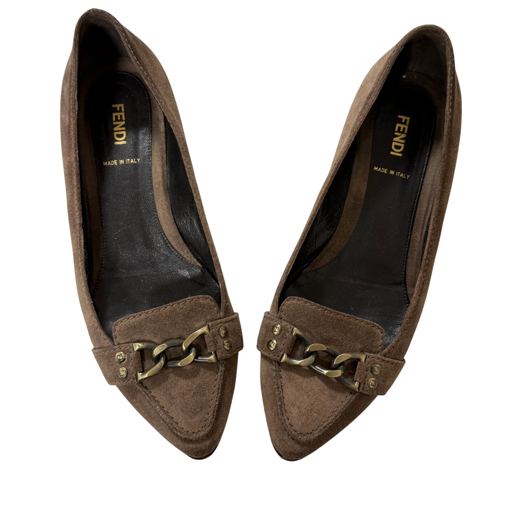 Authentic Fendi brown suede loafers featuring gold-tone chain hardware across the vamp. Classic Italian luxury flat with almond toe silhouette and leather-lined interior. Made in Italy with quality suede construction and signature Fendi styling.