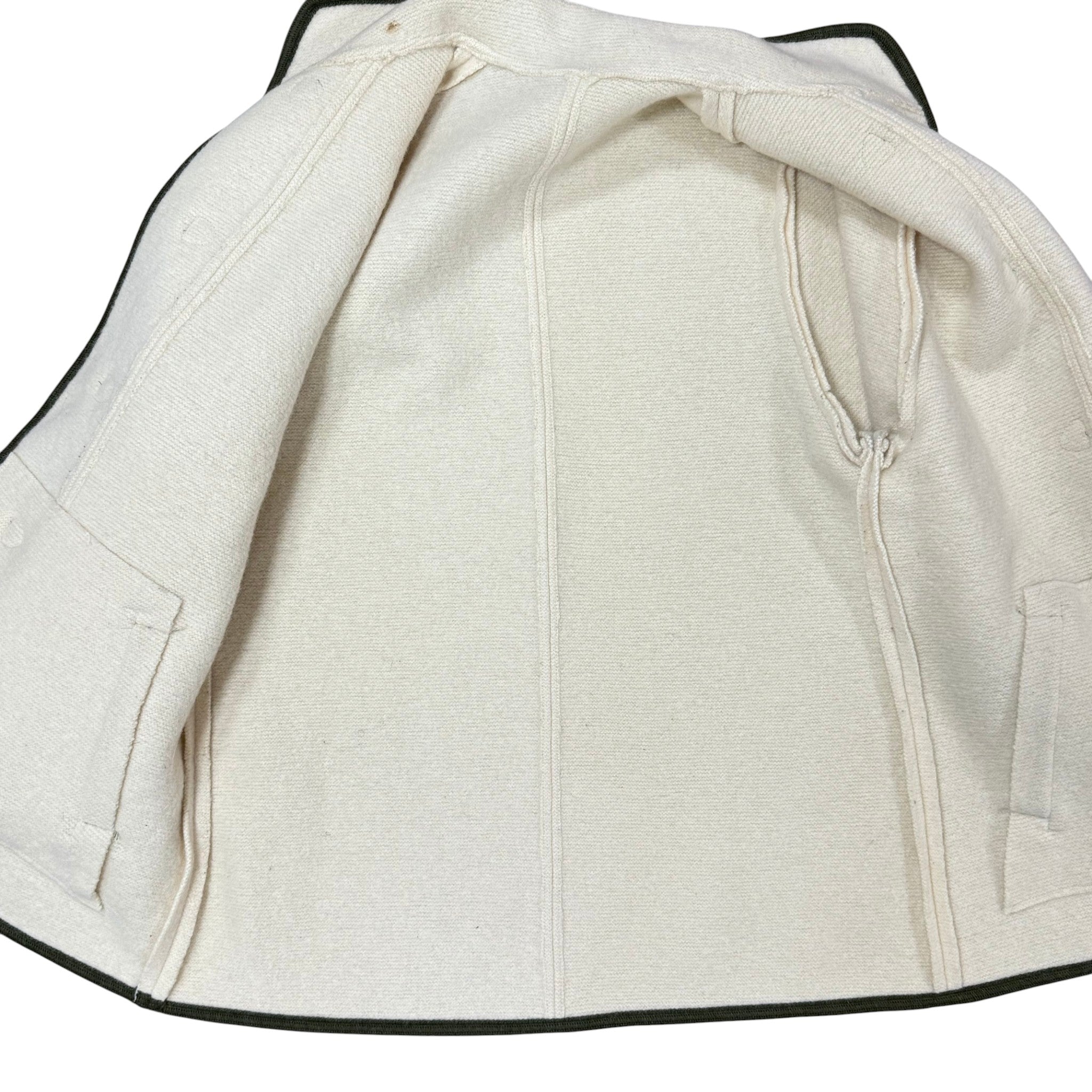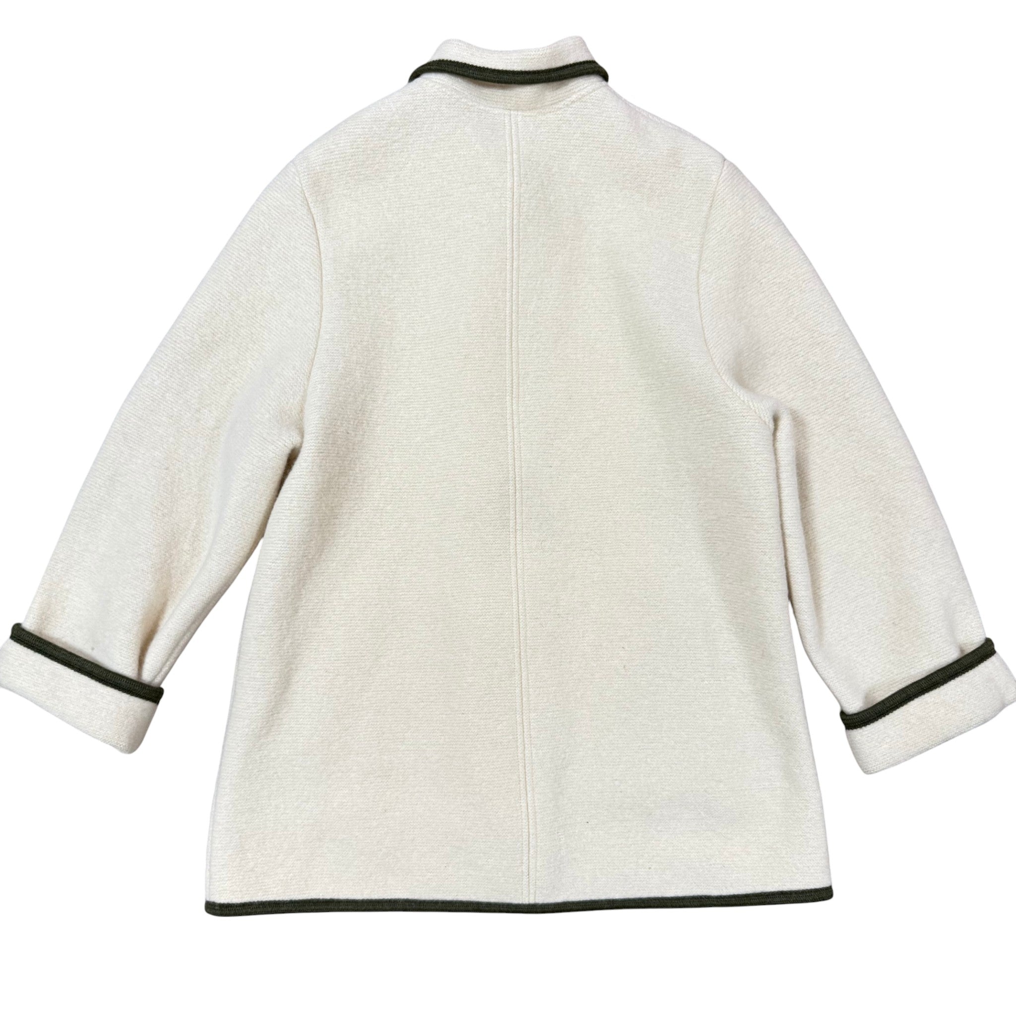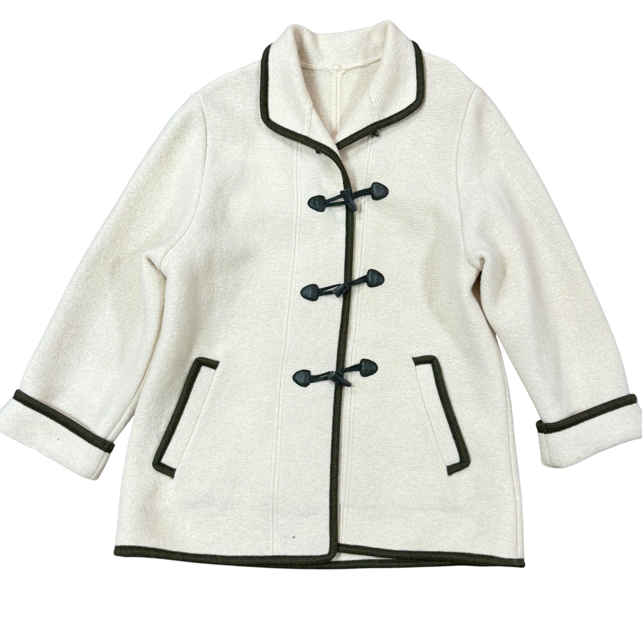 Gorgeous vintage 1970s boiled wool Alpine coat in a soft cream color with deep forest-green contrast trim and traditional toggle closures. This style is inspired by Austrian and Tyrolean mountaineering jackets, known for their warmth, structure, and beautiful tailoring.
