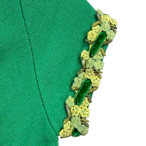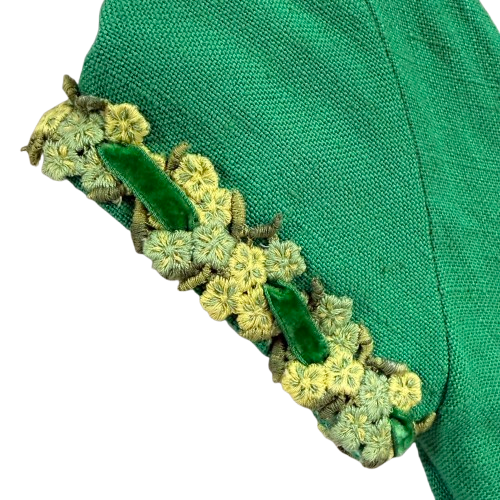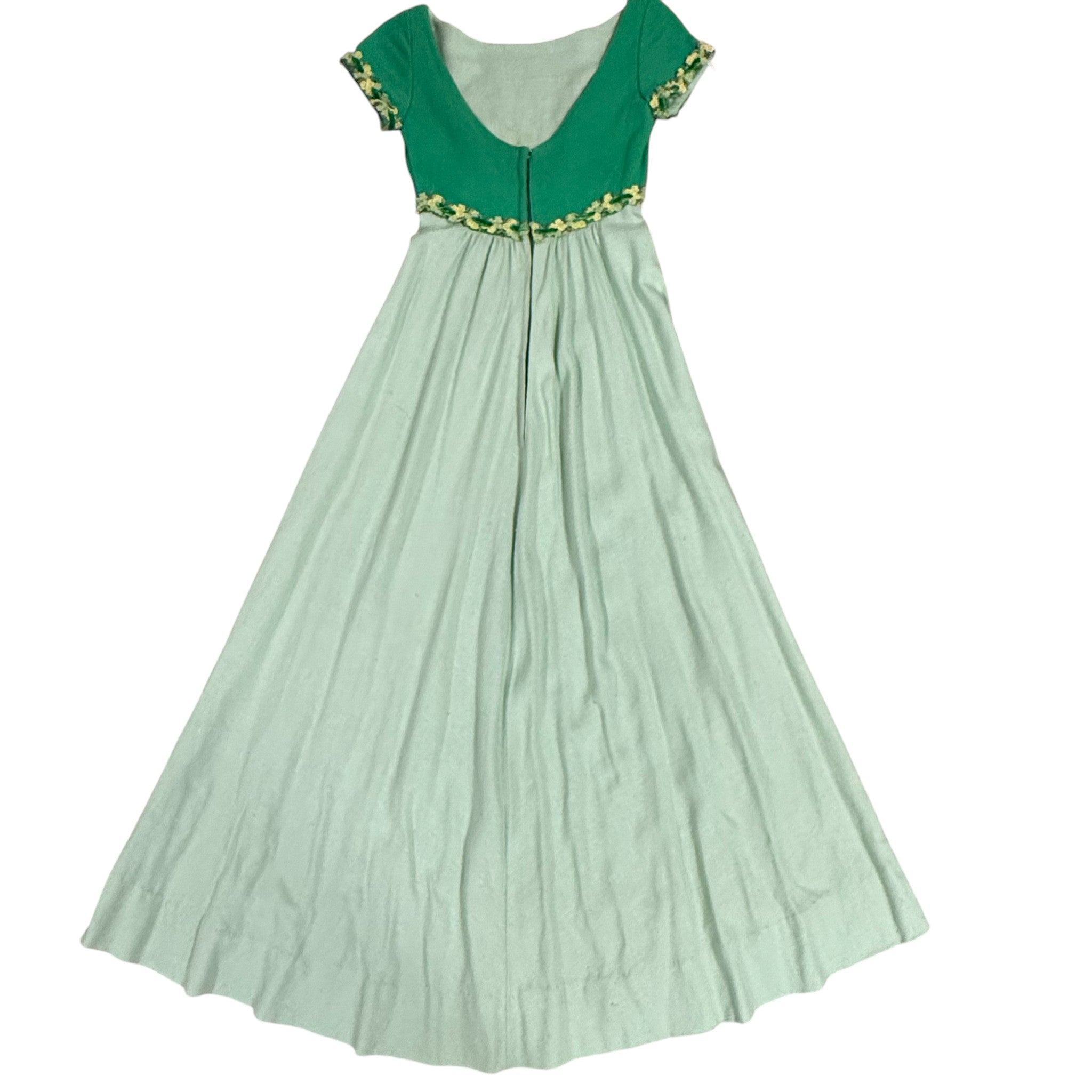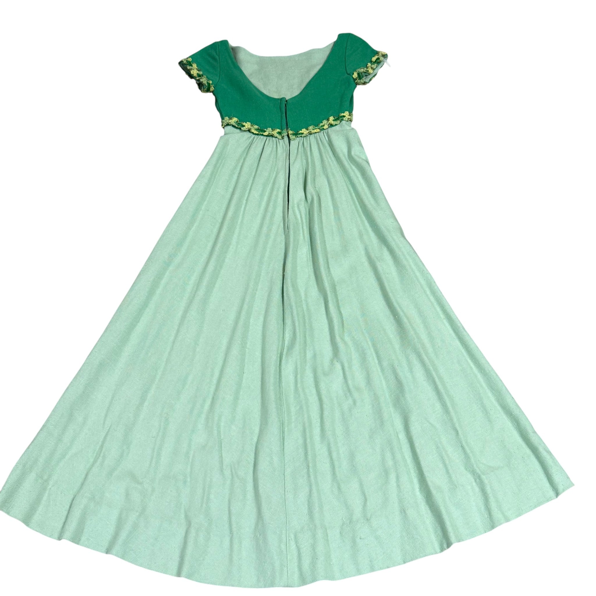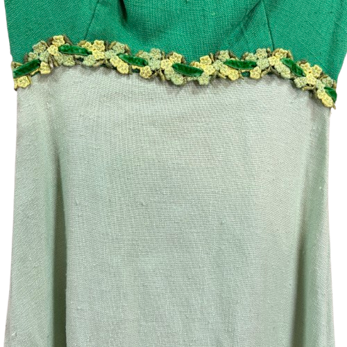 Charming XS vintage handmade empire waist dress crafted in what feels like a linen or raw cotton weave. Features a rich green fitted bodice with delicate floral appliqué trim at the bust and sleeves, paired with a soft sage skirt that flows into a flattering A-line silhouette. Scoop neckline and short cap sleeves give it a romantic cottagecore feel. Visible hand construction details and natural fibers add to its artisan character. A unique one-of-a-kind vintage piece perfect for spring and summer wear.