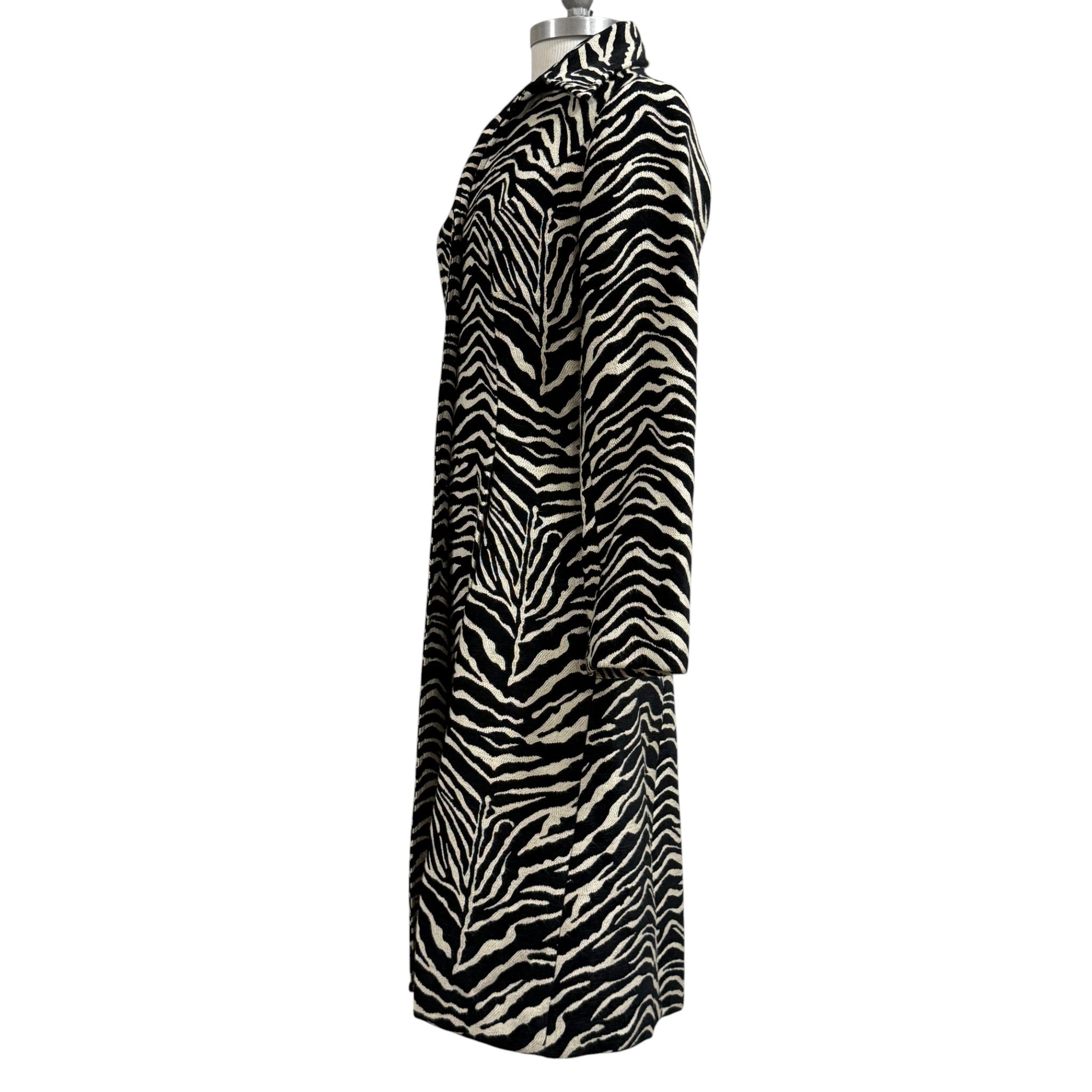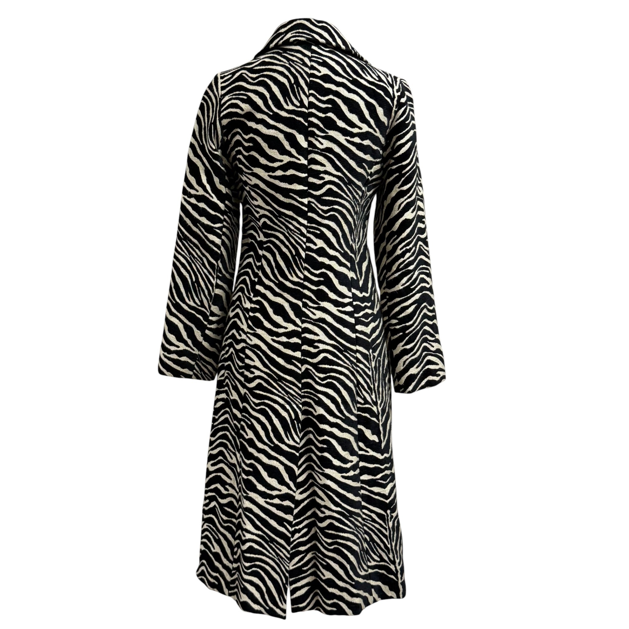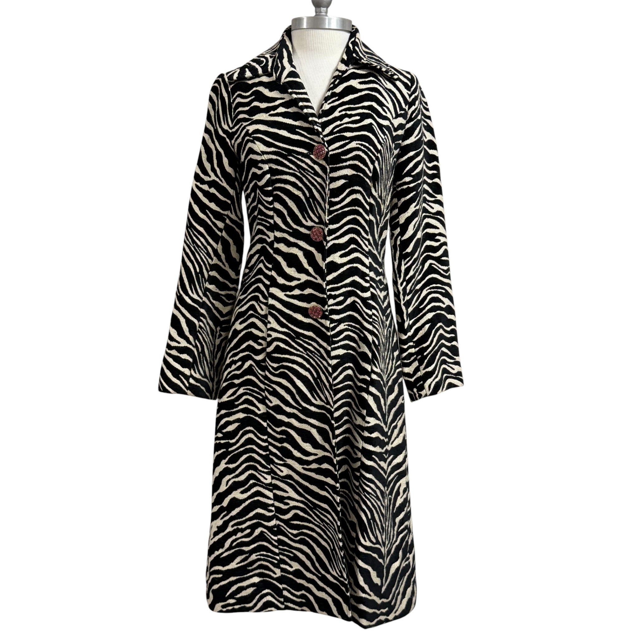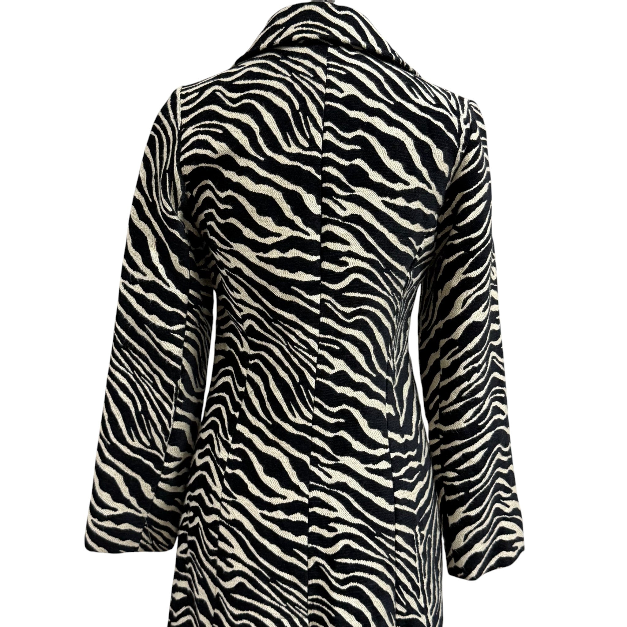 VTG Zebra Print Single Breasted Coat Size Small - Statement zebra print coat by 3 Sisters, channeling early-2000s glam with structured tailoring and bold animal print. Features a soft woven textured fabric, pointed collar, front button closure with jewel-toned buttons, and a flattering longline cut. Perfect for standout streetwear or retro revival looks.