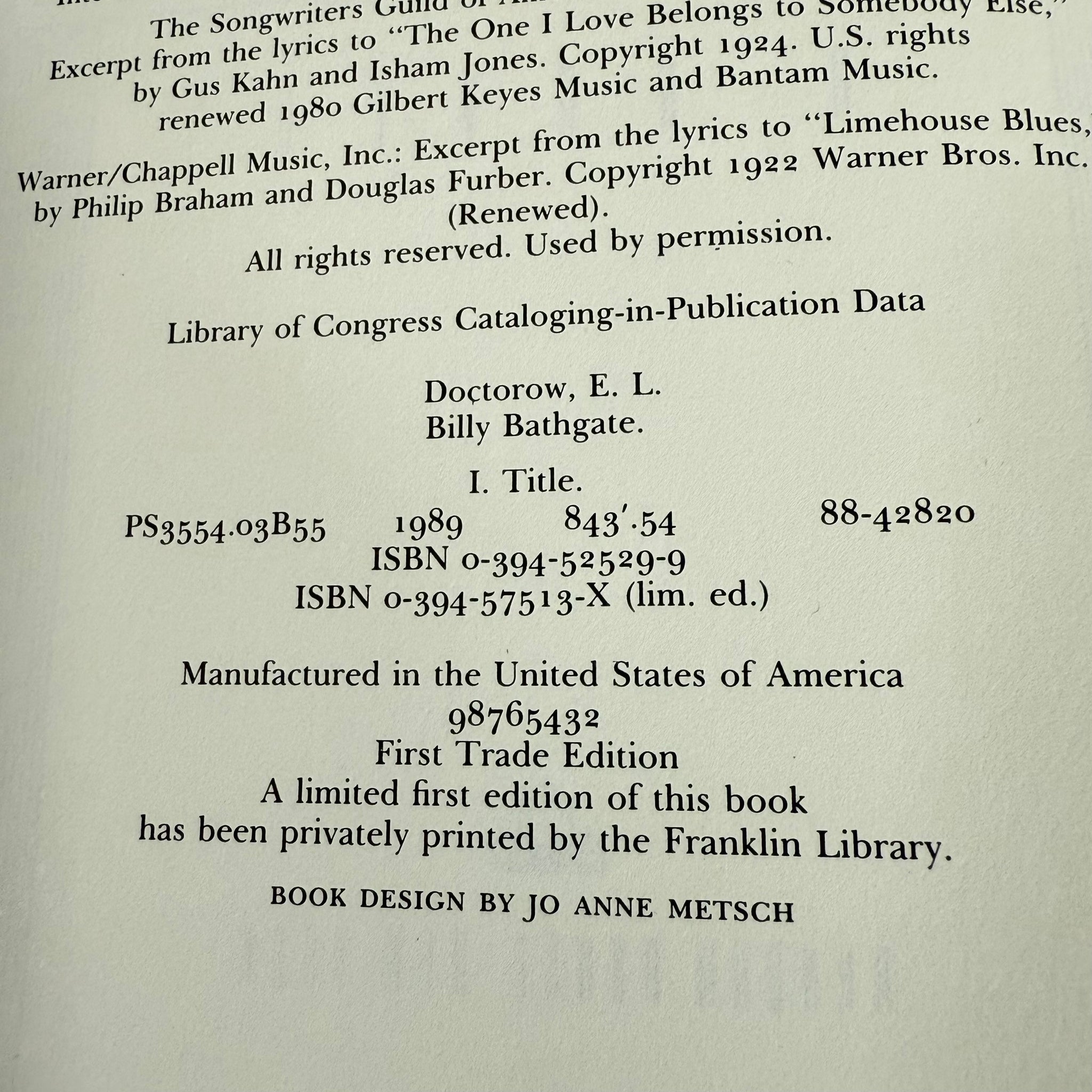 Collectible first trade edition of Billy Bathgate by E. L. Doctorow, published by Random House in 1989. This Pulitzer-finalist novel captures the coming-of-age of a boy drawn into 1930s New York’s criminal underworld.