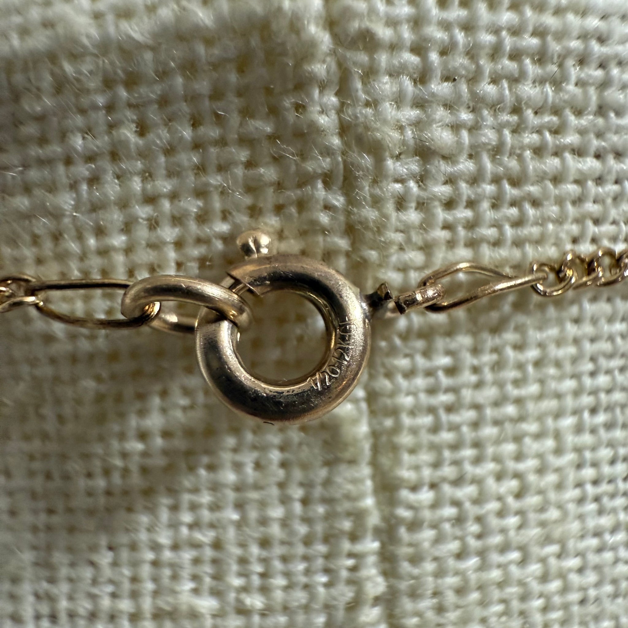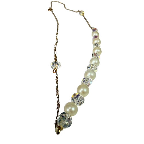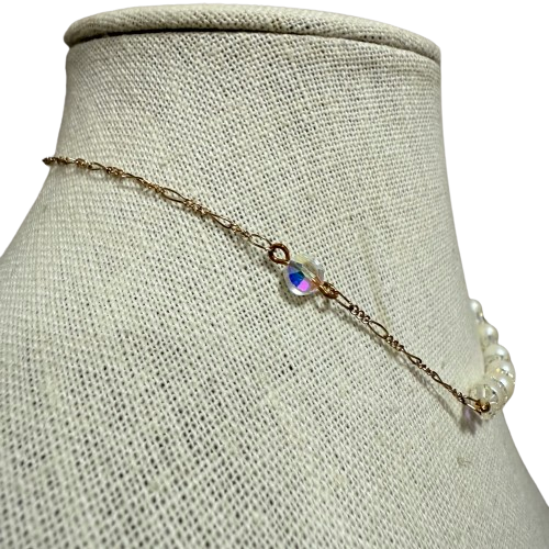 This delicate mid-century choker features brilliant aurora borealis crystal beads paired with luminous simulated pearls, hand-strung on a delicate 12K gold-filled chain. Measuring 15 inches, this piece sits beautifully at the collarbone, catching light with every movement for an elegant, timeless sparkle. The aurora borealis finish — introduced in the 1950s — gives each crystal a rainbow sheen that shifts from soft pastels to radiant highlights, making this necklace a classic example of 1950s evening glamour.