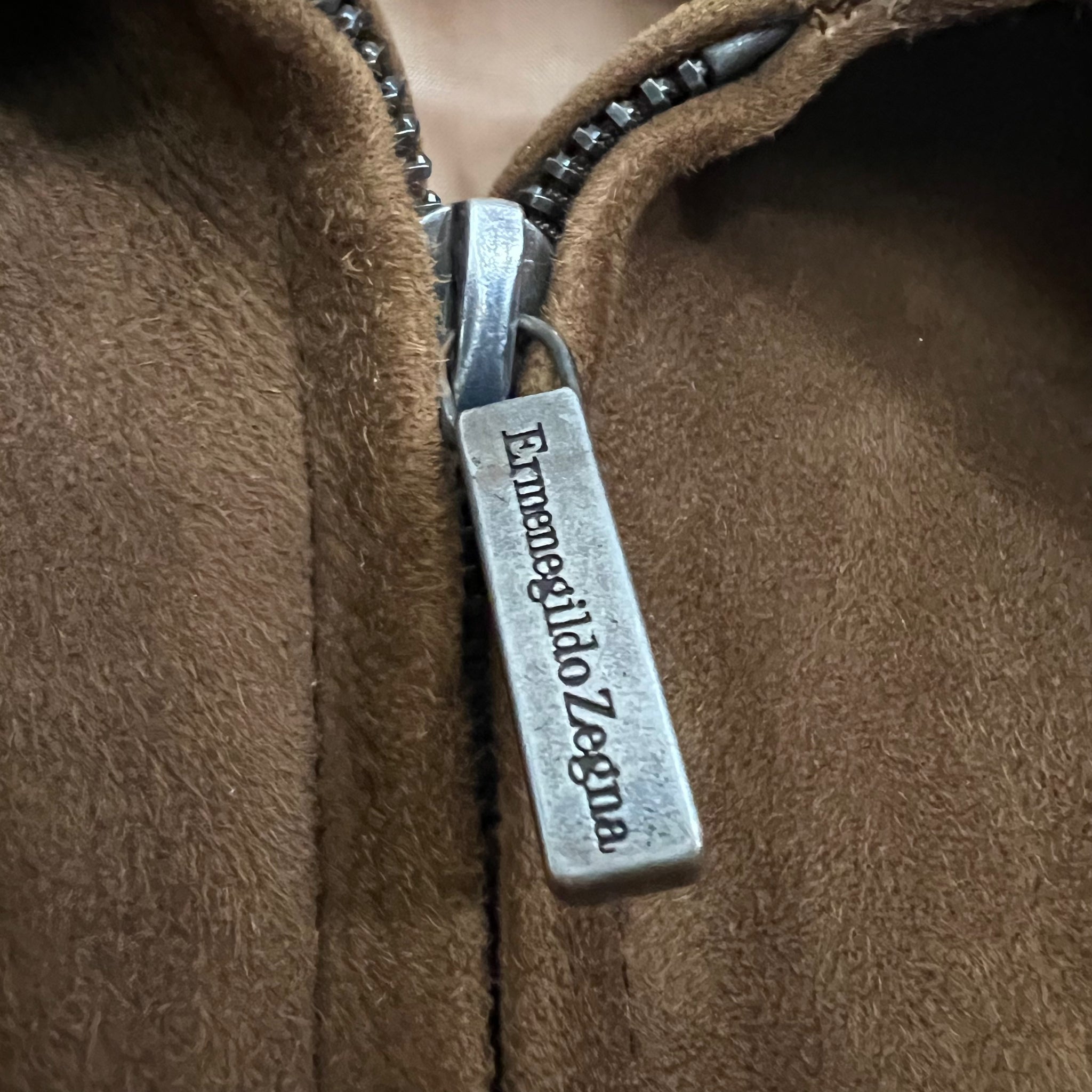Zegna Brown Suede Jacket size 40. Full zip closure. Features a 25% cashmere/ 75% virgin wool lining. Two square hip pockets and one inner chest pocket. Please note that the label is marked in Italian sizing which reads size 50.
