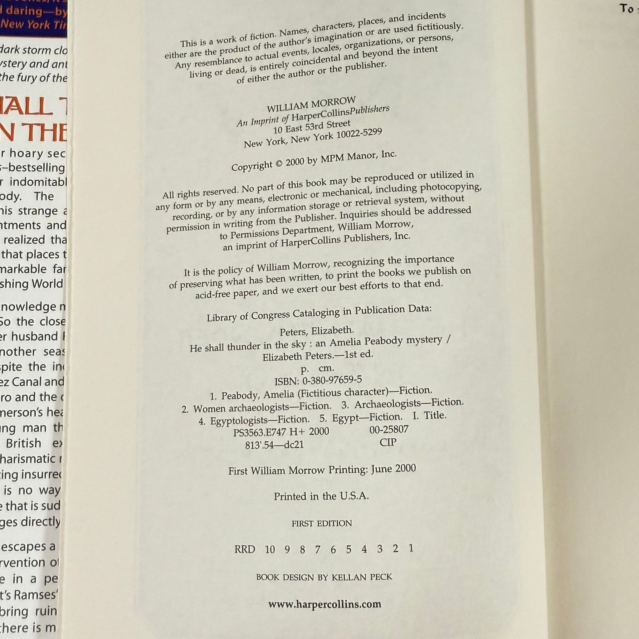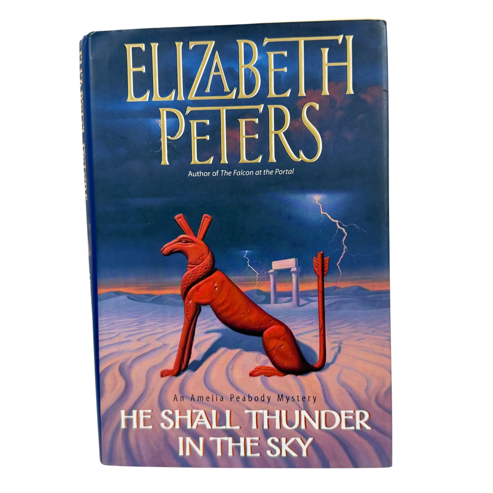 A beautiful first edition, first printing of He Shall Thunder in the Sky by Elizabeth Peters — part of the beloved Amelia Peabody mystery series.