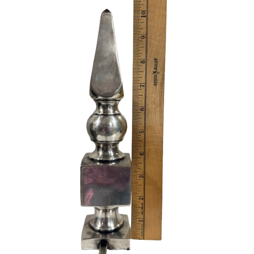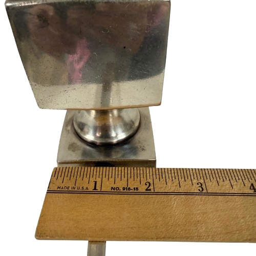 Striking vintage mid-century modern sculptural hook, designed as a freestanding decorative object with functional hanging use. Crafted in heavy silver-tone metal, this piece features stacked geometric forms topped with a finial-style silhouette and a single curved hook extending outward.