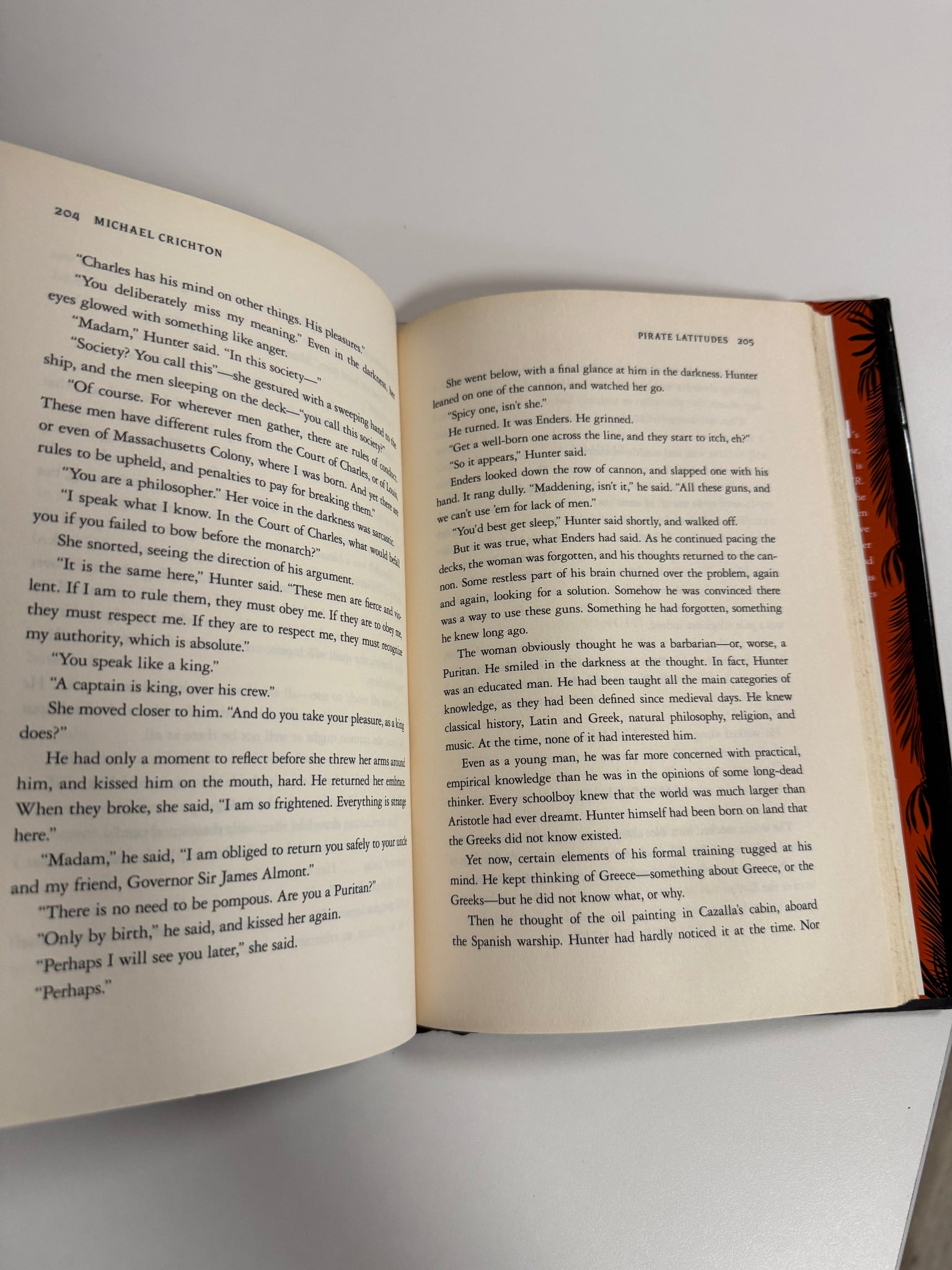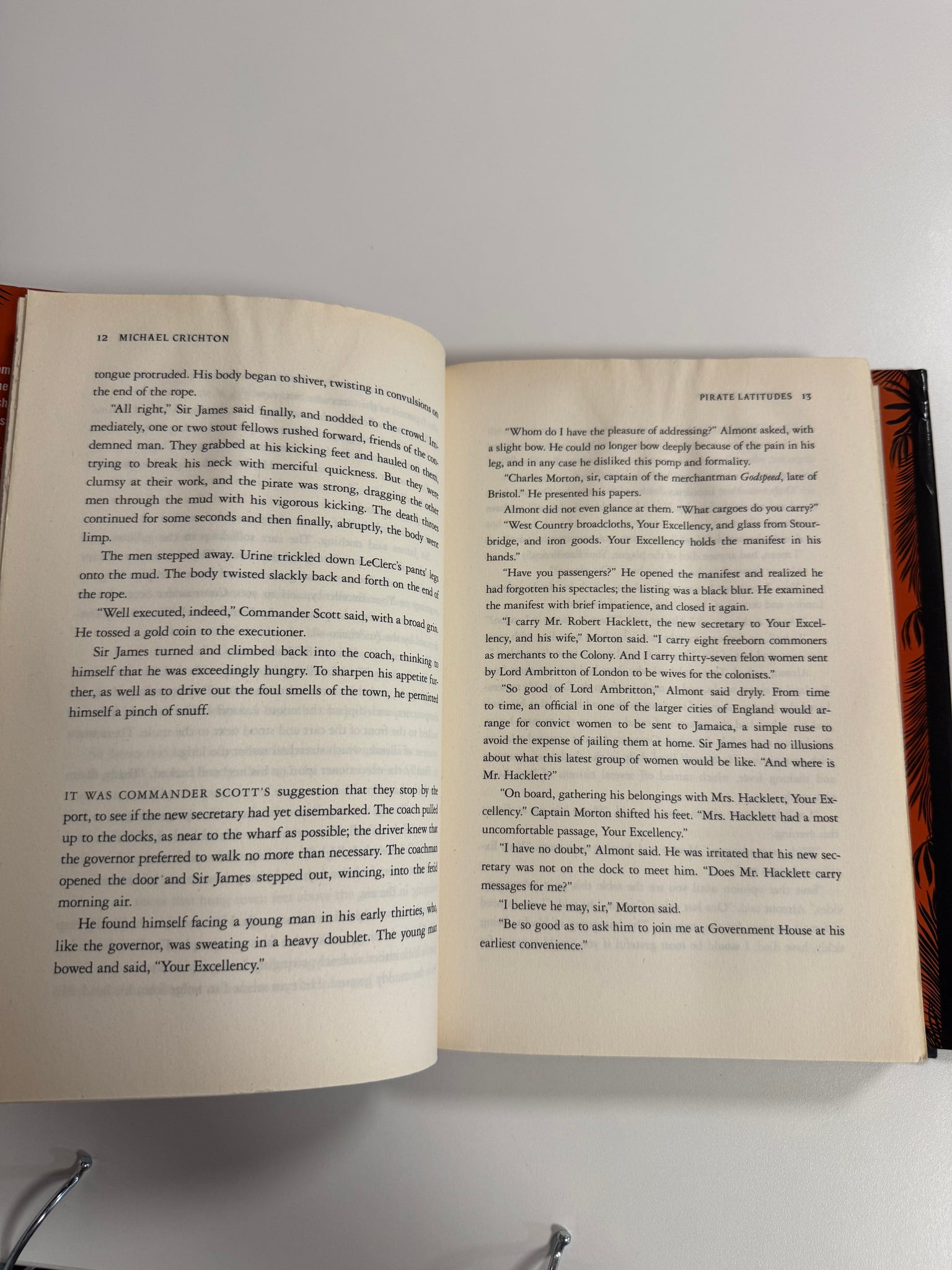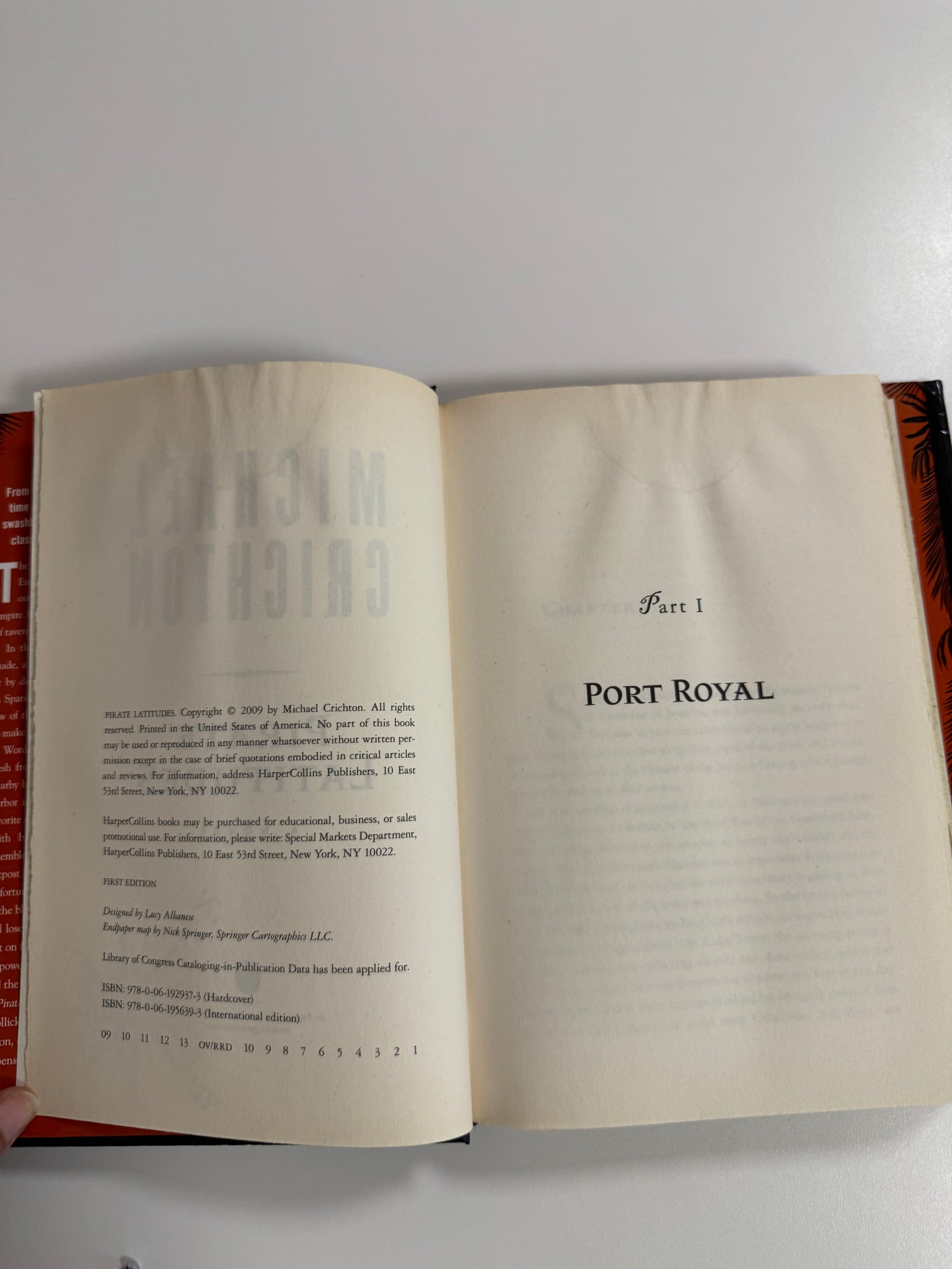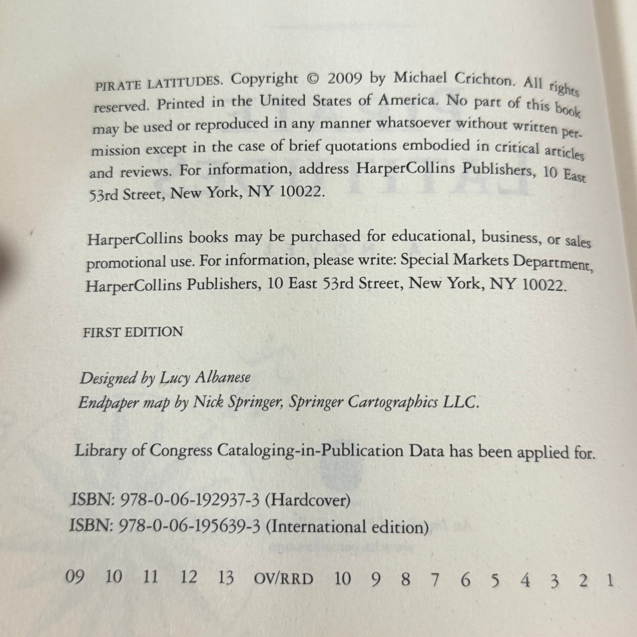 First Edition, First Printing hardcover of Pirate Latitudes by Michael Crichton. Published posthumously by HarperCollins in 2009, this novel was discovered in Crichton’s files after his passing, making it not only a thrilling story but also a special piece of literary history for collectors.