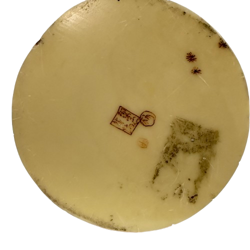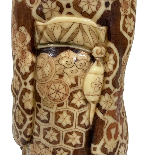 Chinese God Of Longevity Figurine crafted in cast resin with hand-incised and inked detailing, designed to emulate traditional carved ivory. Depicts a literati figure holding a scroll, accompanied by cranes symbolizing wisdom and longevity. The surface features finely engraved geometric and floral robe patterns with darkened line work. Incised Chinese-style maker’s mark on base, likely a studio or workshop signature. Mid-20th-century Chinese export decorative art. Displays beautifully.