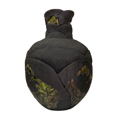 A dramatic studio pottery vessel by Elaine Xenelis Fuller, hand-built in her signature patchwork style. This piece features a dark, textured black matte surface with layered geometric panels, revealing glowing green crackle raku inlay beneath. The organic curves and scale-like patterning give the form a striking, almost dragon-egg presence.