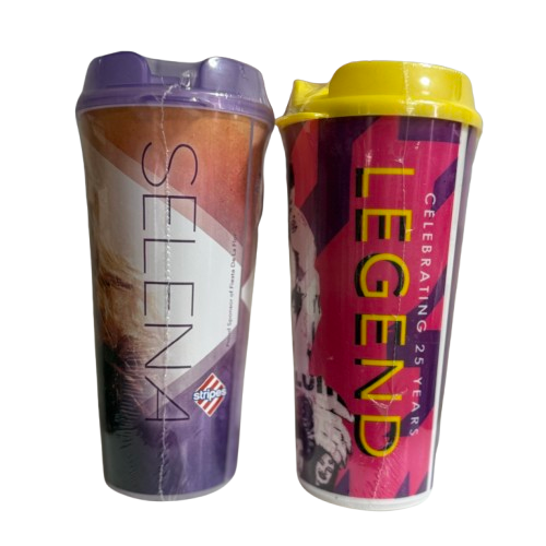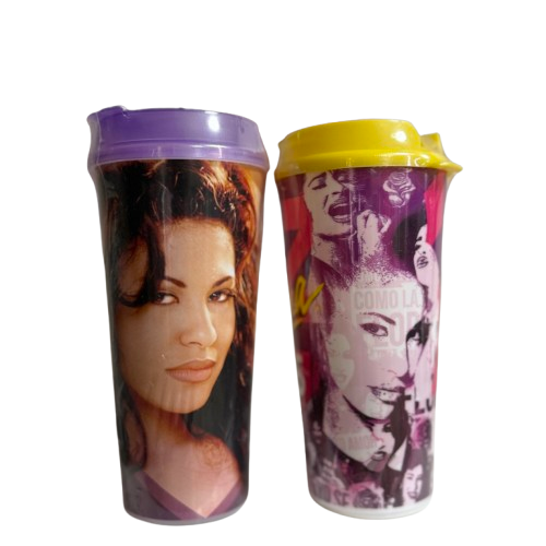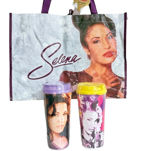 Selena “Siempre” H-E-B tote bag in white/purple paired with two Selena travel mugs — one purple-lid portrait mug and one yellow-lid collage mug.