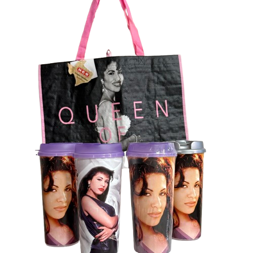Rare Selena “Queen of Cumbia” H-E-B tote paired with four collectible Selena travel mugs — purple lid portrait mug + gray lid portrait mug.