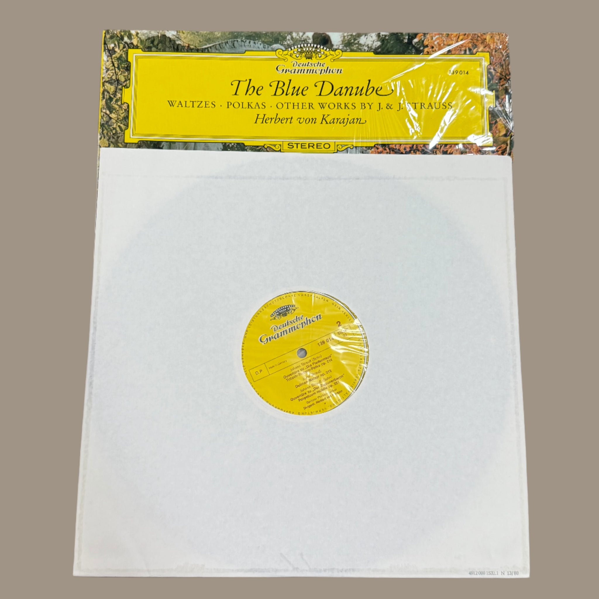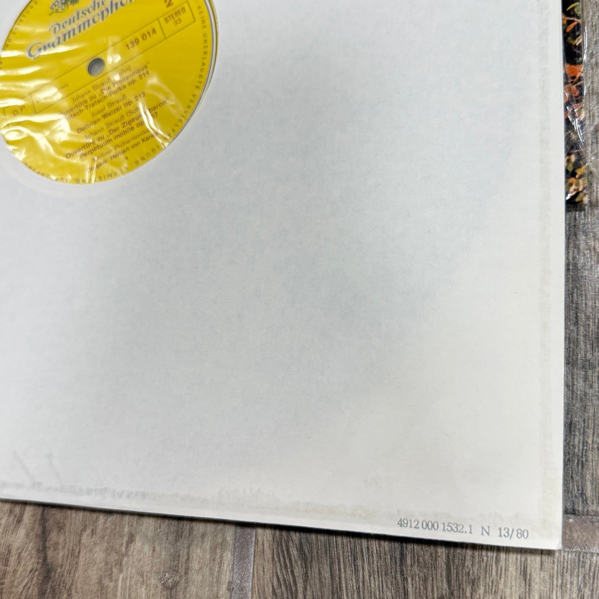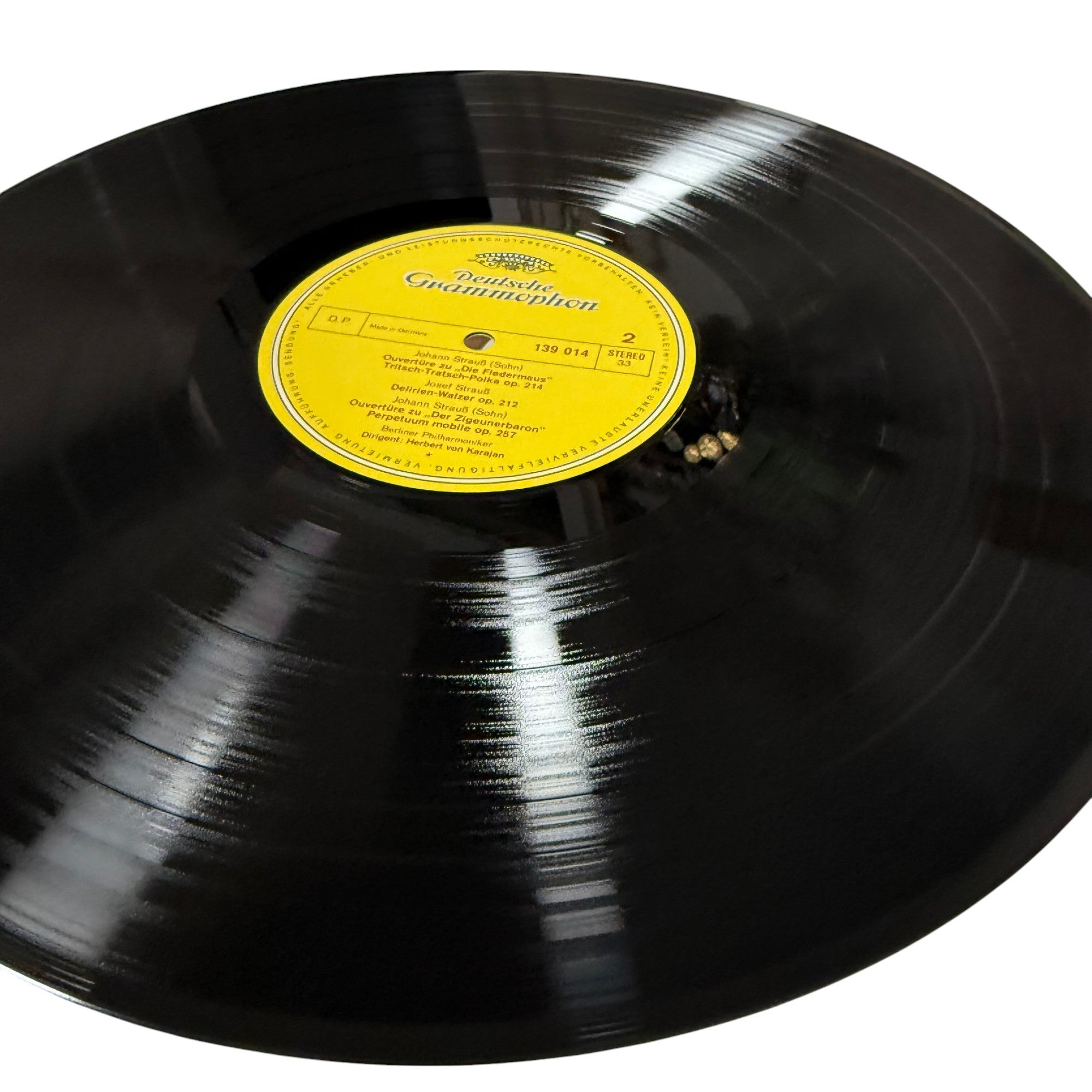 Original 1967 stereo LP pressed in West Germany by Deutsche Grammophon, catalog #139 014, conducted by Herbert von Karajan with the Berlin Philharmonic. This beautiful vintage pressing includes waltzes, polkas, and other well-loved pieces by Johann & Josef Strauss.