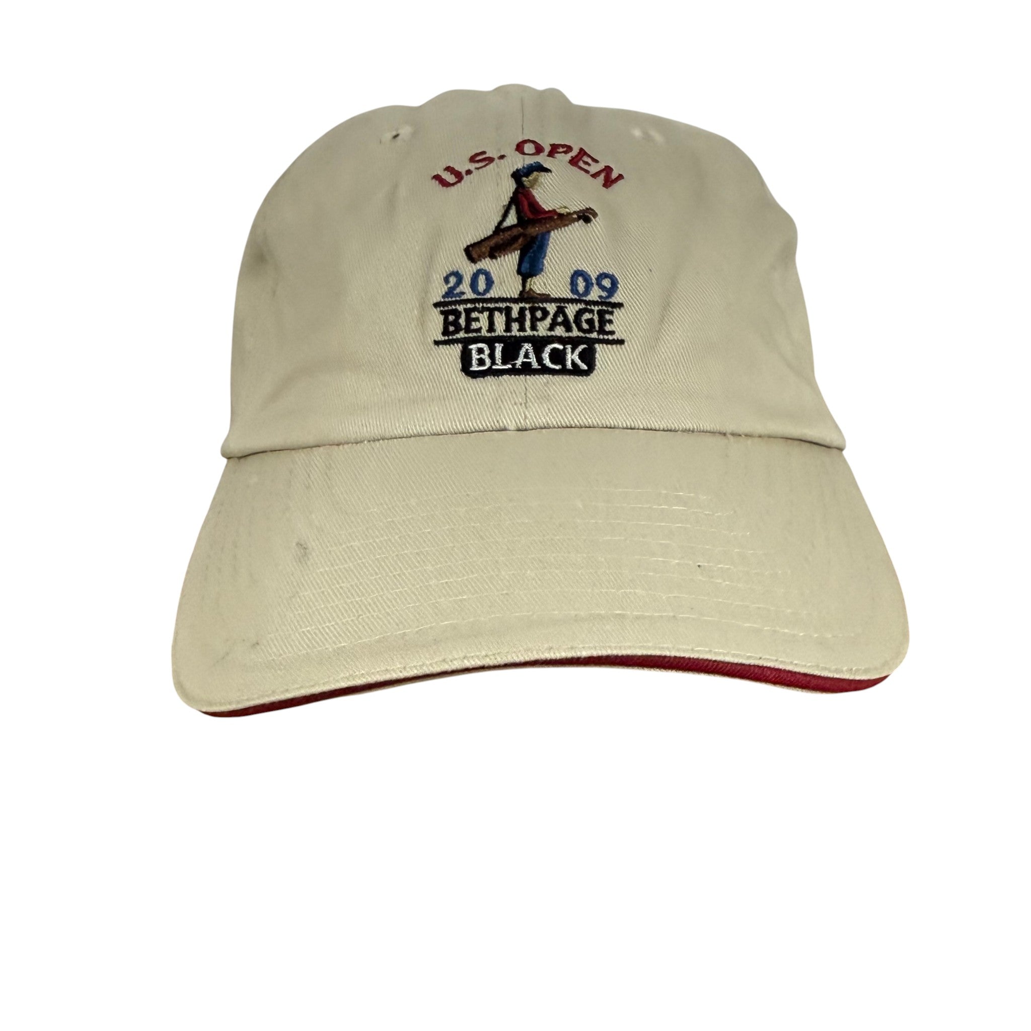 Authentic U.S. Open golf cap from the 2009 Championship held at Bethpage Black Course in Farmingdale, New York. Features the iconic caddie figure logo with “U.S. Open 2009 Bethpage Black” embroidered on the front and “USGA Member” embroidery on the back. A collectible tournament souvenir from one of the most famous and challenging public courses in championship golf history.
