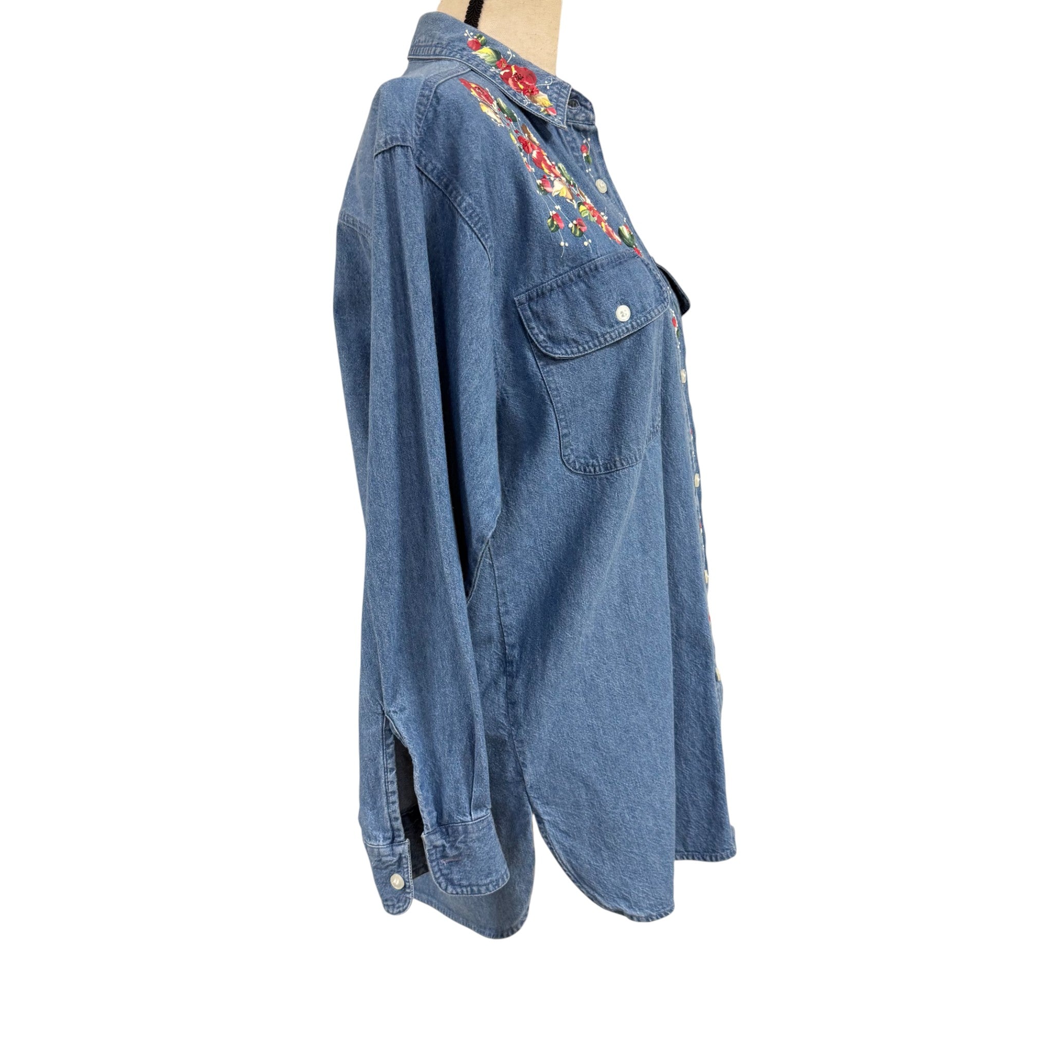 Vintage 1990s Hand Painted Denim Shirt Floral Small