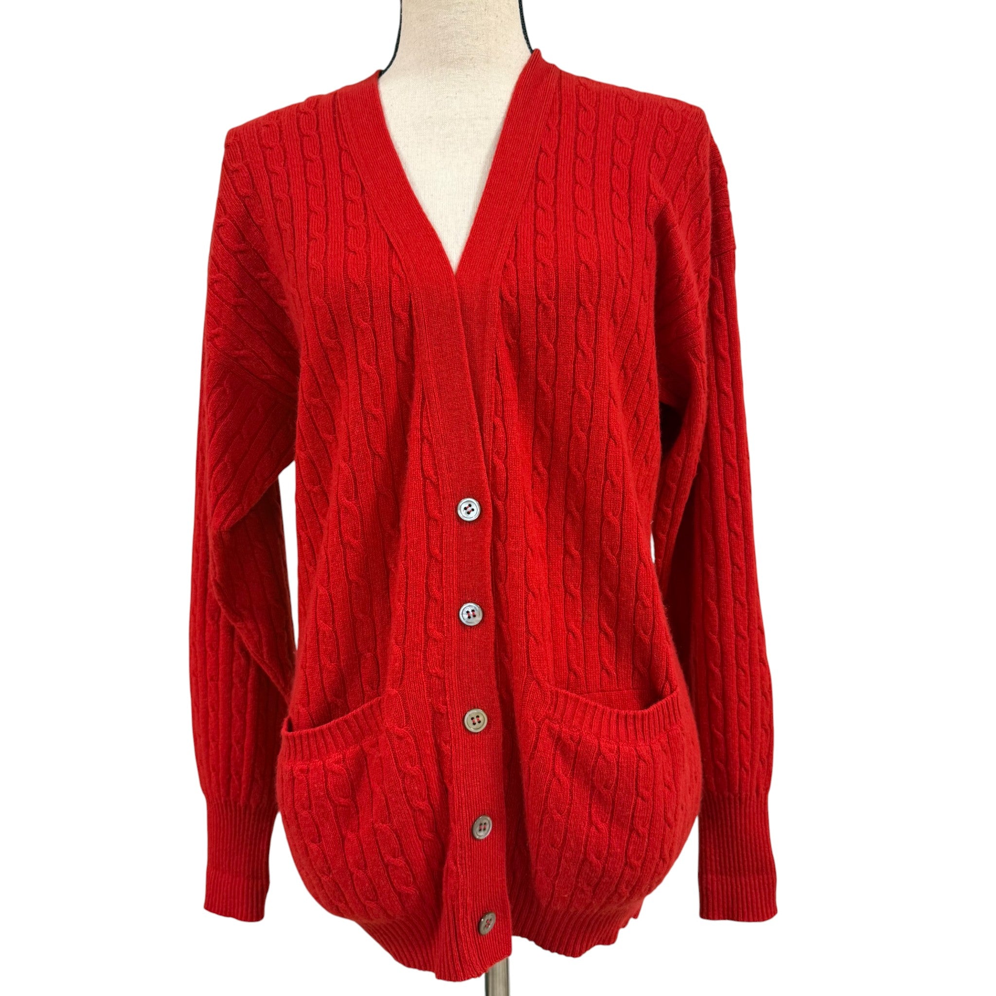 Vintage Nordstrom Town Square Cashmere Cable Knit Cardigan. Luxurious cashmere cardigan in a bold red cable knit. Features front button closure, deep front pockets, and soft 2-ply cashmere. A timeless wardrobe staple.