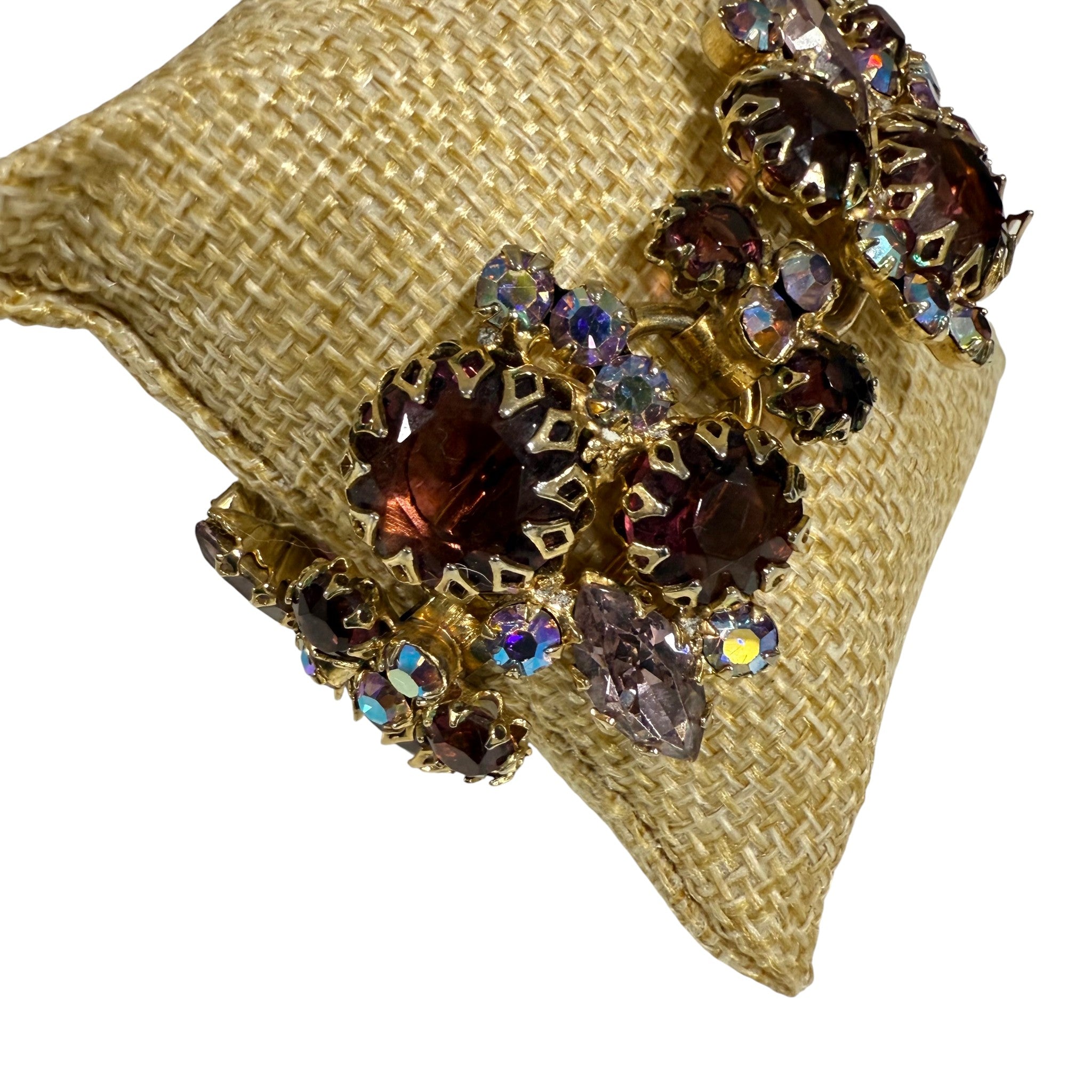 A breathtaking mid-century statement bracelet attributed to Juliana / DeLizza & Elster, dating to the early 1960s. This glamorous piece features a dramatic tiered design with deep amethyst and plum rhinestones, accented by brilliant Aurora Borealis chatons. Each stone is individually prong-set in ornate dog-tooth crowns, creating a highly dimensional dome effect that sparkles from every angle. Finished in rich gold tone metal with etched oblong connectors, a secure box clasp, and original safety chain.