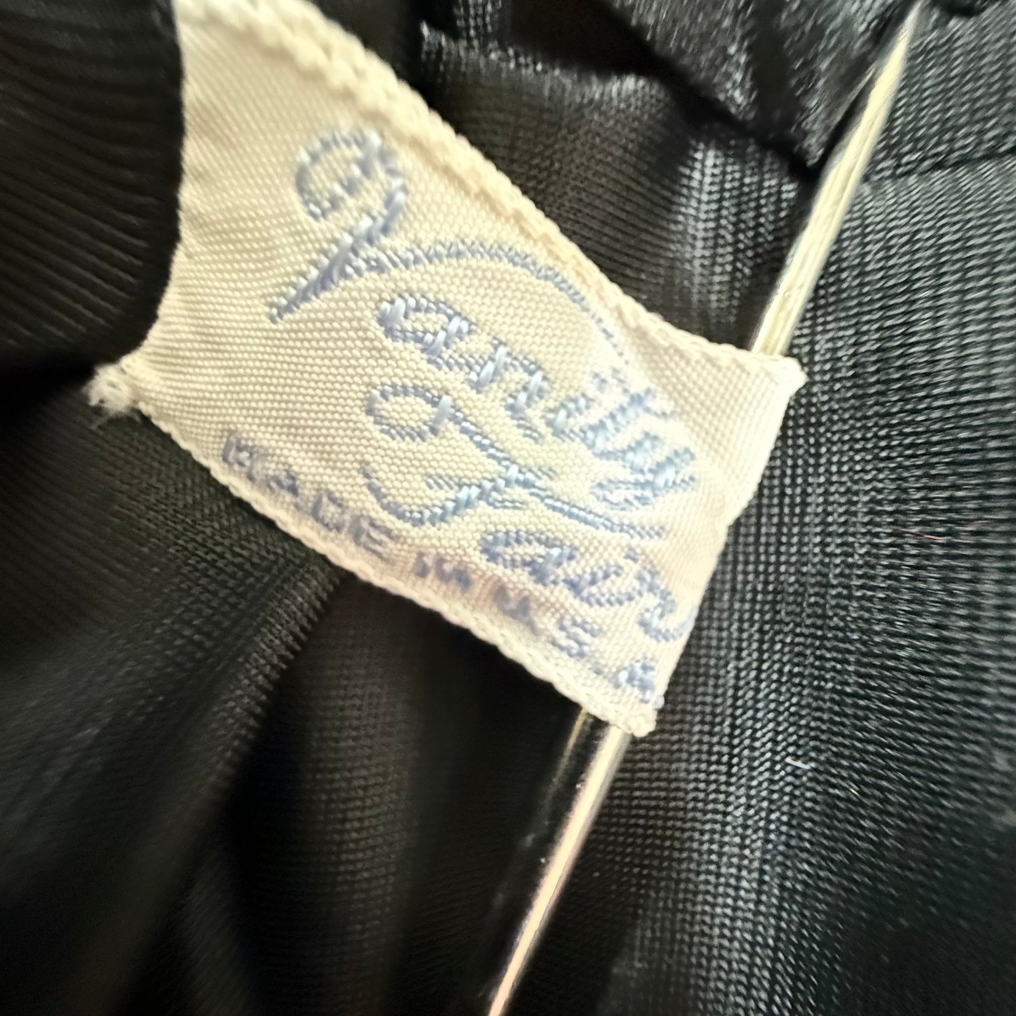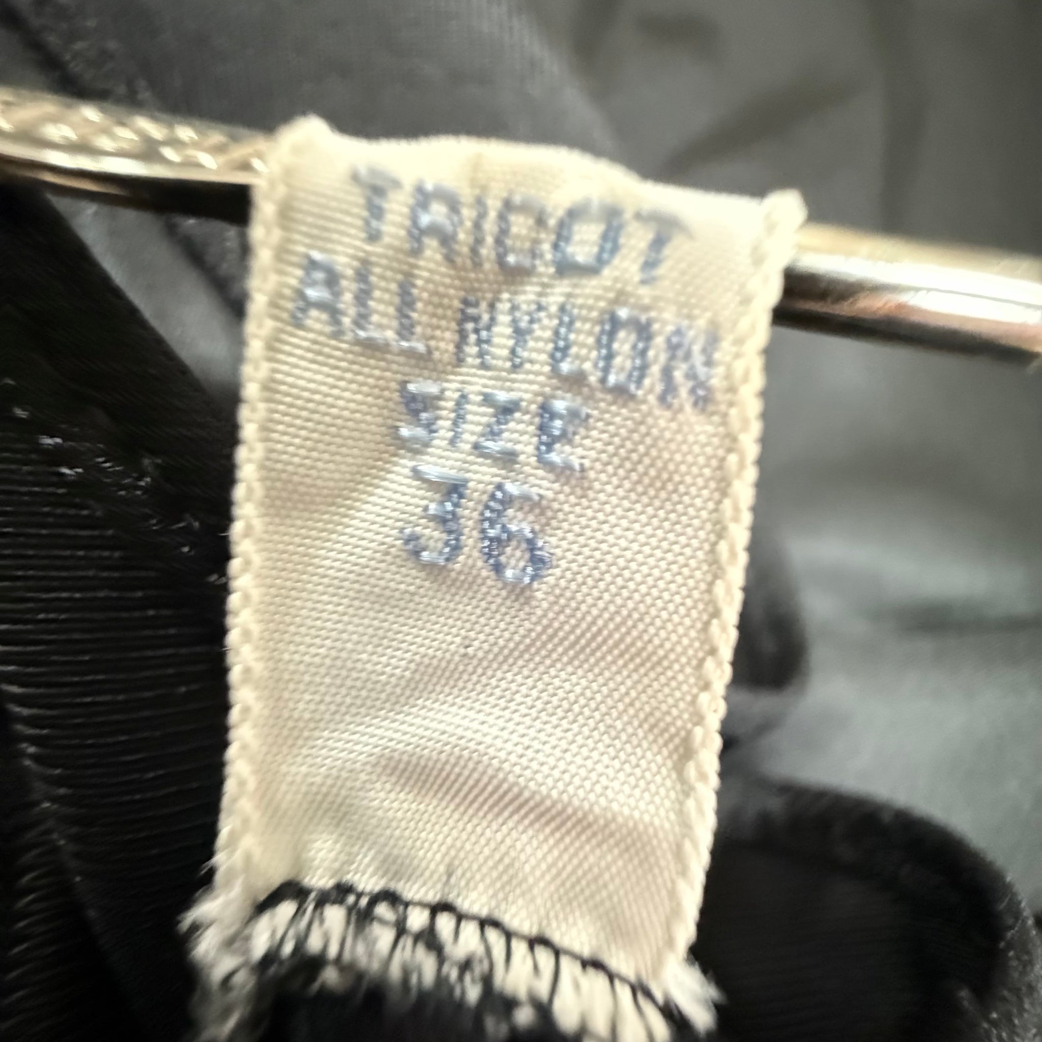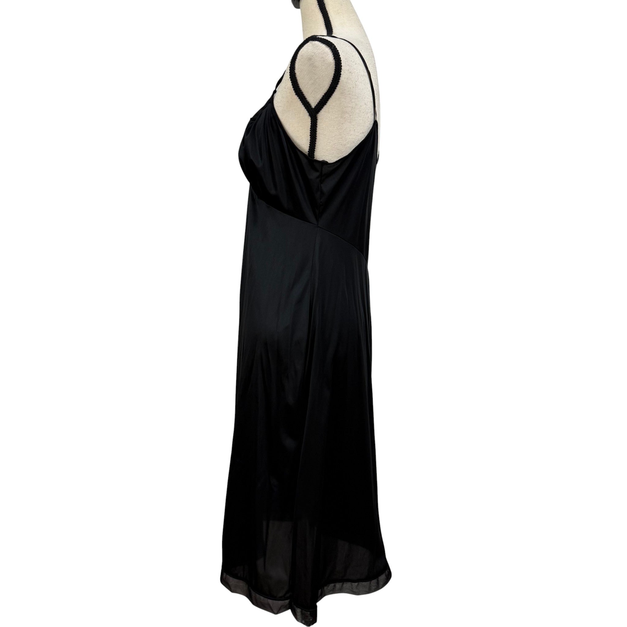 Classic vintage Vanity Fair full slip in elegant black nylon with a sweetheart neckline and sheer mesh accent. Adjustable straps, bias-cut fit, and silky drape create a flattering silhouette perfect for layering or loungewear. Made in the USA.