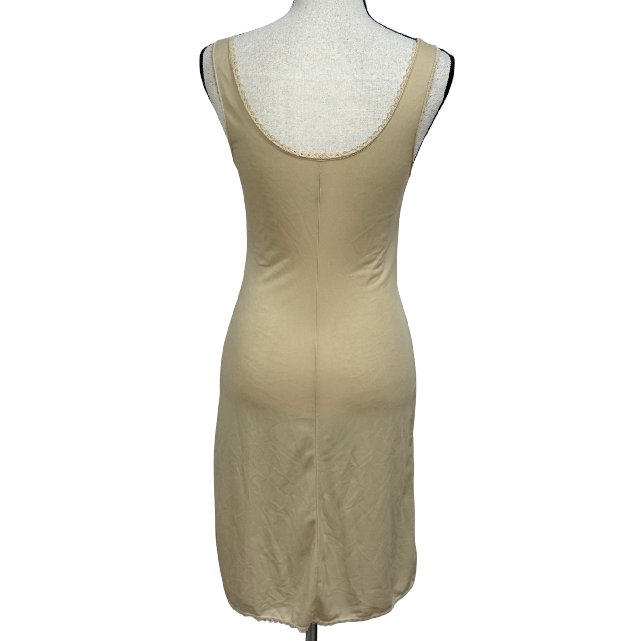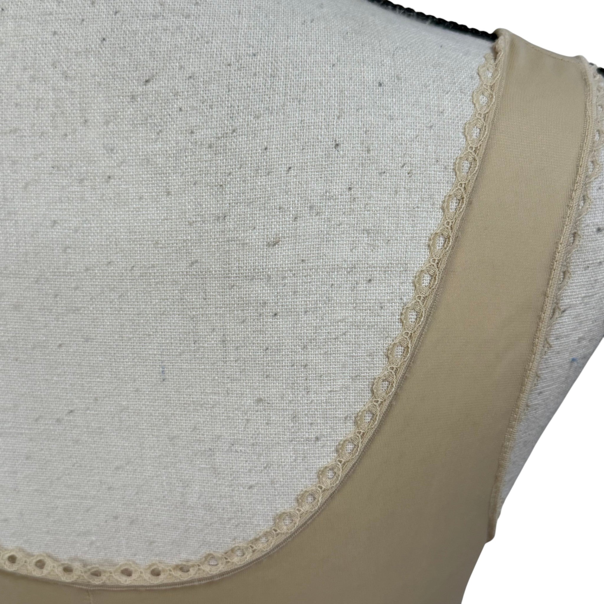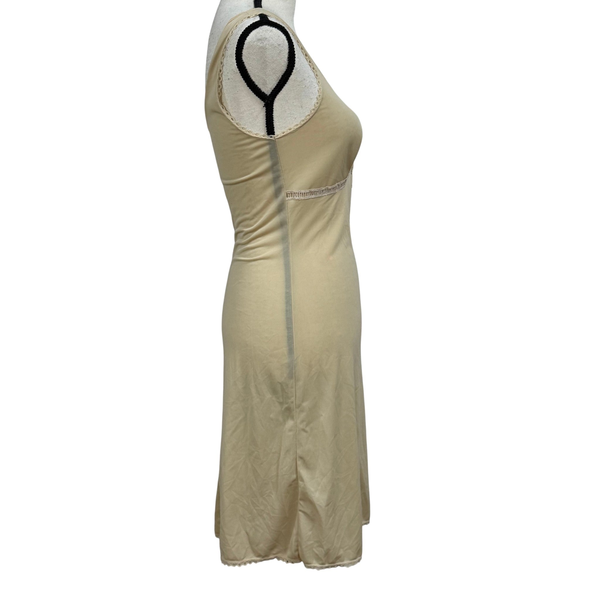 Elegant vintage 1980s Italian slip dress by Manifattura Andra, crafted in a soft, silky nylon fabric with stretch for a smooth, body-skimming fit. This classic neutral beige piece features delicate embroidered floral lace insets at the bust, scalloped lace trim along the neckline and hem, and a gently shaped silhouette that flatters the figure.