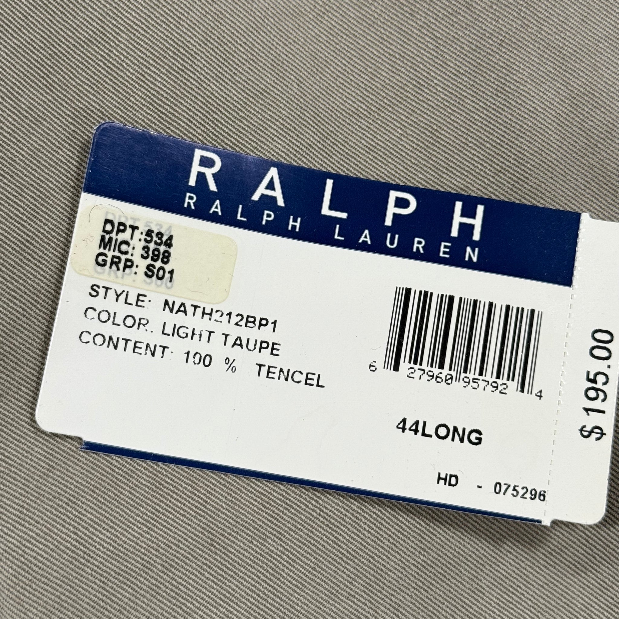 VTG Ralph Lauren Sportcoat Blazer Light Taupe 44 Long - Elegant Ralph Lauren blazer in light taupe 100% Tencel – a luxe, breathable fiber with a soft drape and subtle sheen. Fully lined with classic notch lapel, two-button front, and four-button cuffs. Original $195 retail tag still attached. Deadstock vintage. Small mark on sleeve (untreated) noted for accuracy.