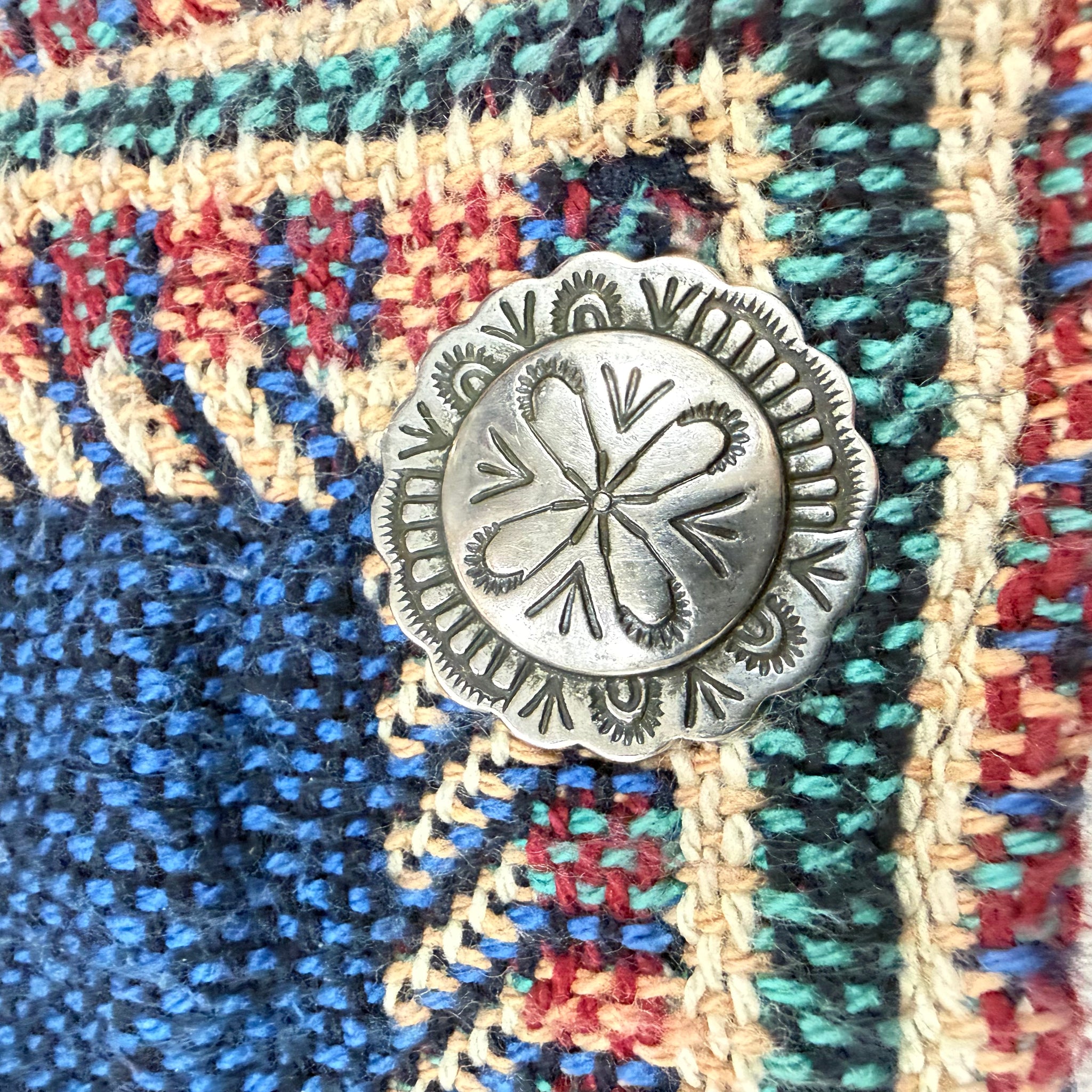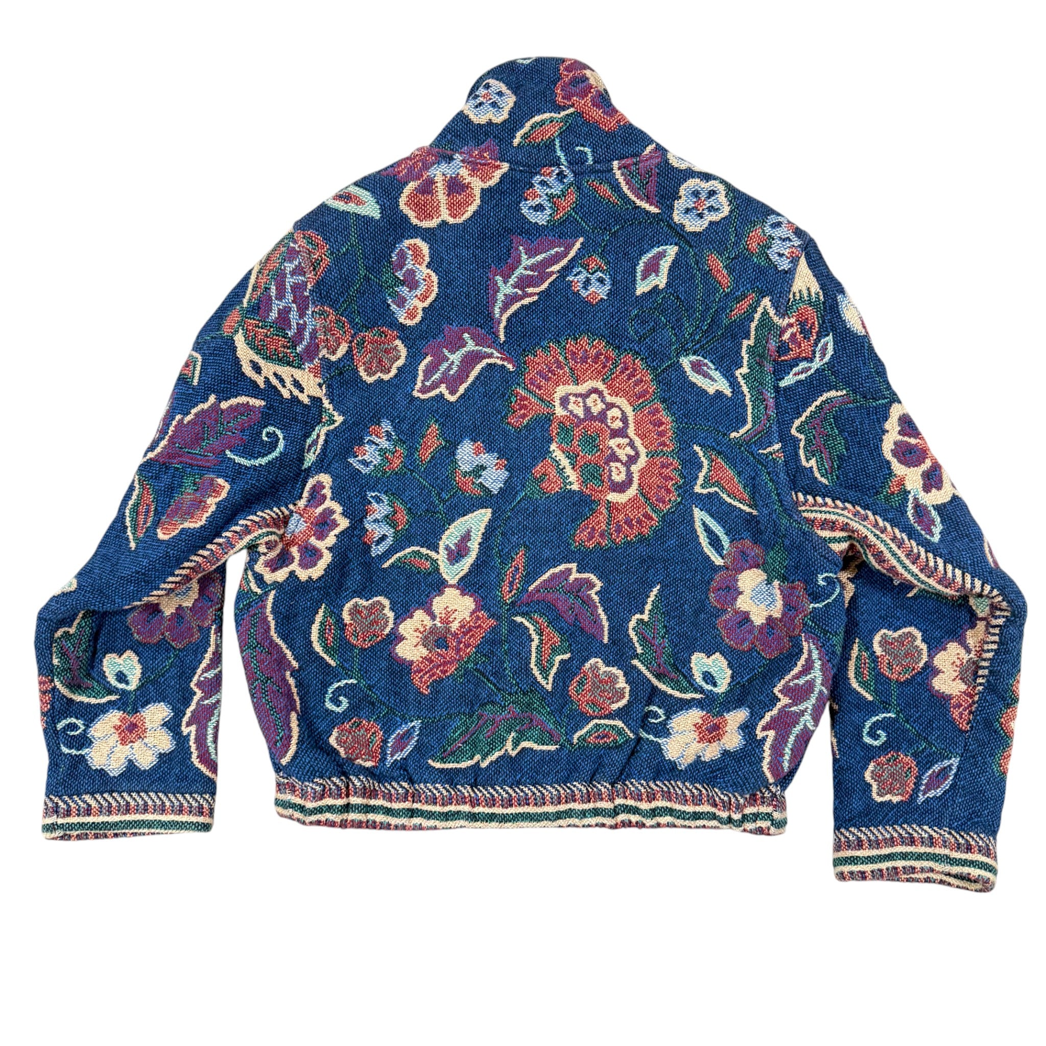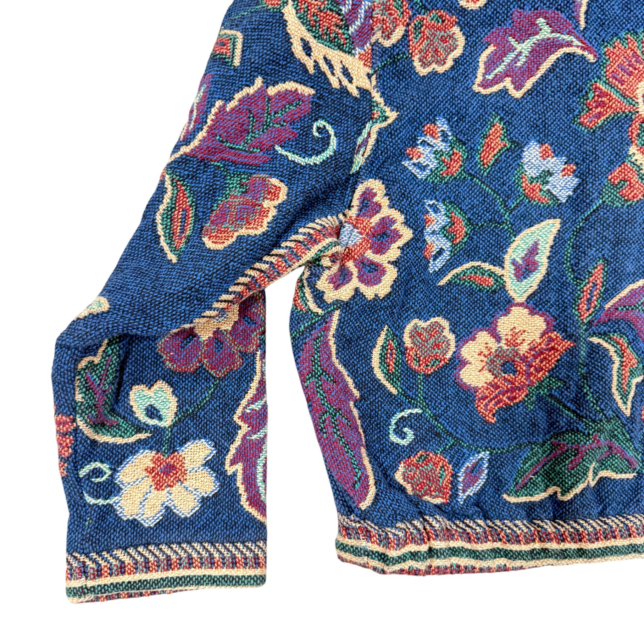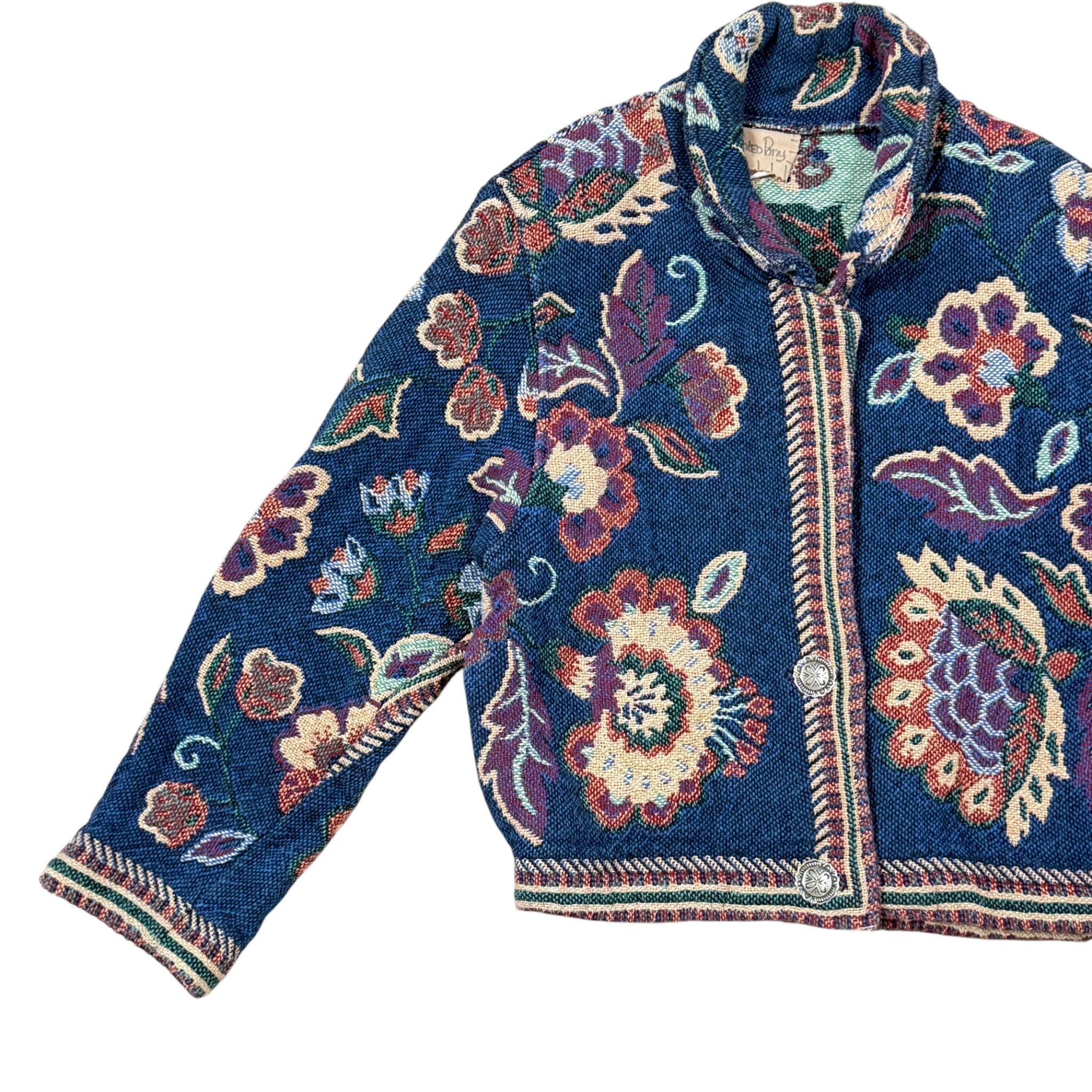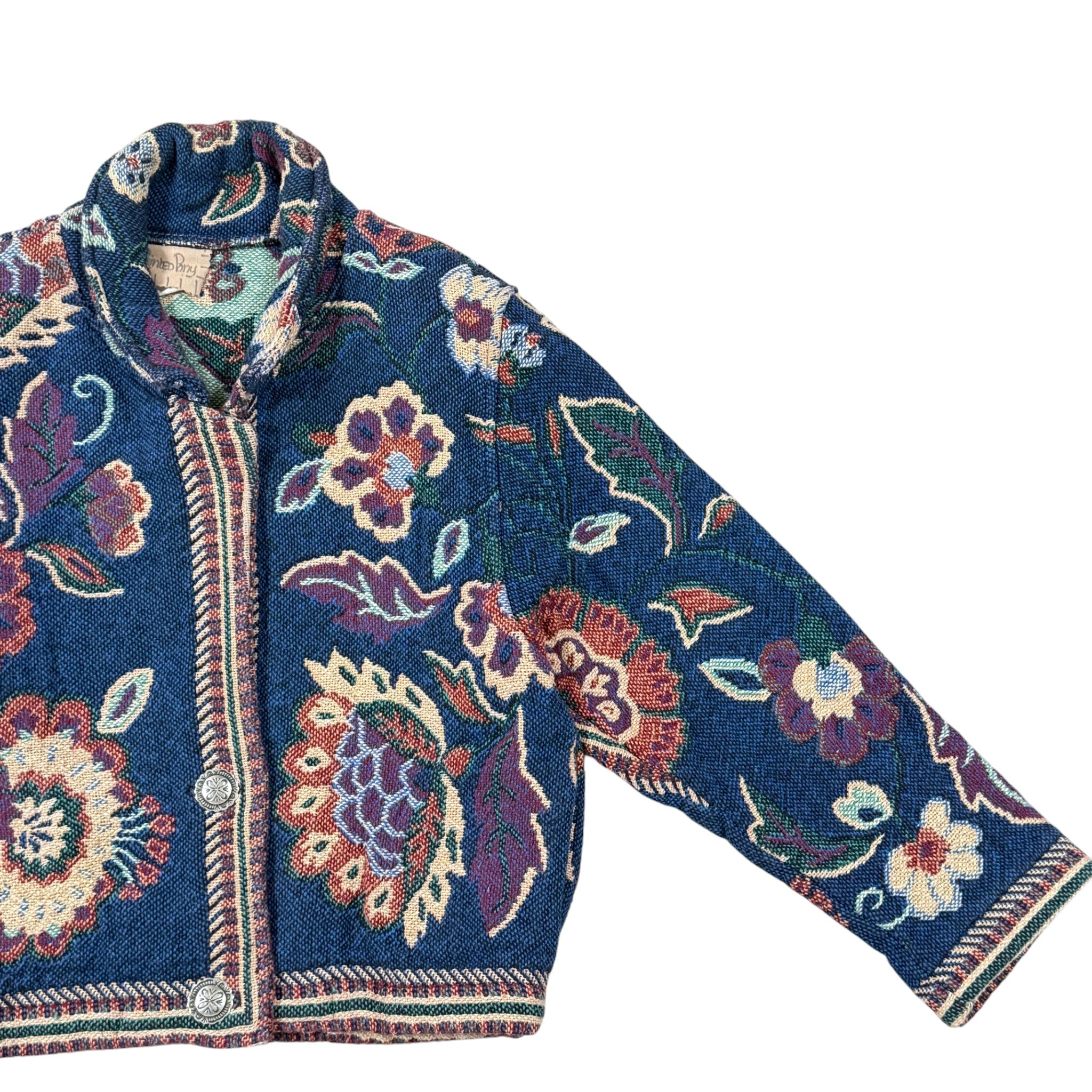 Vintage woven tapestry jacket featuring an allover floral motif in deep navy, teal, burgundy, and cream tones. Cropped silhouette with structured shoulders, decorative Conchol-Style buttons, and richly textured fabric. A standout boho cottagecore piece with strong 90s artwear and folk aesthetic.