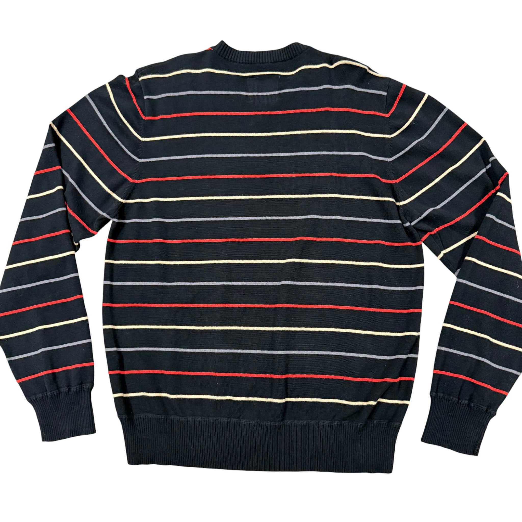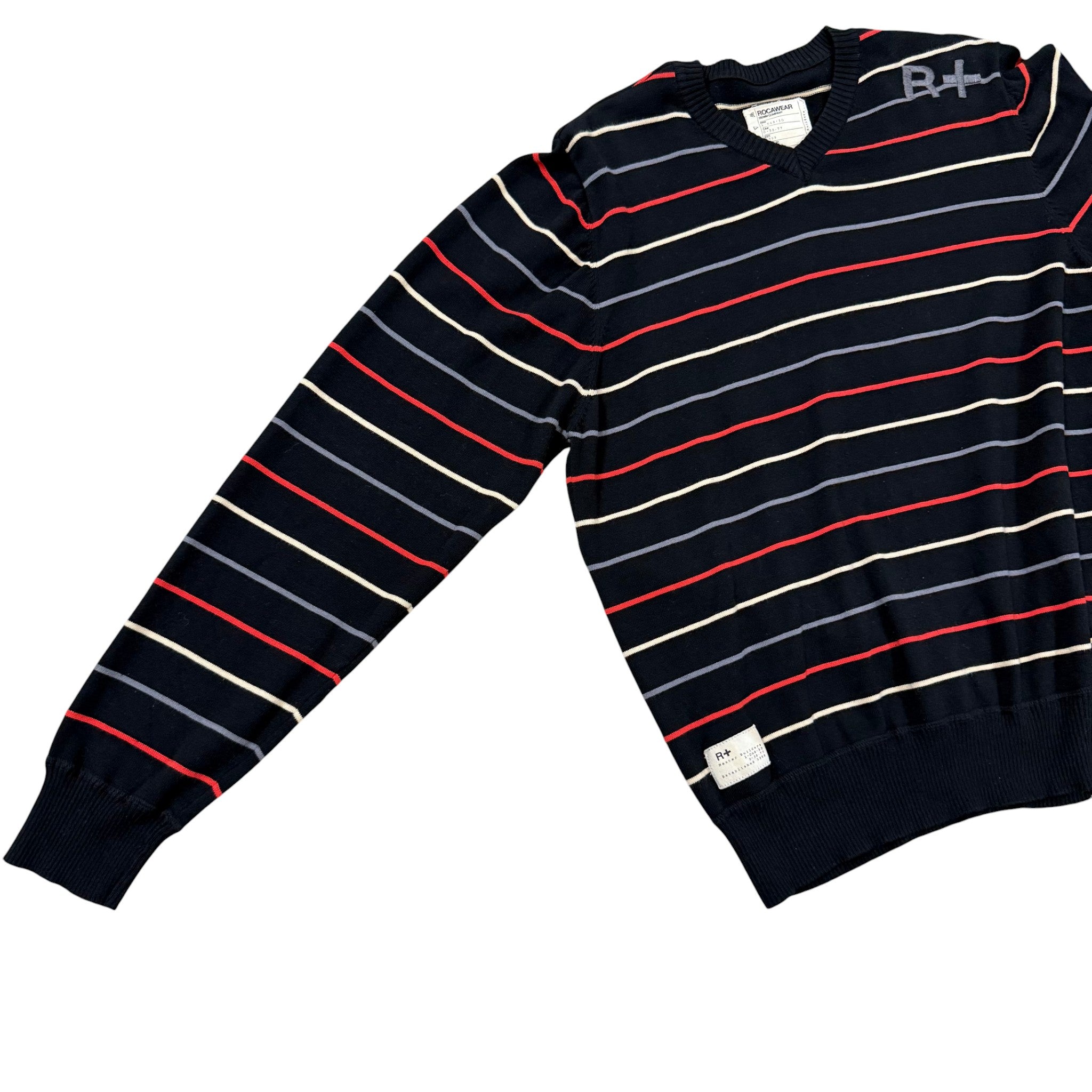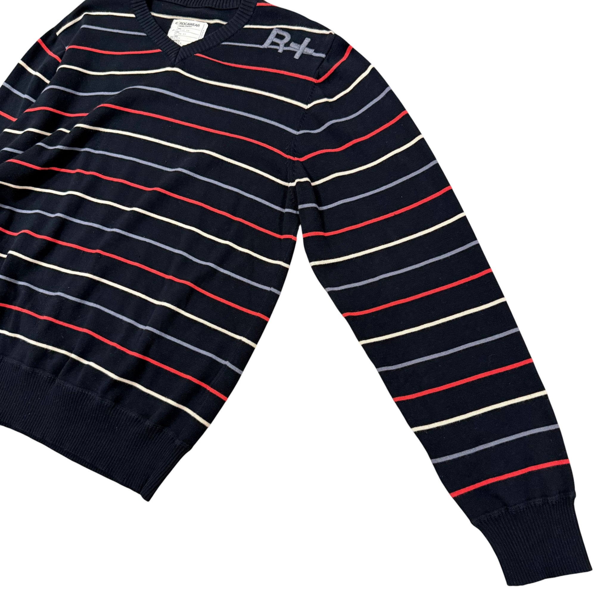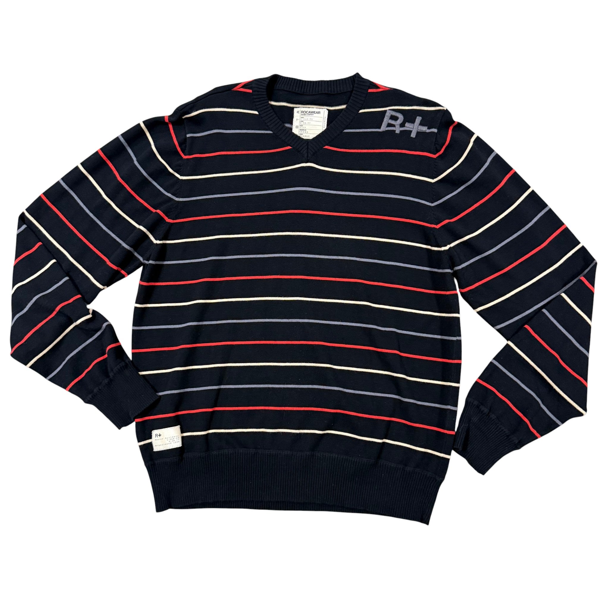 Early 2000s Rocawear black striped V-neck sweater with red, cream, and gray horizontal striping and embroidered R+ logo at chest. Ribbed cuffs and hem. 100% cotton. Machine washable. Made in China. Early 2000s Y2K hip-hop streetwear era piece.