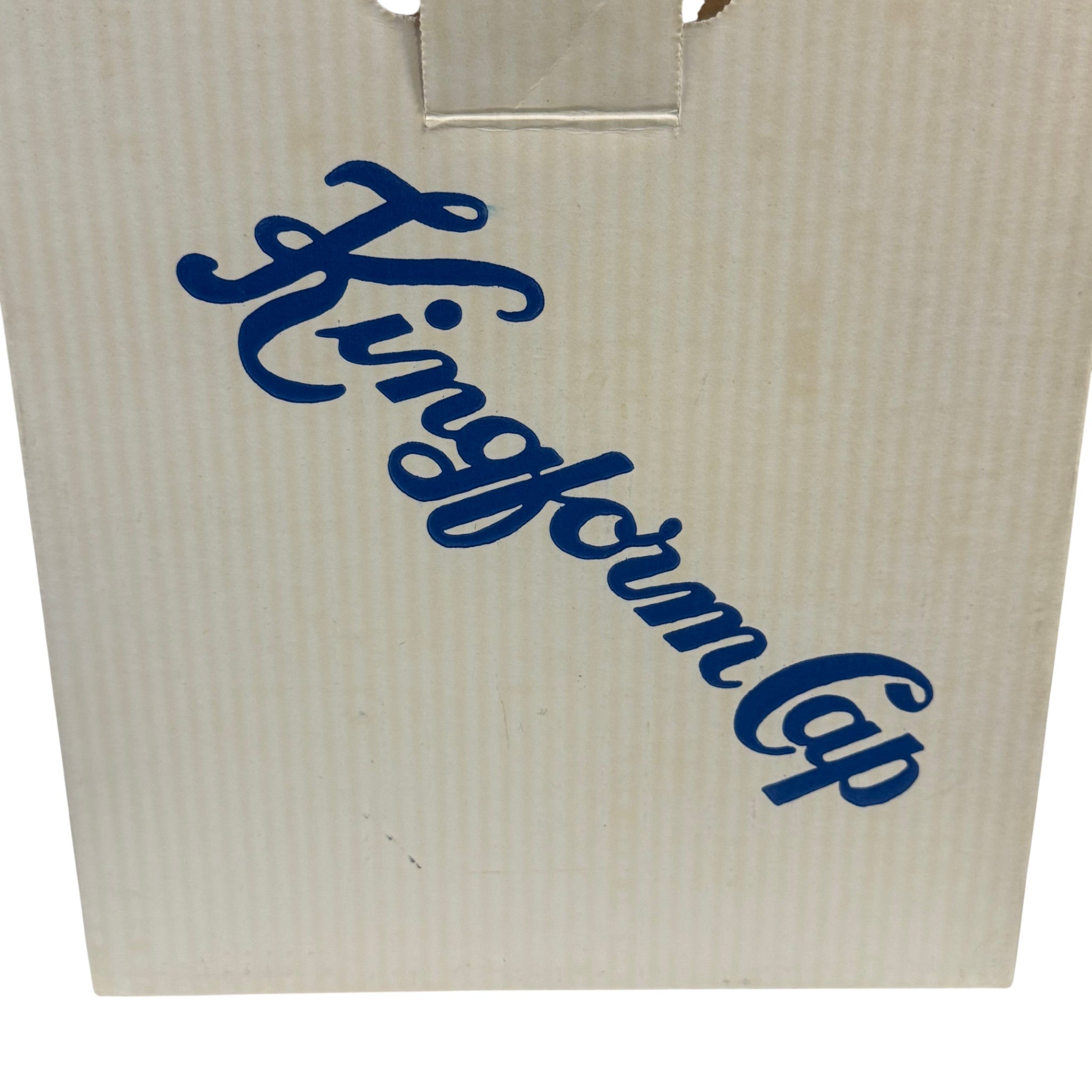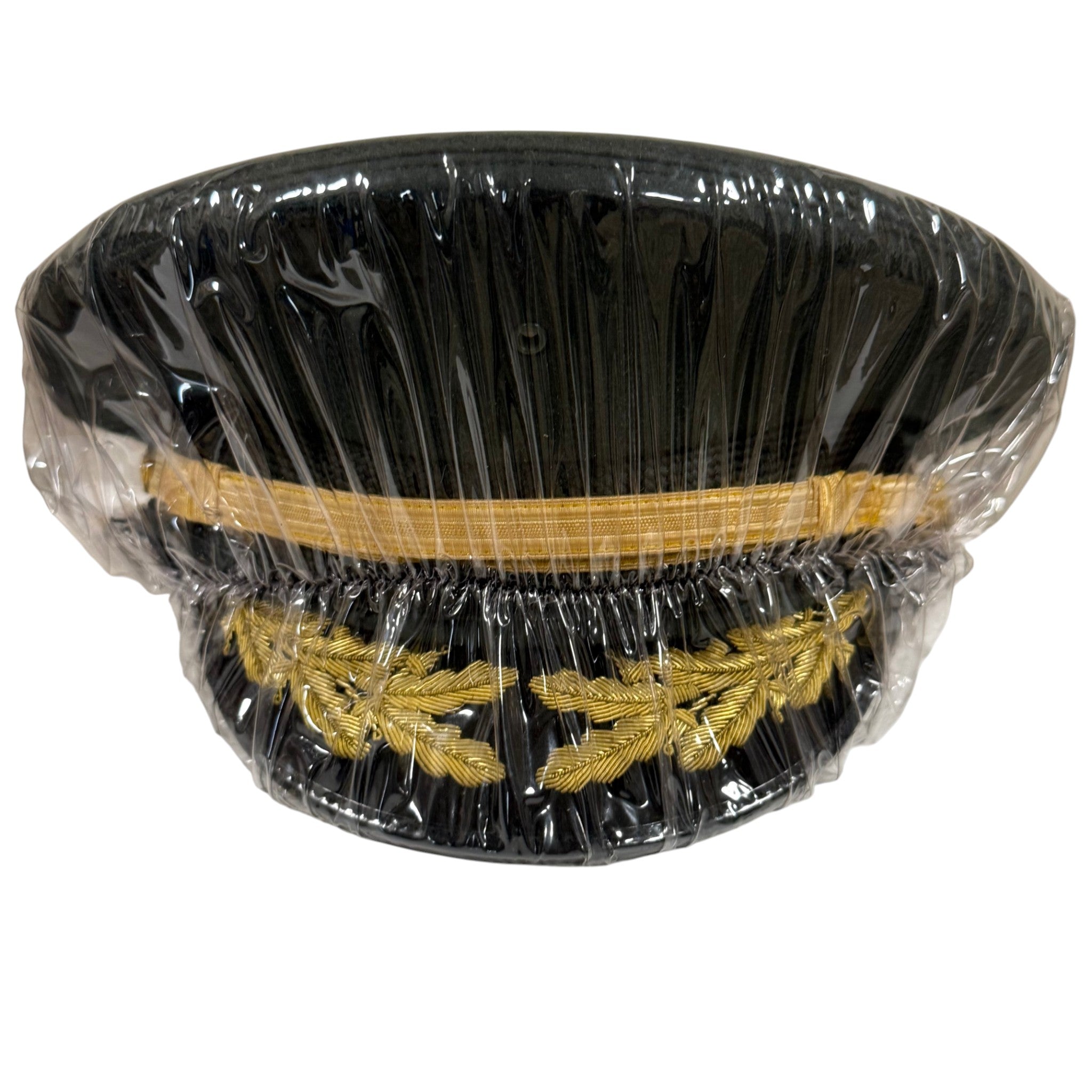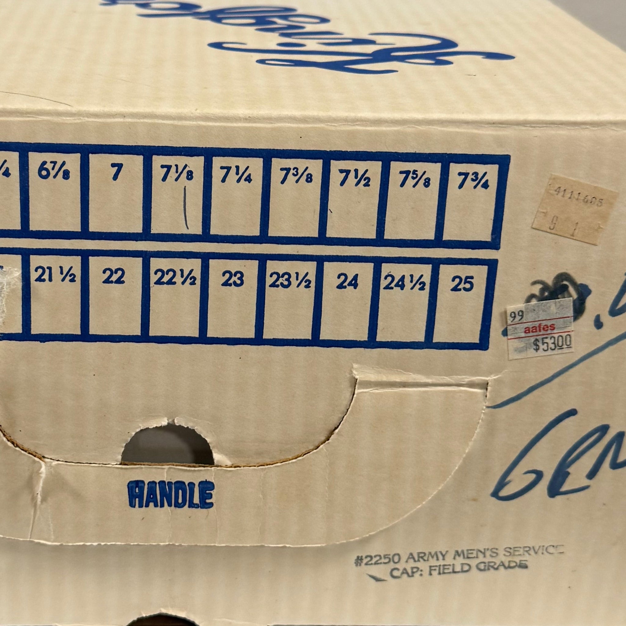 Vintage Kingform Army men’s service field cap in black, complete with original retail box. Features gold embroidered laurel leaf detailing and structured military-style form. The hat appears unused or minimally worn and has been stored protected inside plastic.