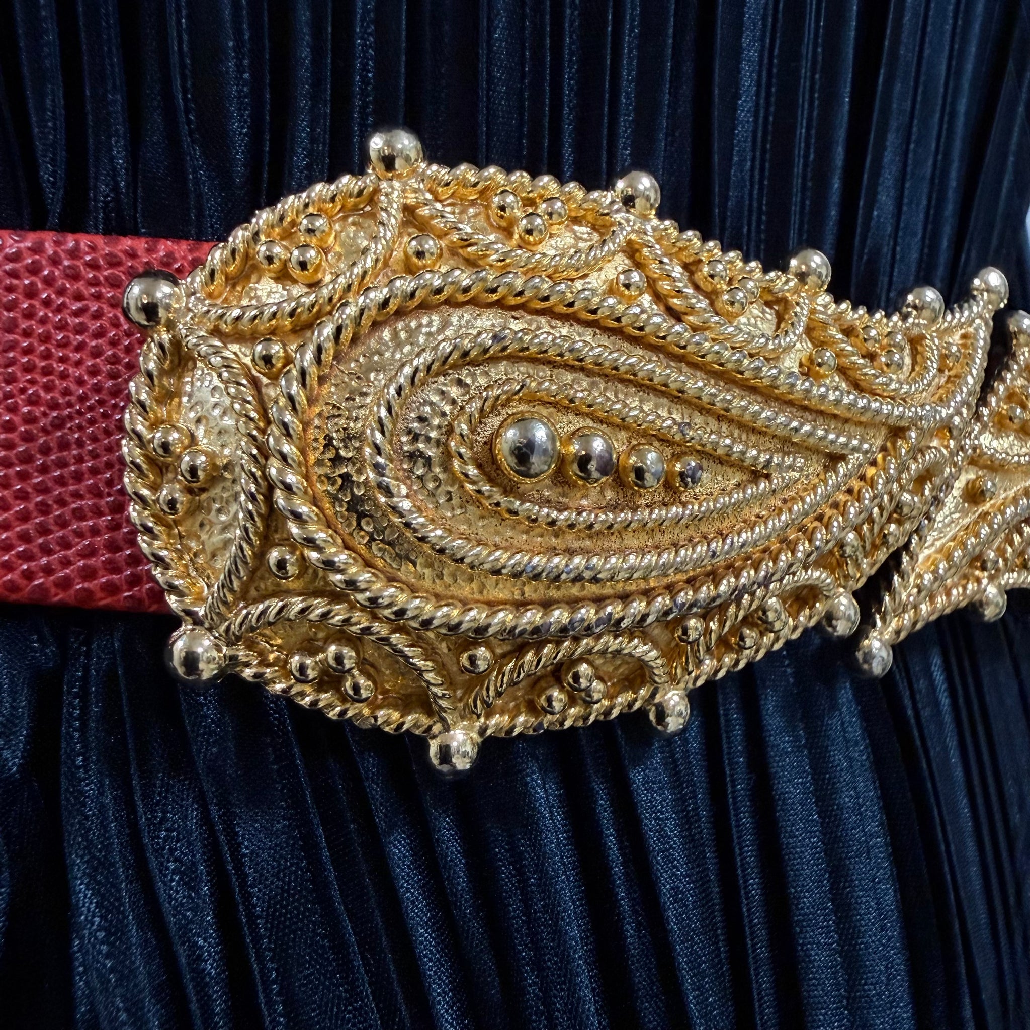 80s Ornate Gold Buckle Red Cinch Belt Size Medium