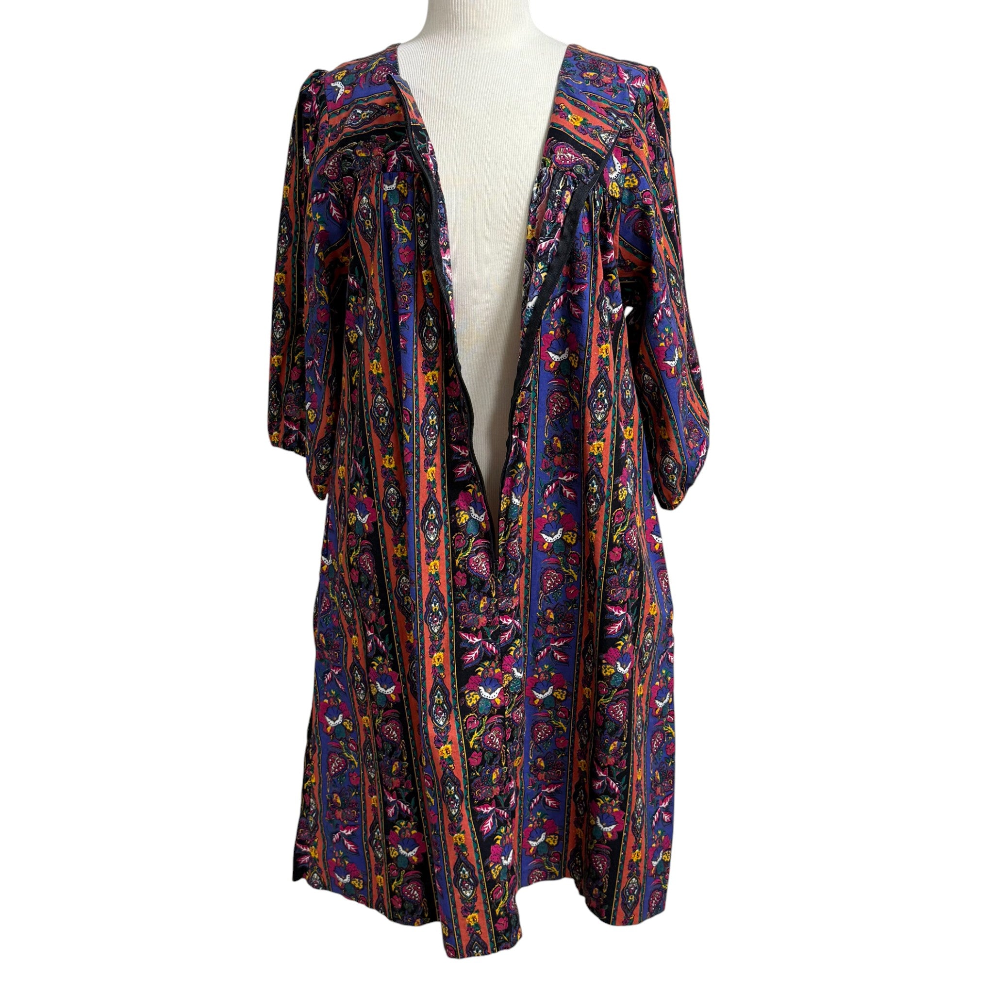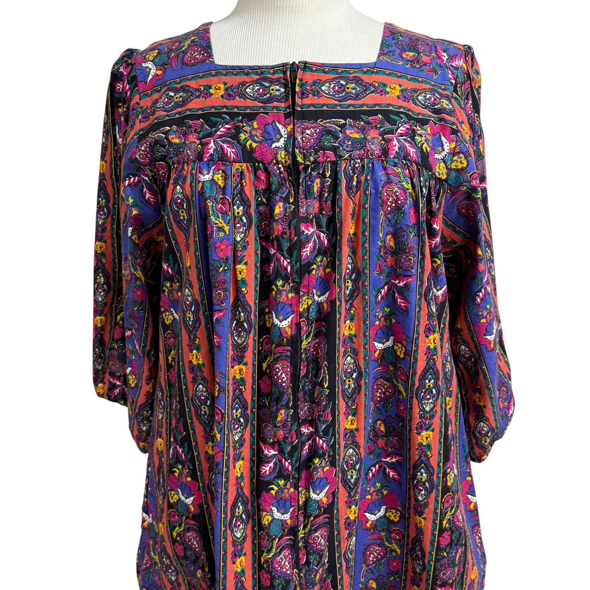 Features a loose, easy fit with 3/4 sleeves and front pleat detail under a squared yoke — reminiscent of Indian block print caftans popular in the 80s. Made from breathable 100% cotton for comfort and drape.