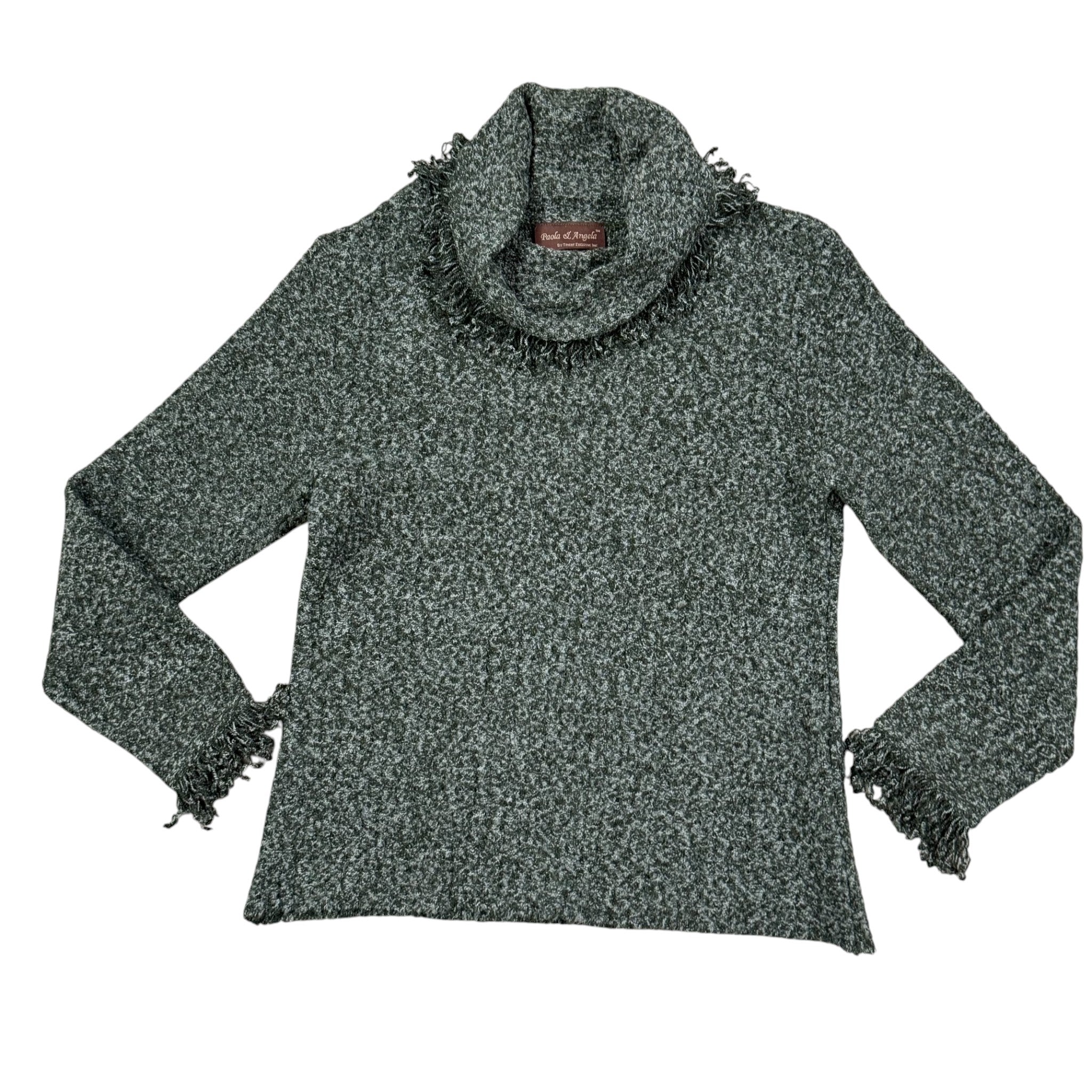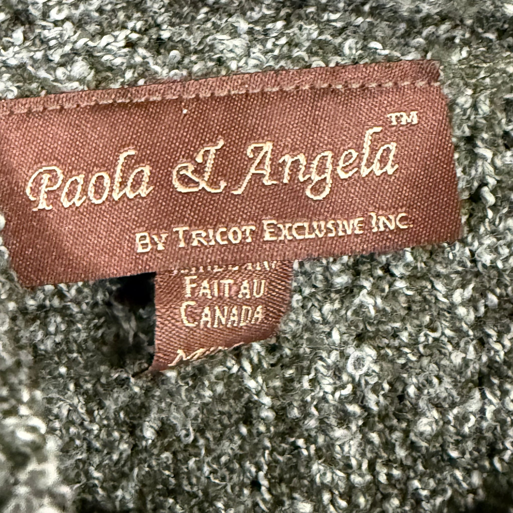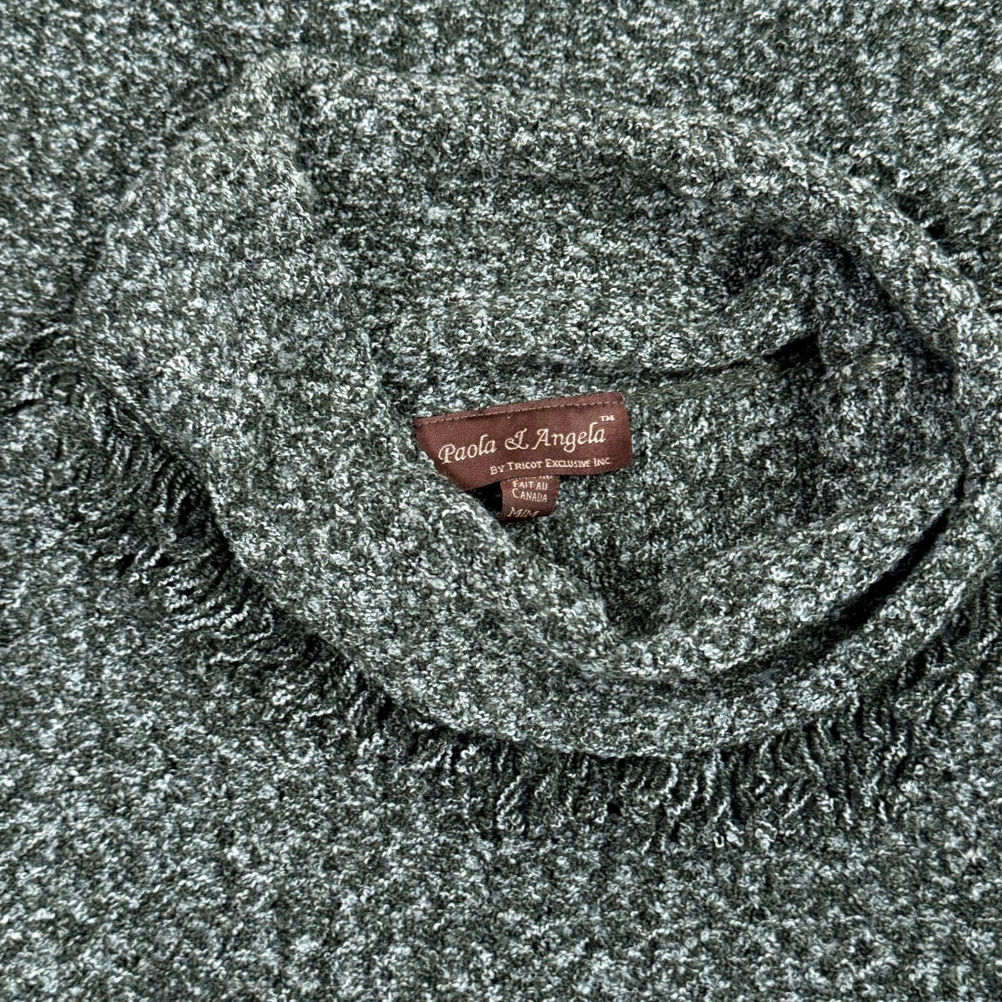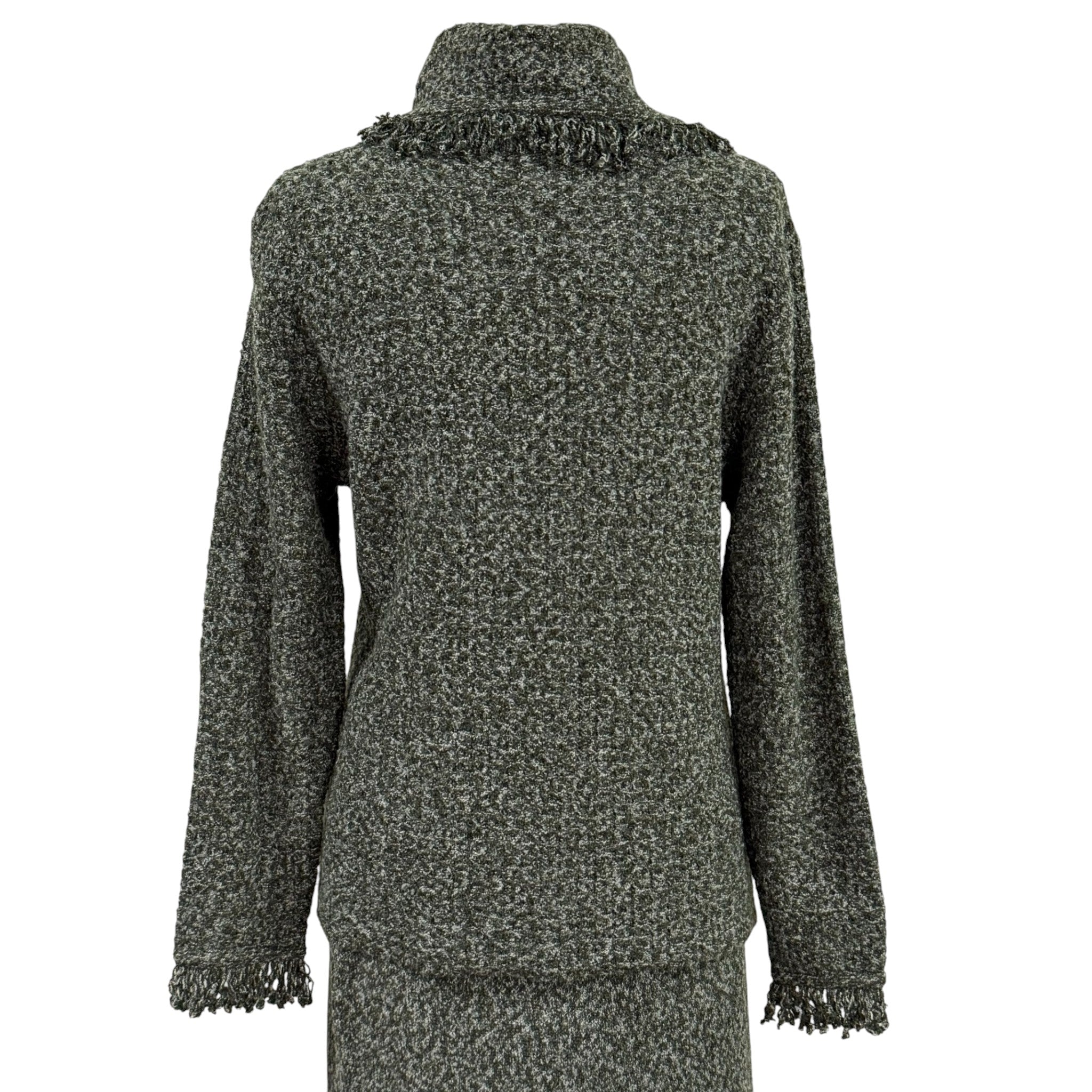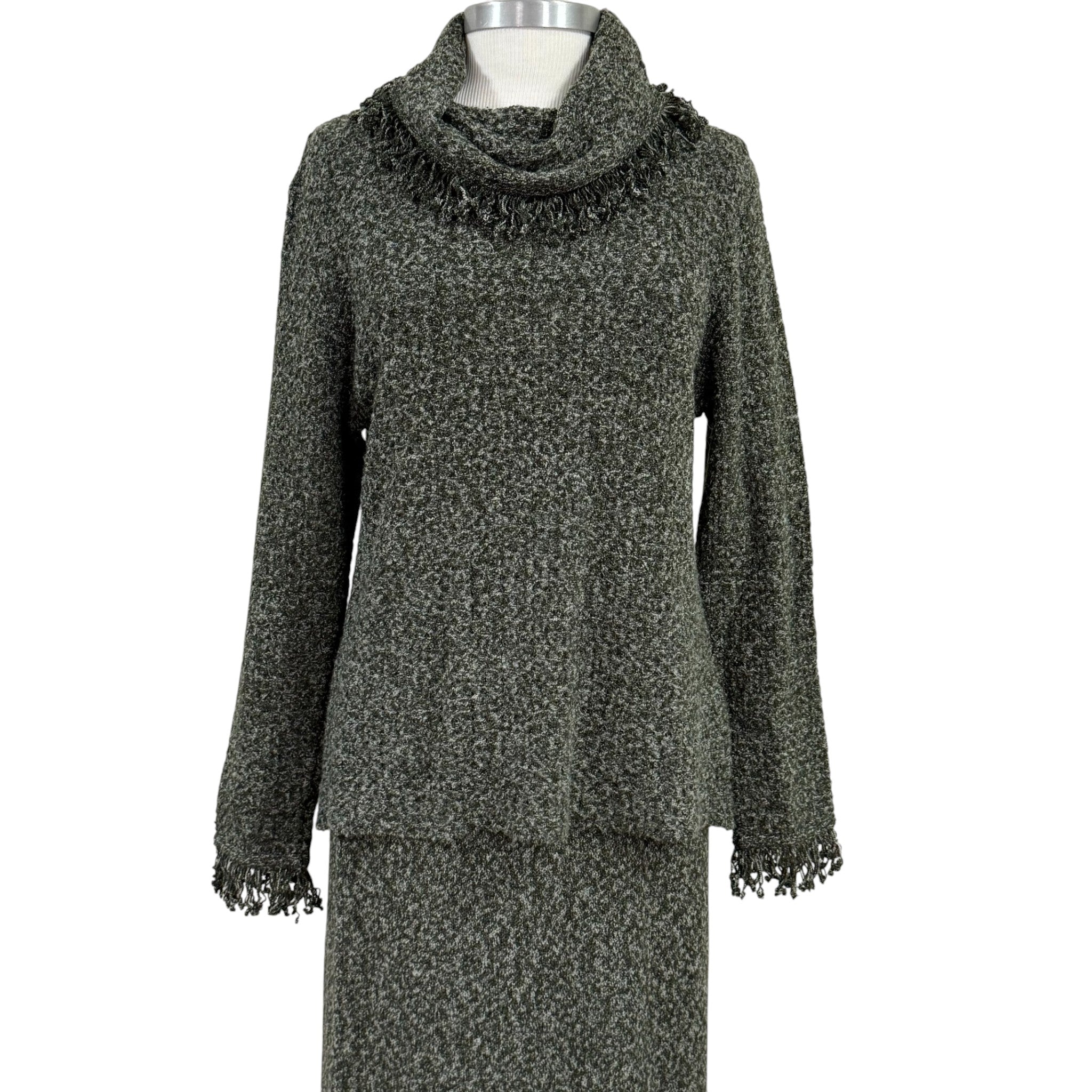 Vintage 90s two-piece knit set by Paola & Angela, made in Canada. Includes a soft boucle wool-blend cowl-neck sweater with fringe detail and a matching long straight skirt. Beautiful textured knit with a cozy, minimalist silhouette. High-quality Canadian construction typical of 90s boutique knitwear. Perfect for fall/winter styling.