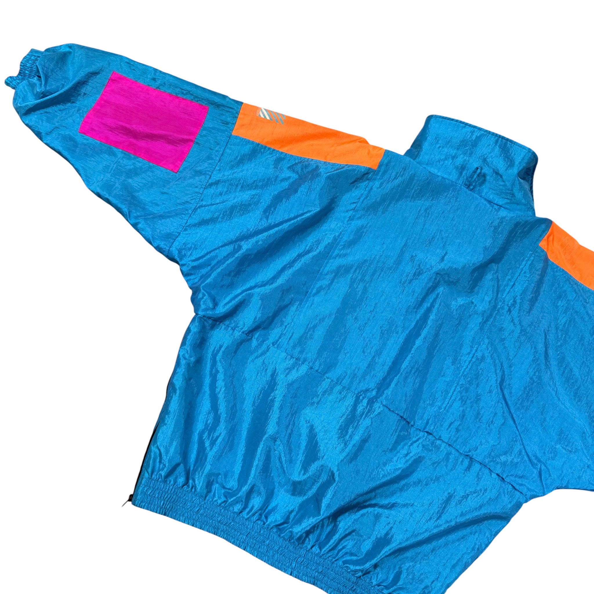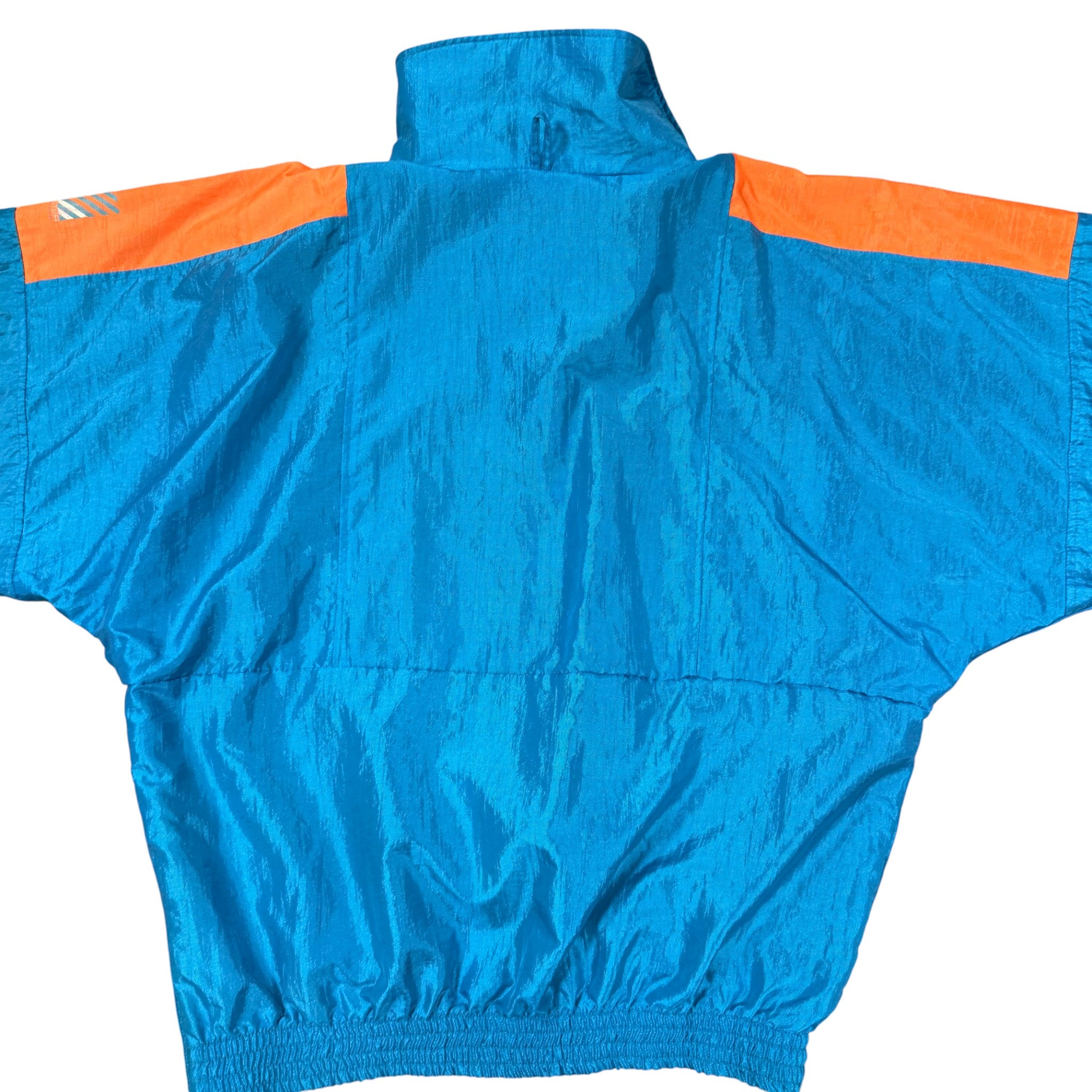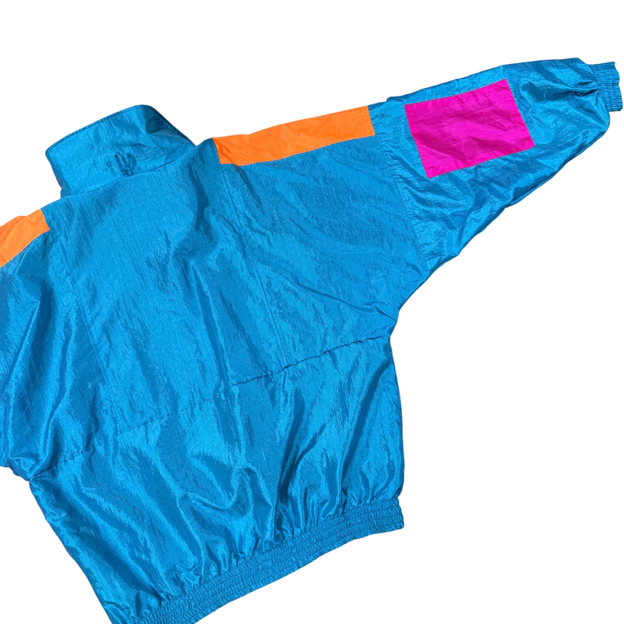 80s Colorblock Pullover Ski Jacket XL -Authentic retro ski pullover by Sunbuster, made in Korea. Features iconic 80s color-blocking in teal, hot pink, and orange with quarter-zip closure, snap button placket, elastic cuffs and waistband, and front kangaroo with zip pockets. Oversized fit with durable nylon shell — the ultimate vintage snow or streetwear piece.
