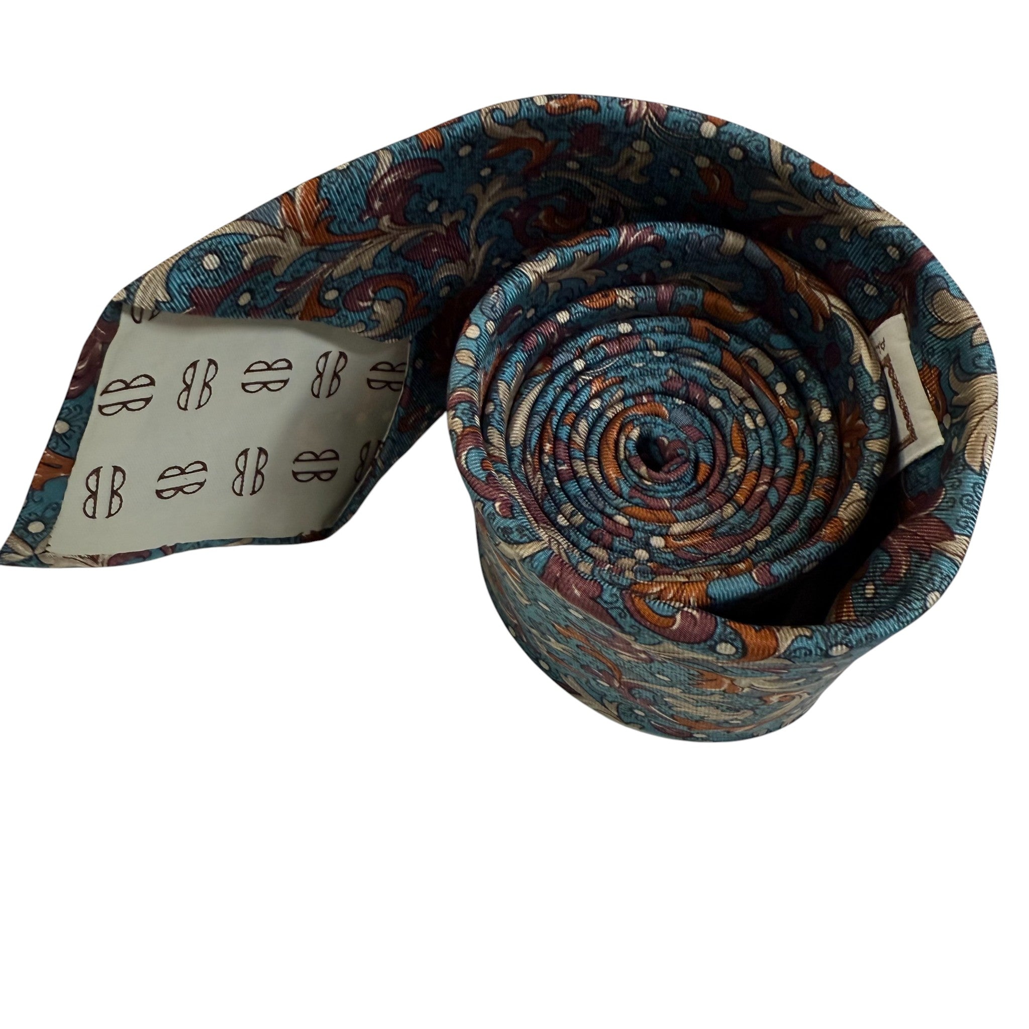 Vintage Bill Blass Signature 100% silk tie featuring an ornate paisley pattern in blue, rust, tan, and burgundy tones. This late-80s/90s classic has a sophisticated all-over floral paisley design with branded “BB” lining. Soft drape, luxurious hand, and timeless menswear styling. A great addition for collectors or elevated office wear.