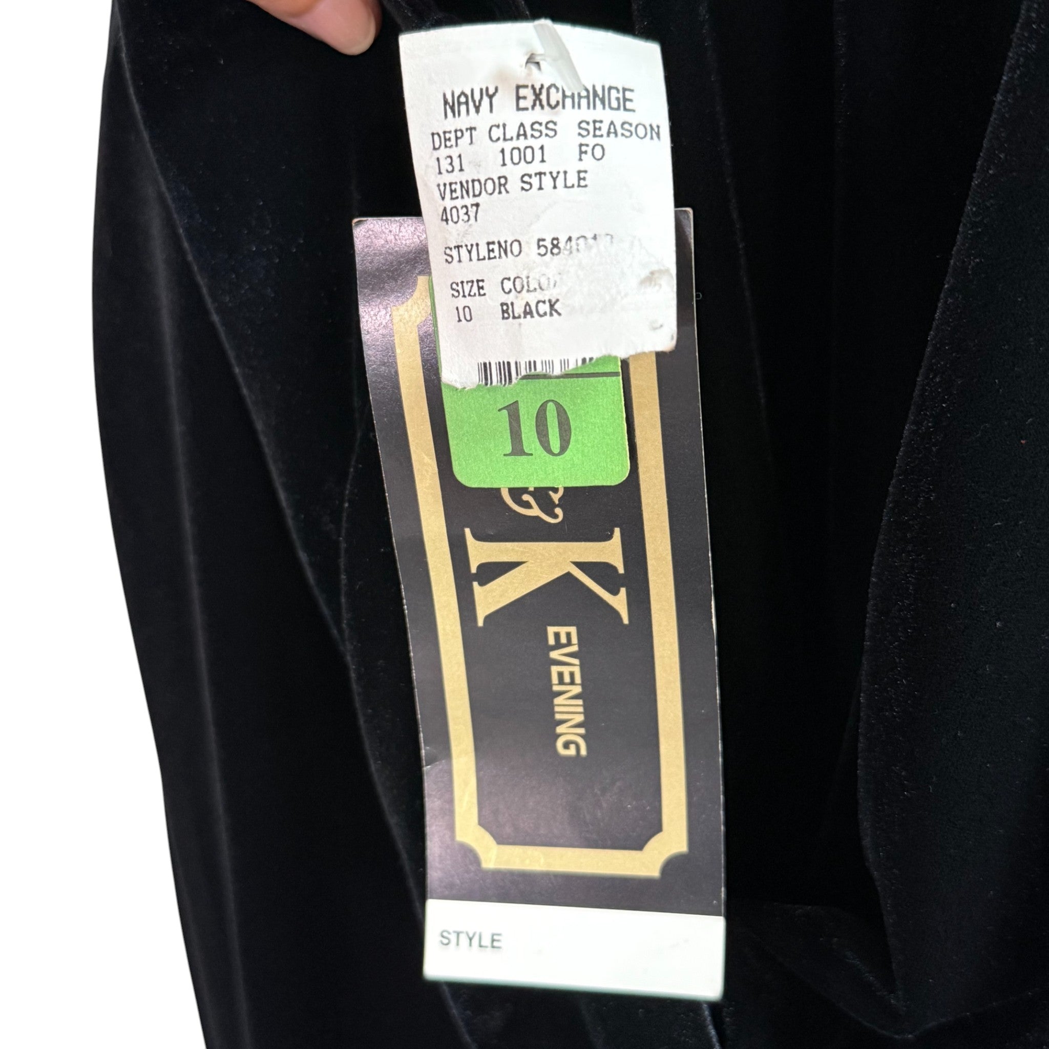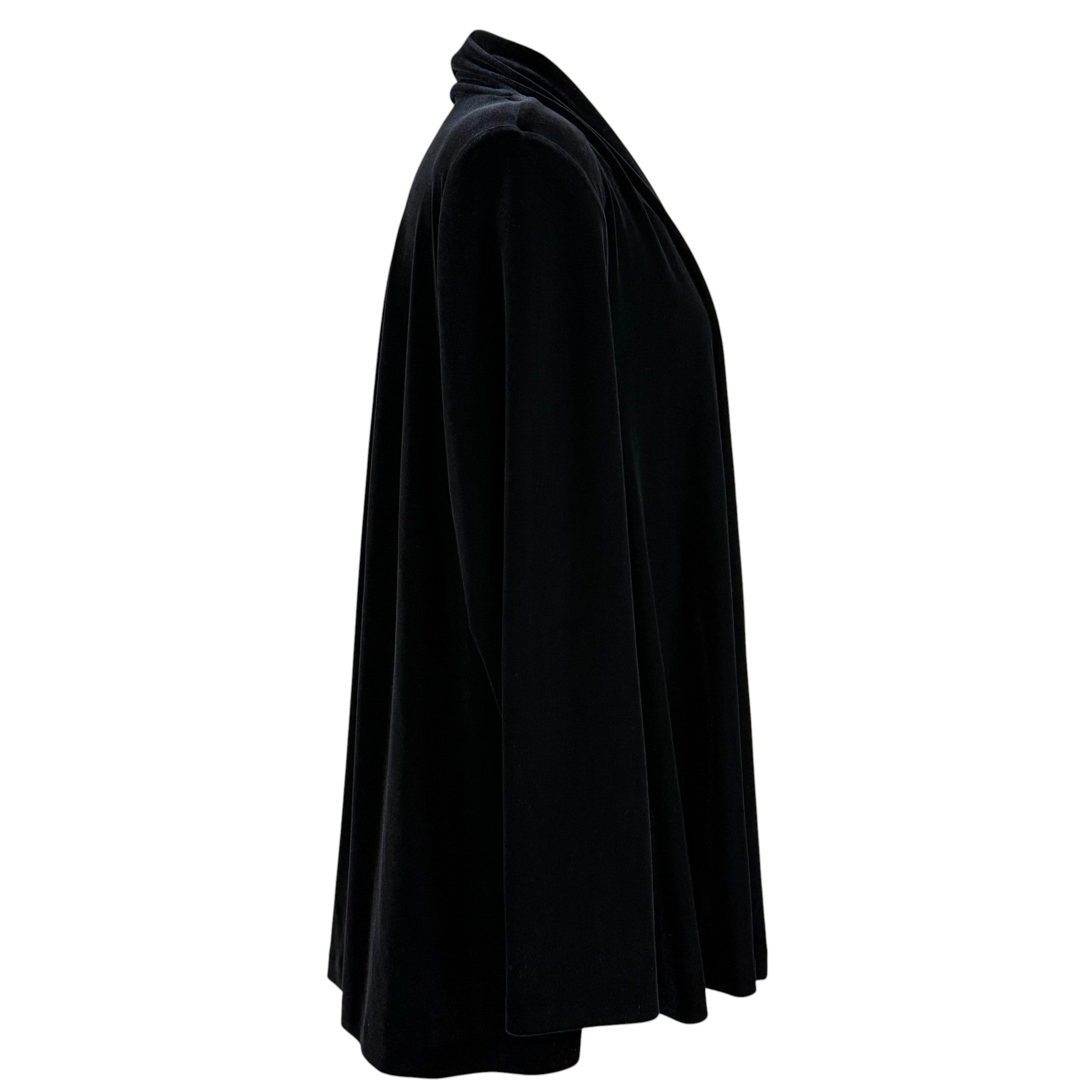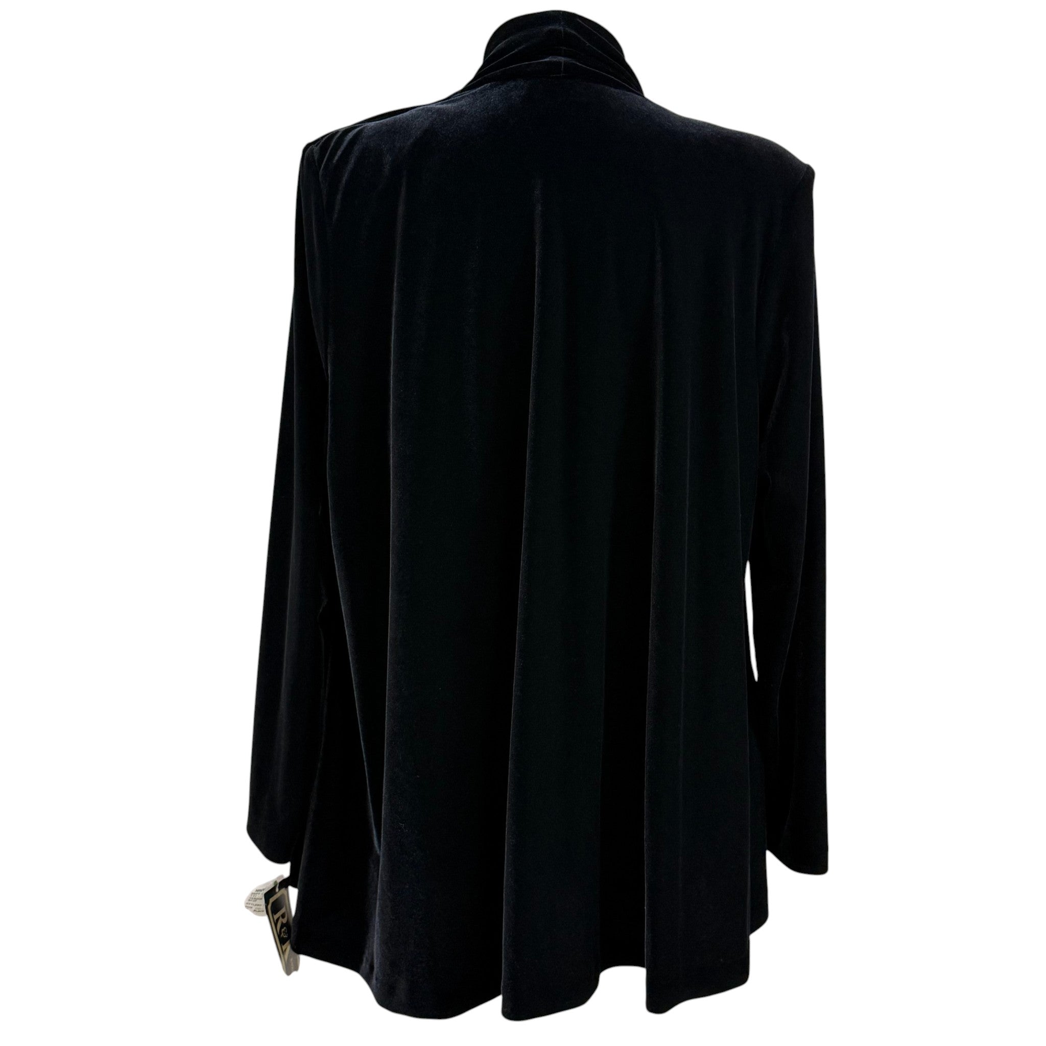Elegant late 90s/early 2000s R&K Evening open-front velvet sweater jacket in rich velvet black. This drapey piece has a luxe, fluid silhouette perfect for cocktail attire, holiday events, or formal evenings. Made of soft, plush velvet with no closures for a clean, waterfall effect. Comes new with original Navy Exchange tags, confirming it’s deadstock vintage. This is lightweight and can be used as a sweater.