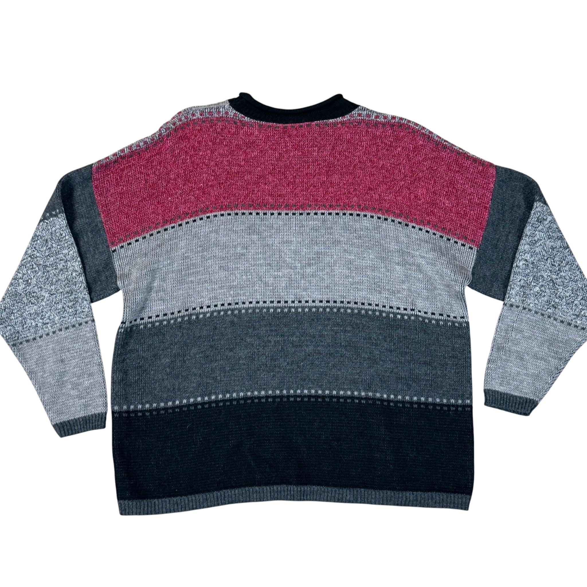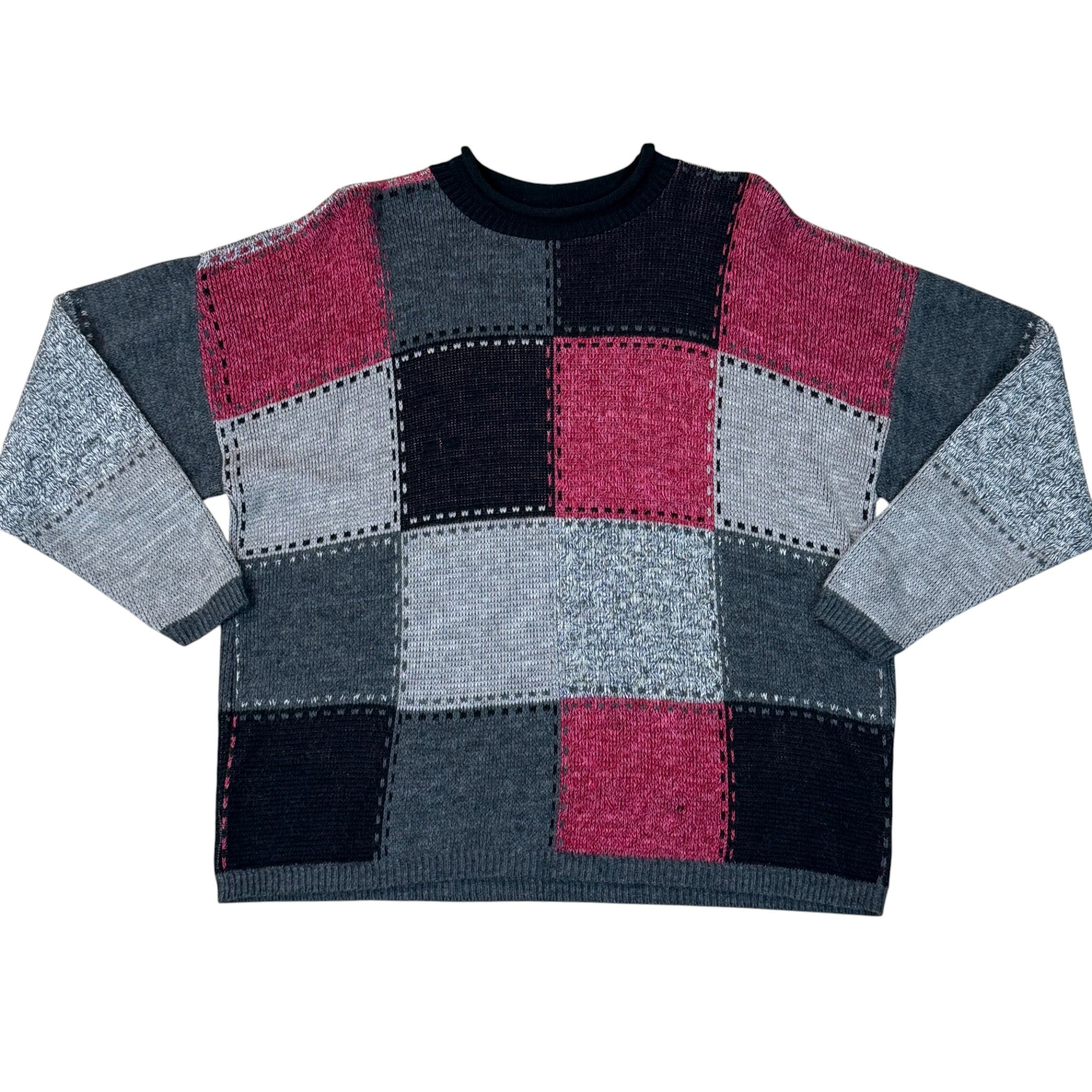 Vintage 1990s Cos Cob patchwork knit sweater featuring a bold block/checkered design in shades of gray, black, and red-ish. Classic oversized 90s fit with ribbed cuffs and hem. Soft knit and great statement piece for colder seasons.