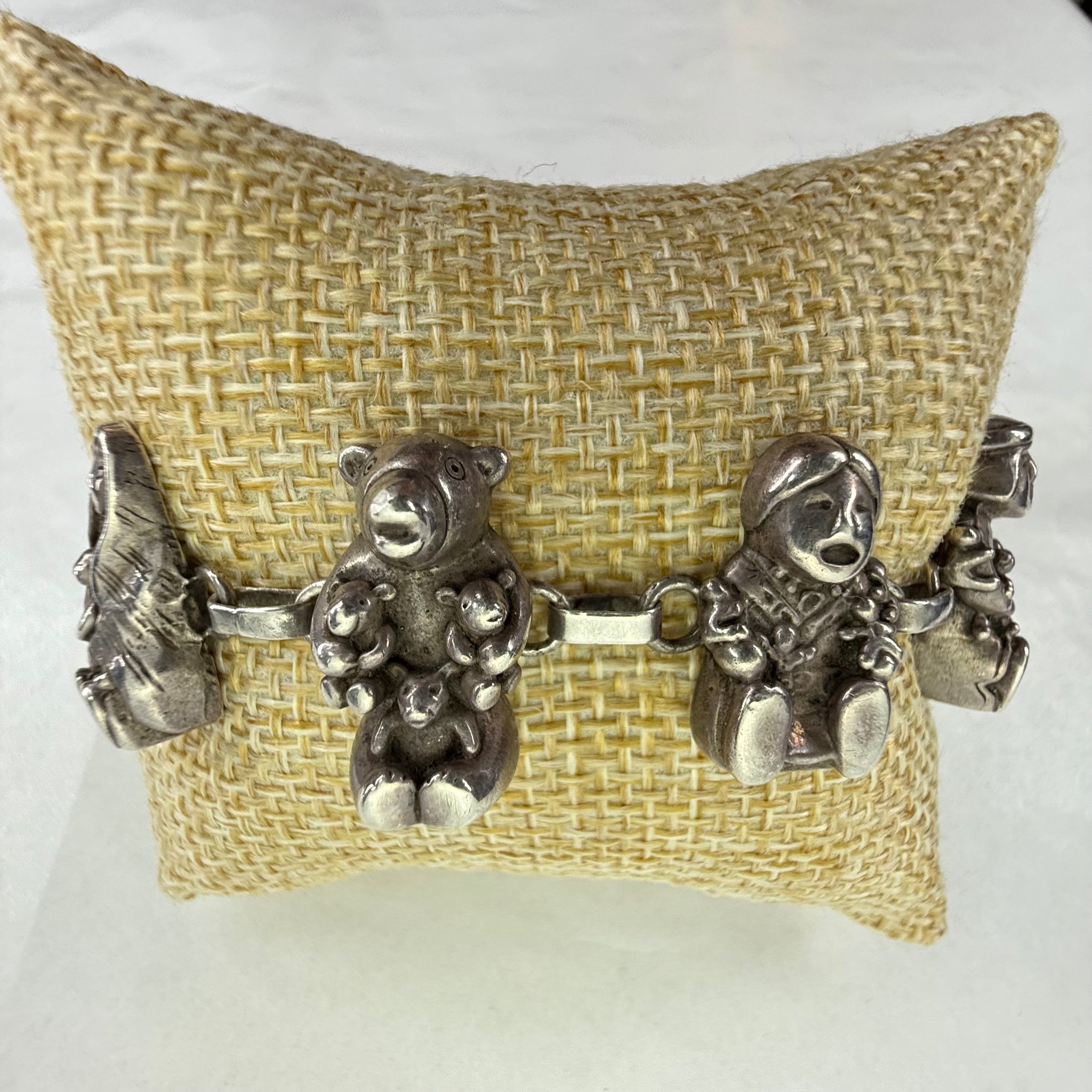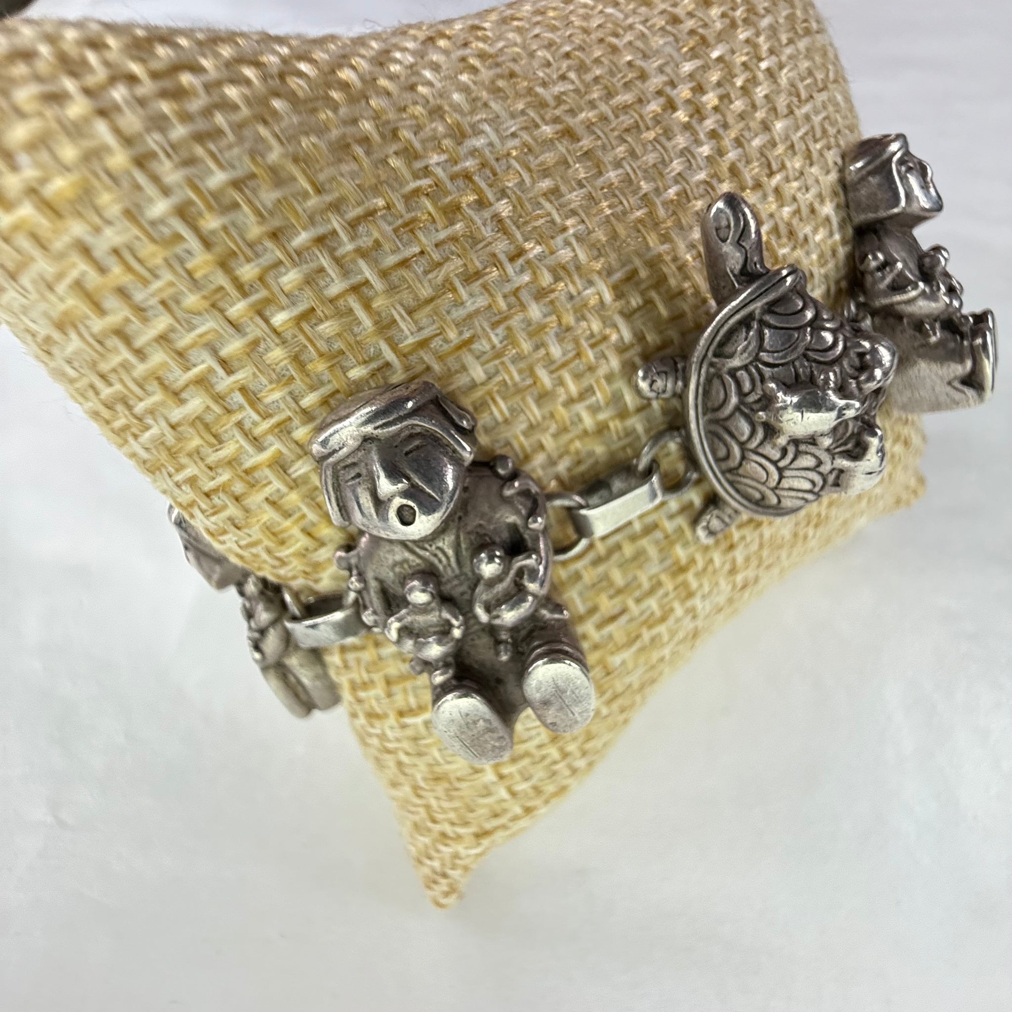 This exceptional vintage sterling silver bracelet by Carol Felley features eight detailed, three-dimensional storyteller figures linked together with a secure lobster clasp. Each figure is stamped © CF 90 STERLING, denoting Felley’s 1990 copyright and her signature maker’s mark.