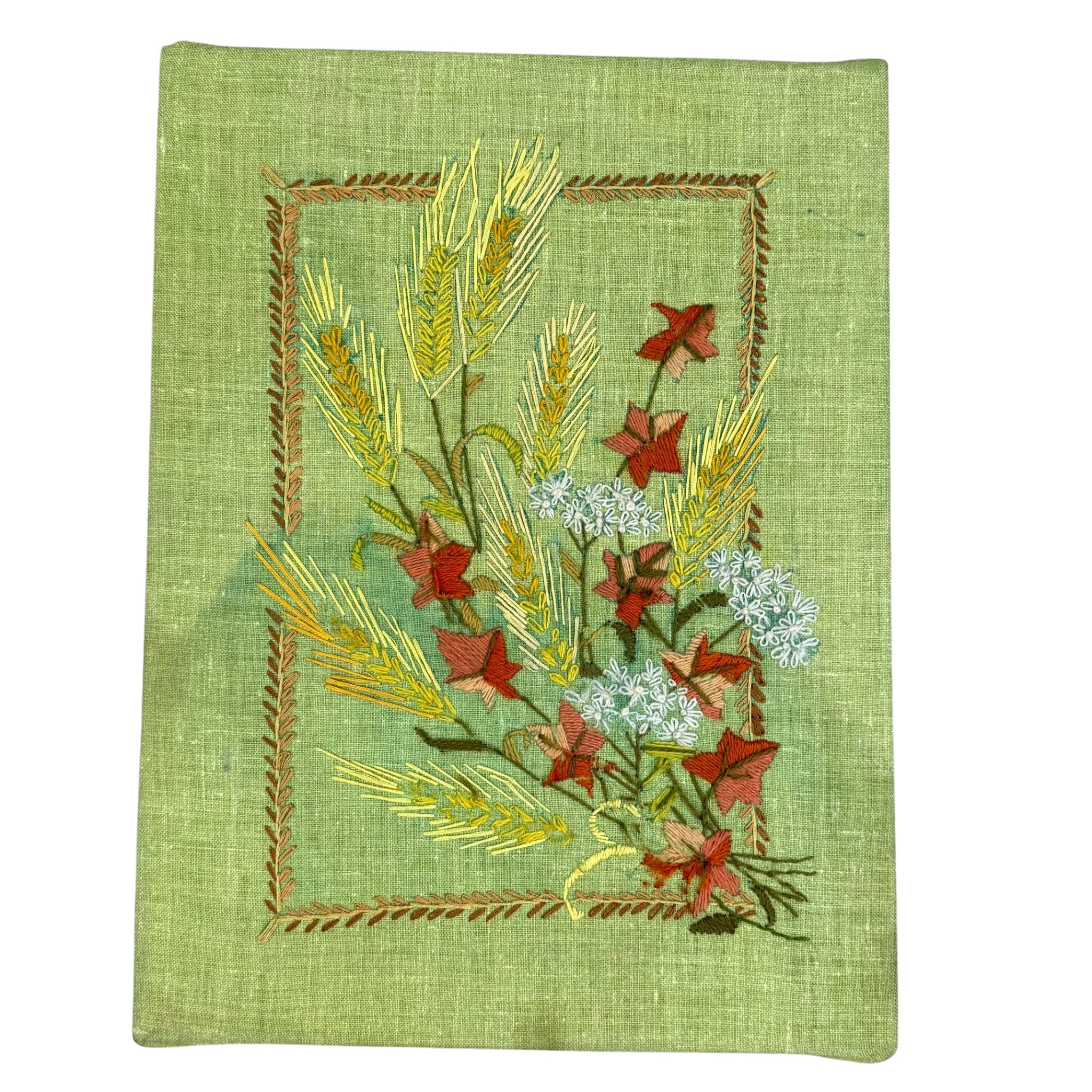 Beautiful vintage hand-embroidered linen wall panel featuring a botanical design of wheat stalks and rust-toned flowers on a sage green background. Skillfully stitched with dimensional threadwork. Ideal for vintage textile collectors, boho home decor, or mid-century naturalist style interiors.