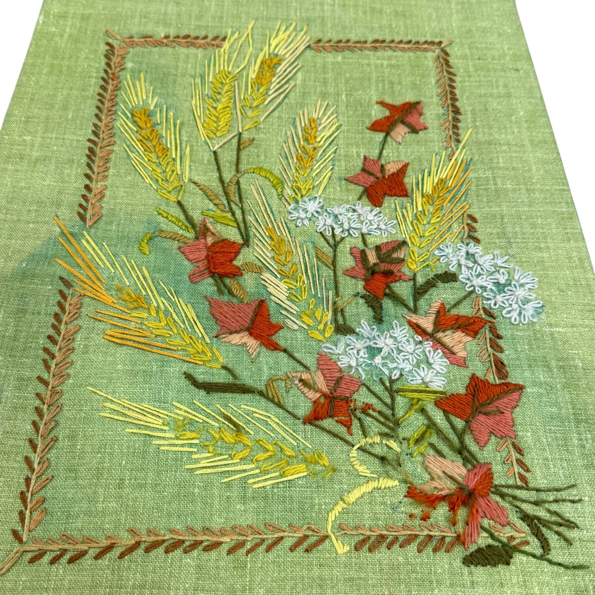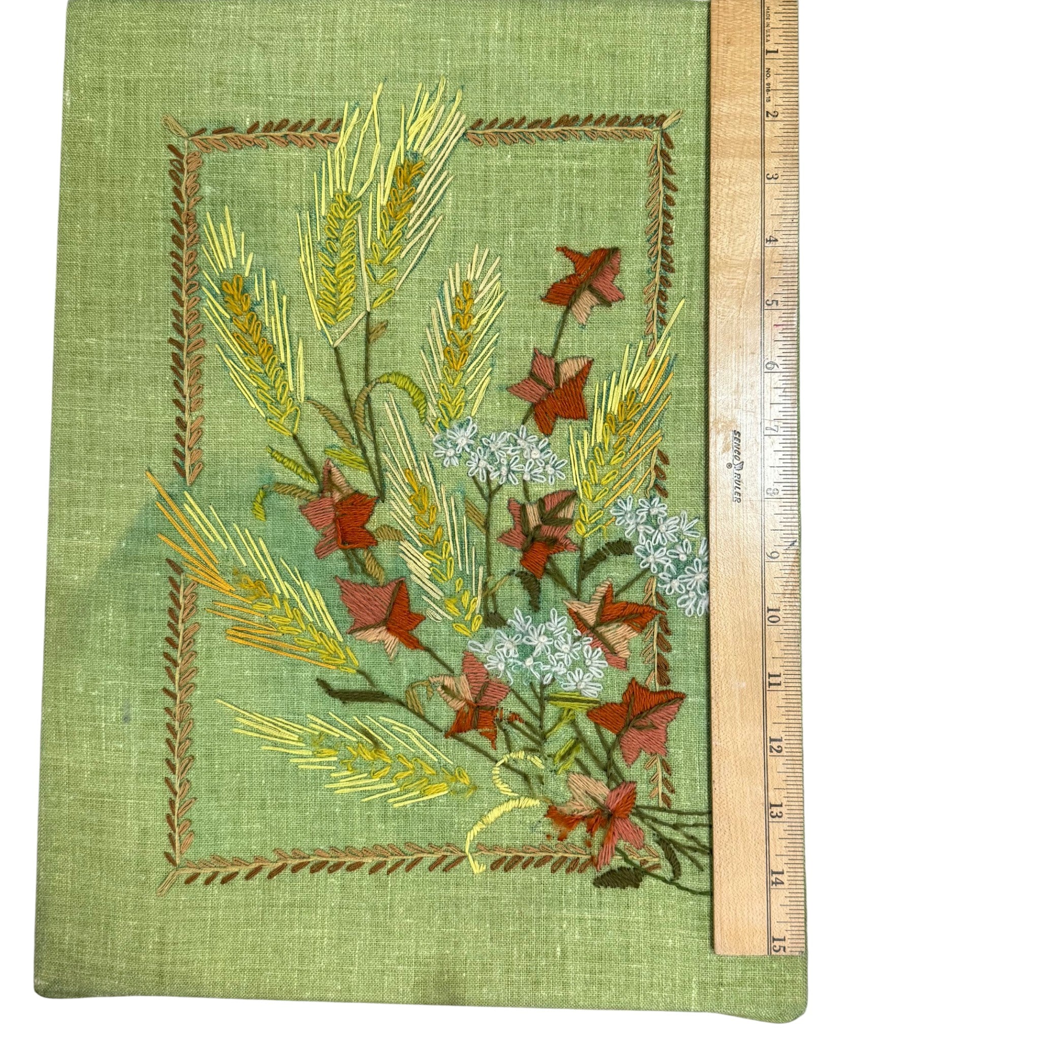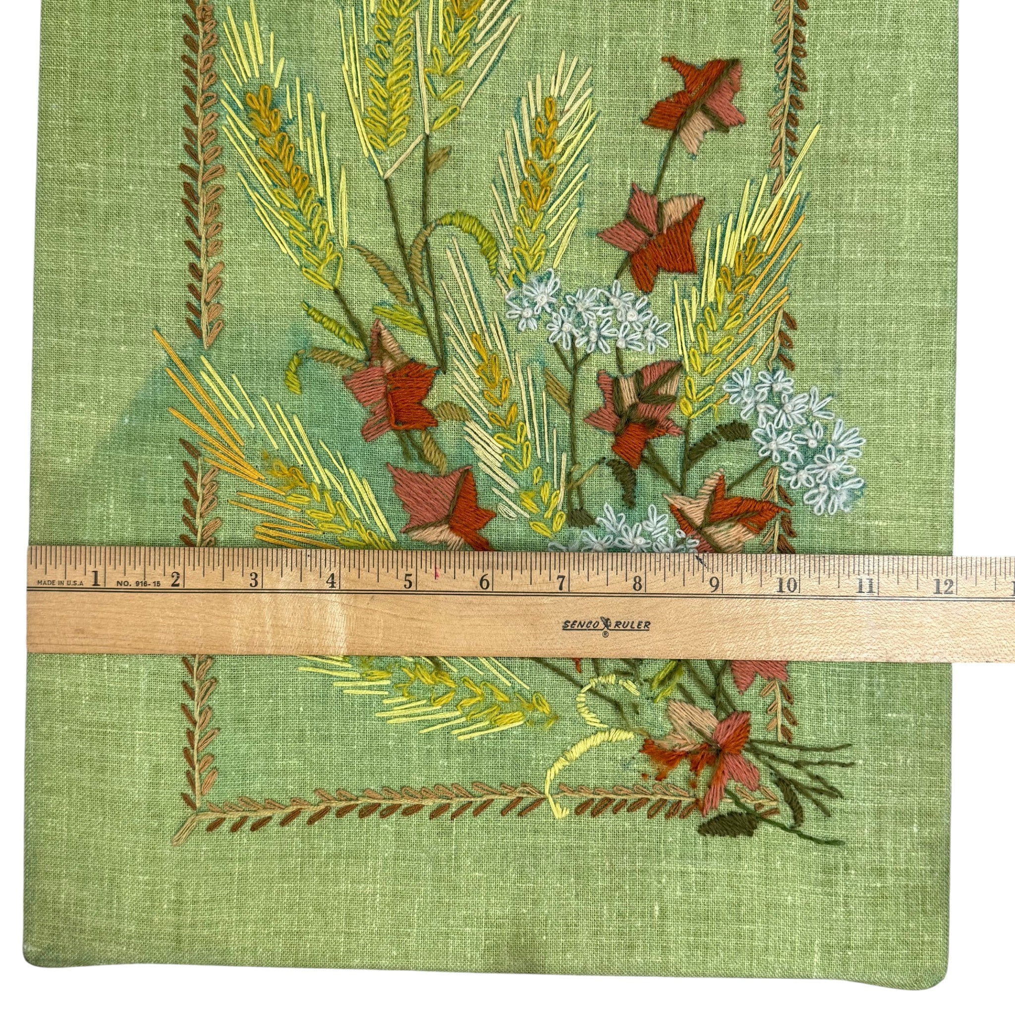 Vintage 1970s Hand Embroidered Floral Wheat Linen Wall Art Mid-Century