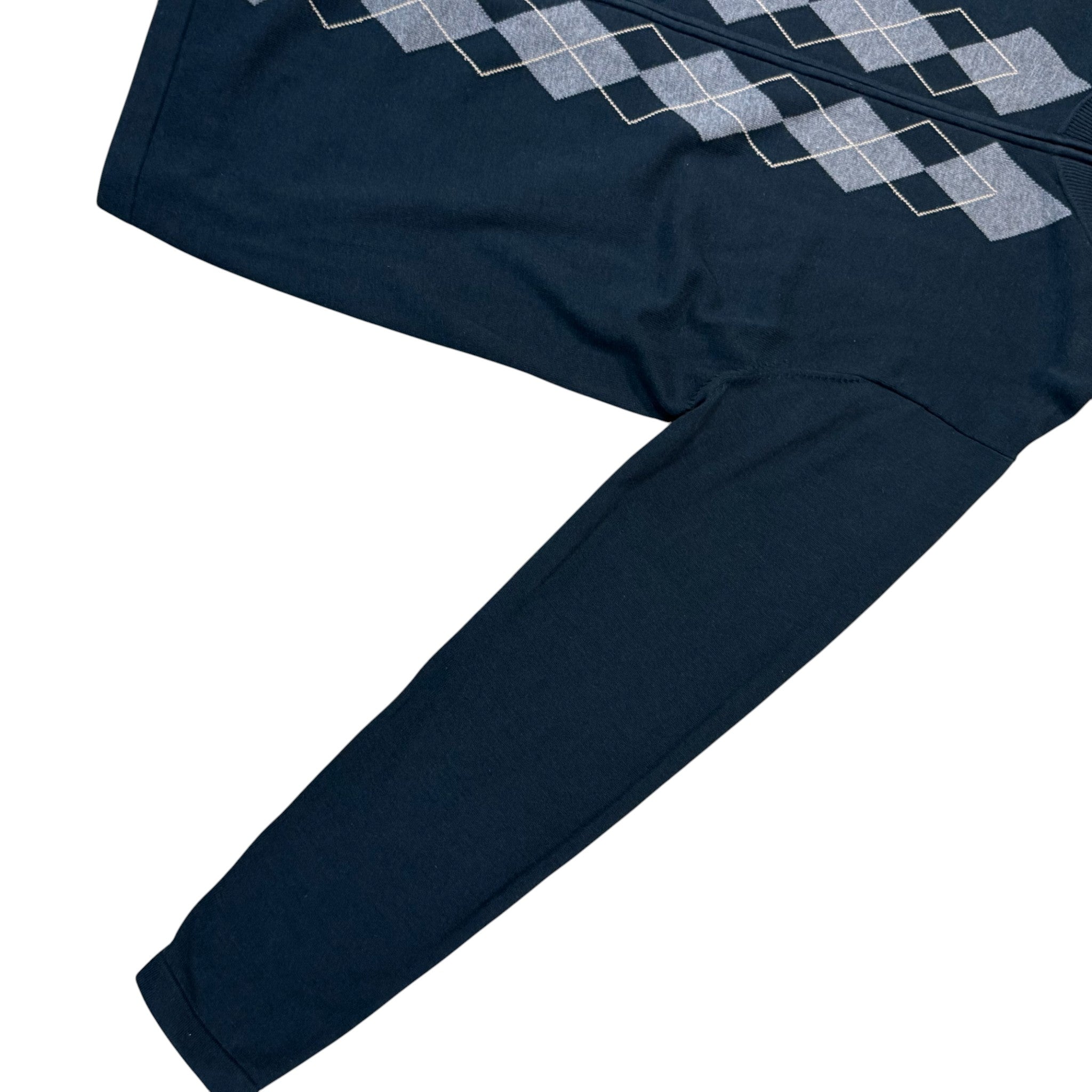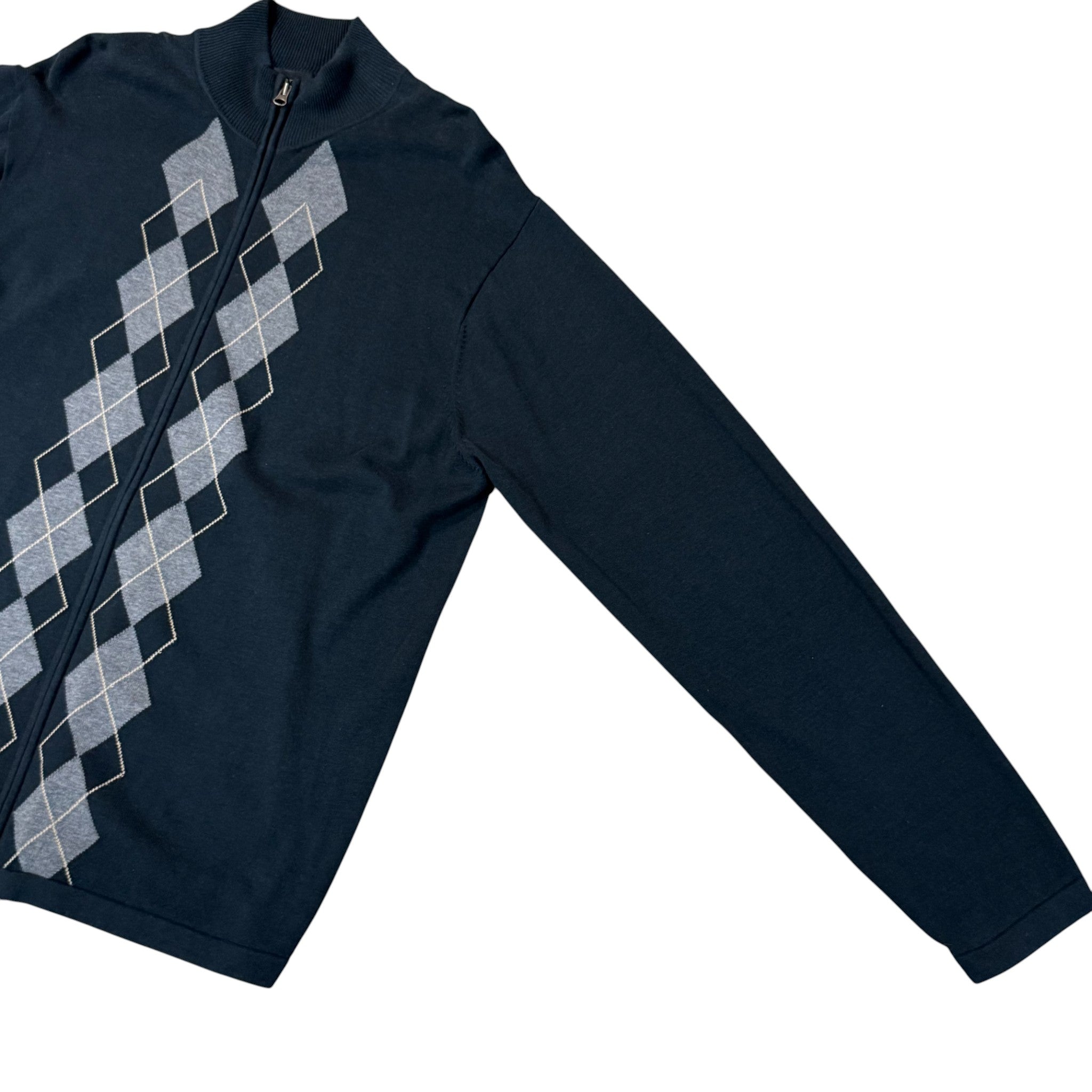 Features a bold vertical argyle panel down the front, ribbed collar, cuffs, and hem, and a clean, structured silhouette. Great for office wear or layering.