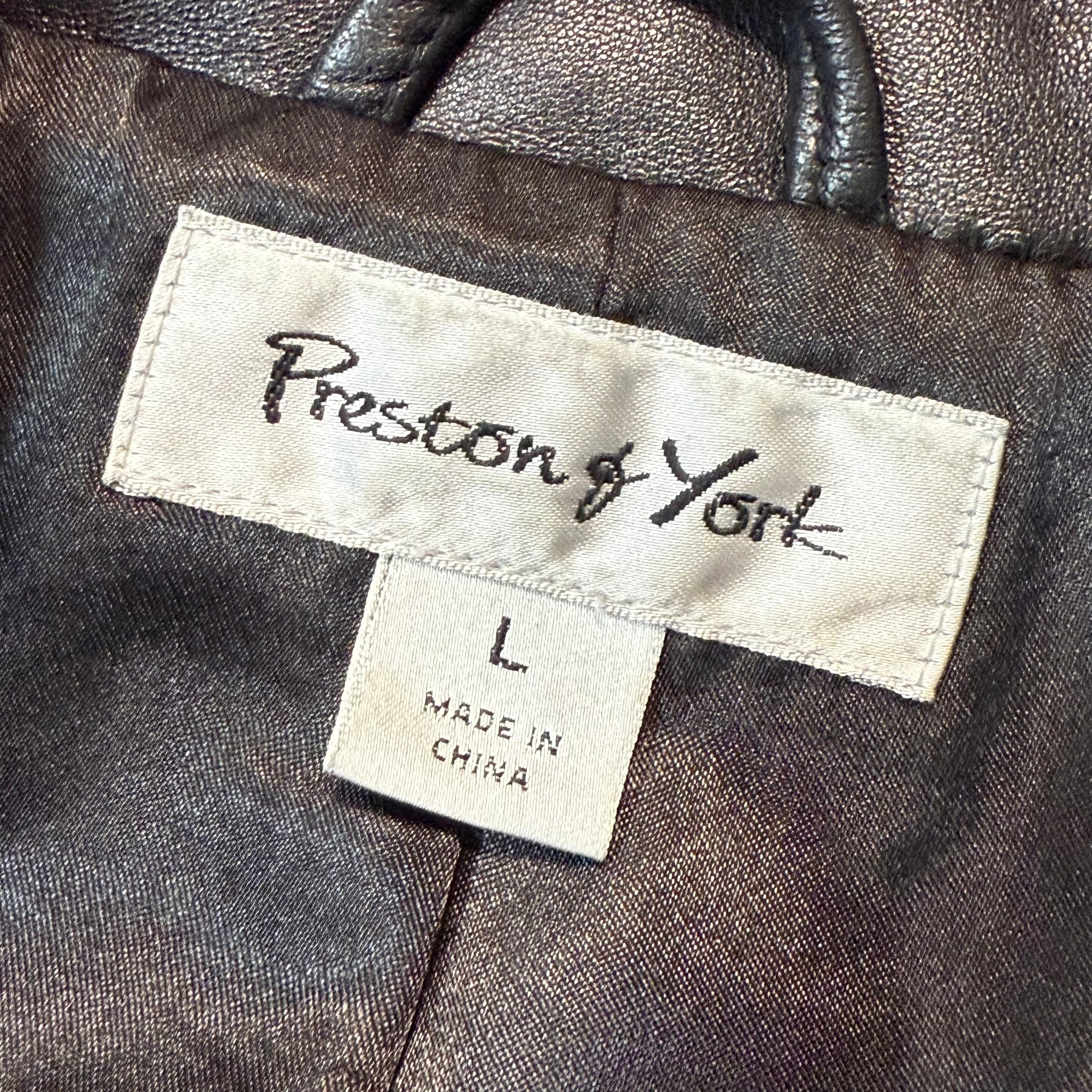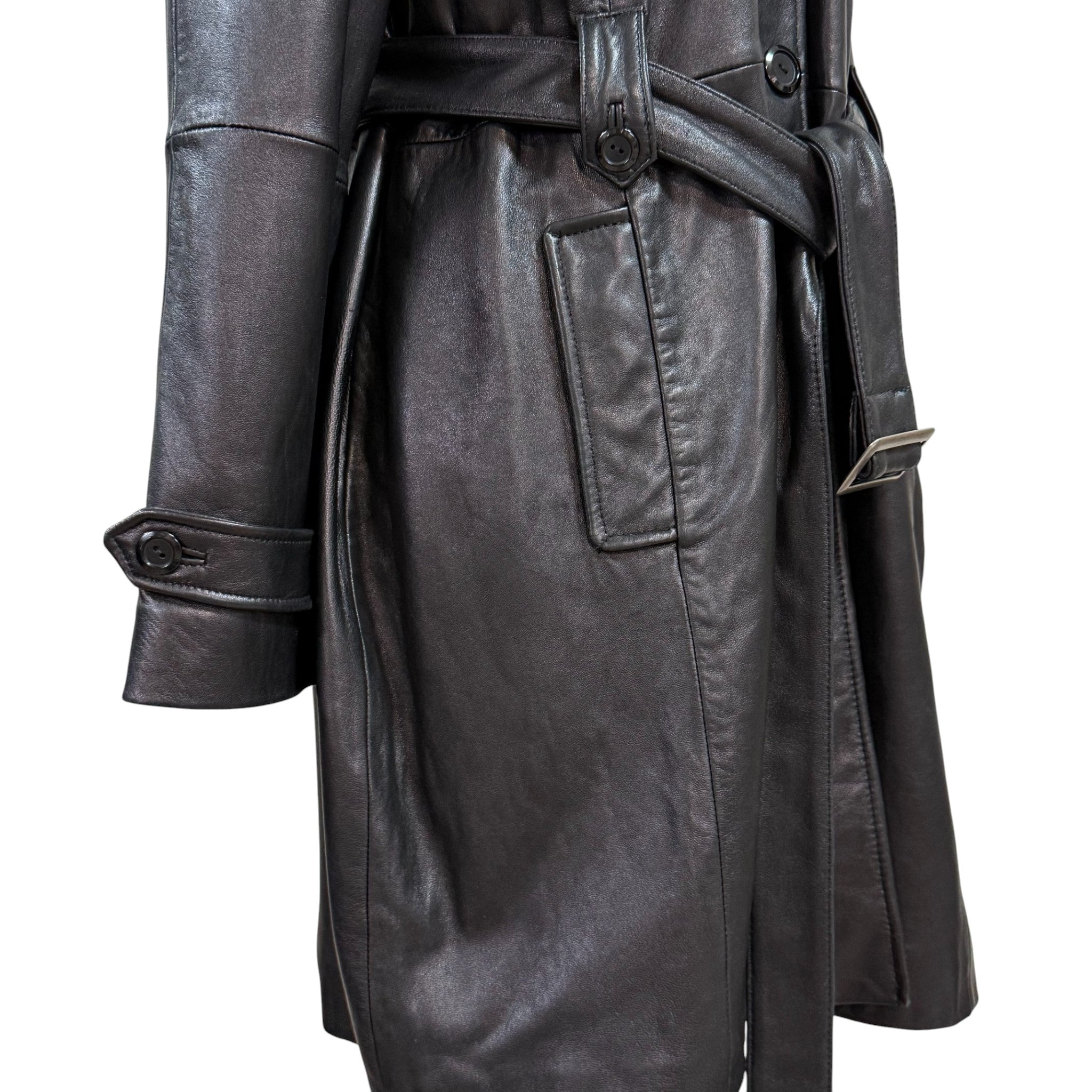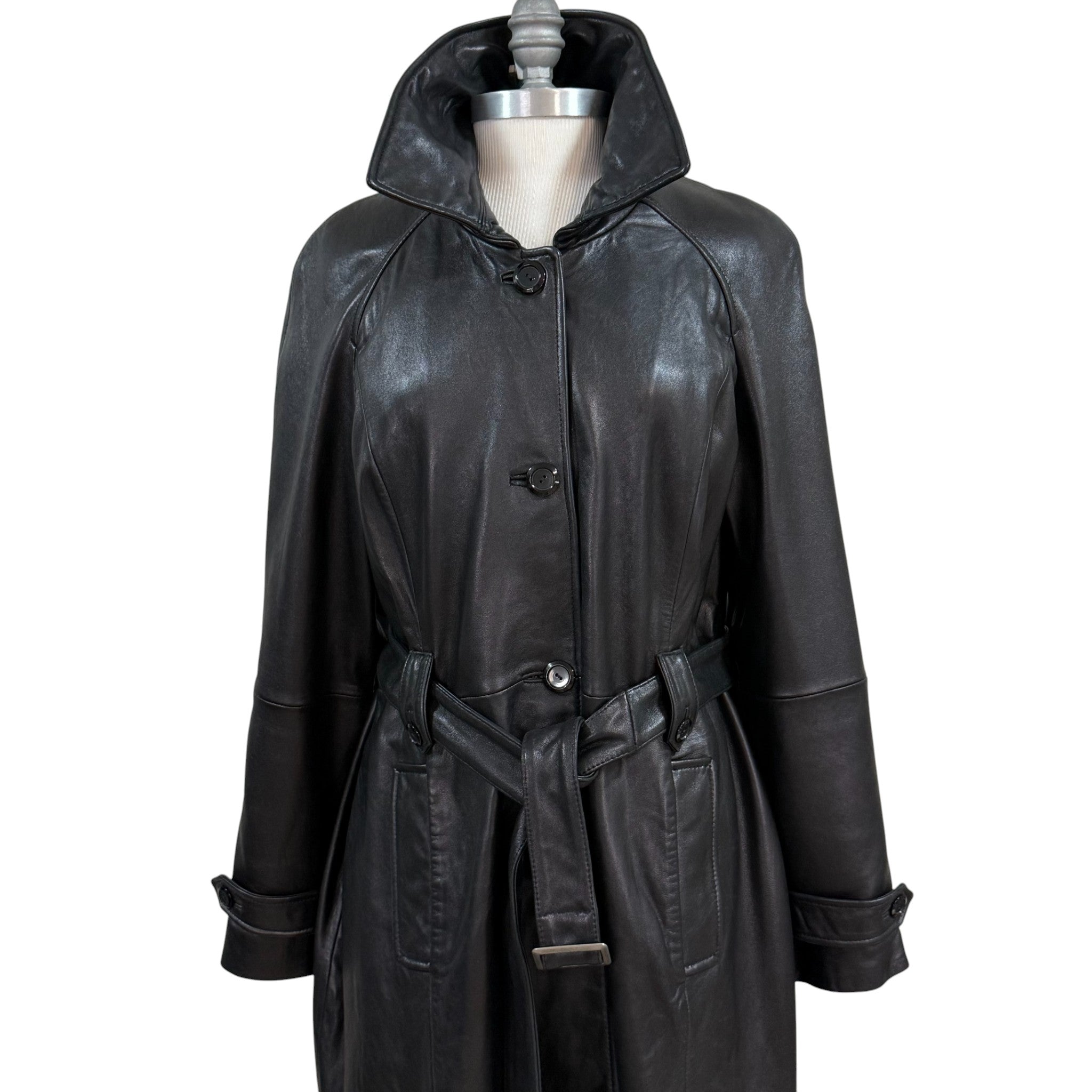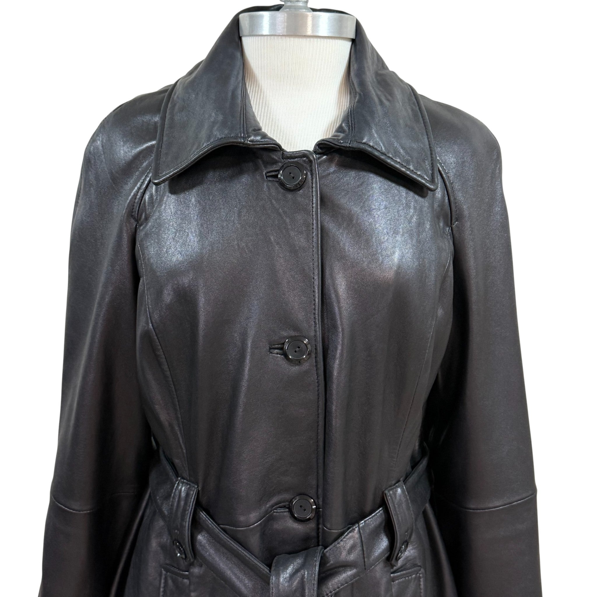High-quality genuine lambskin leather trench coat by Preston & York. Features a belted waist, button front, welt pockets, and adjustable wrist tabs. Soft, supple lambskin with a full polyester lining. Classic, timeless silhouette that pairs with everything. This coat is buttery soft!