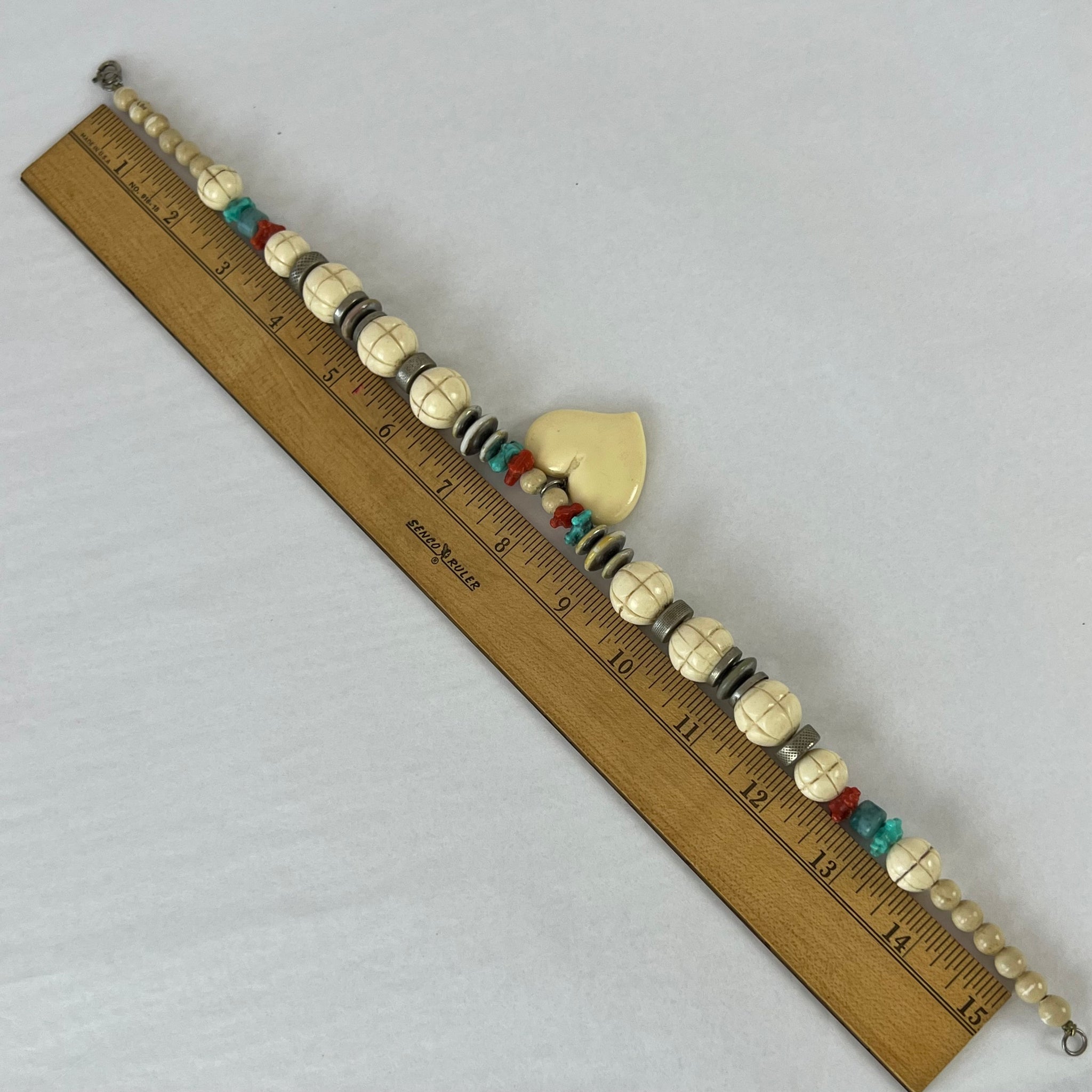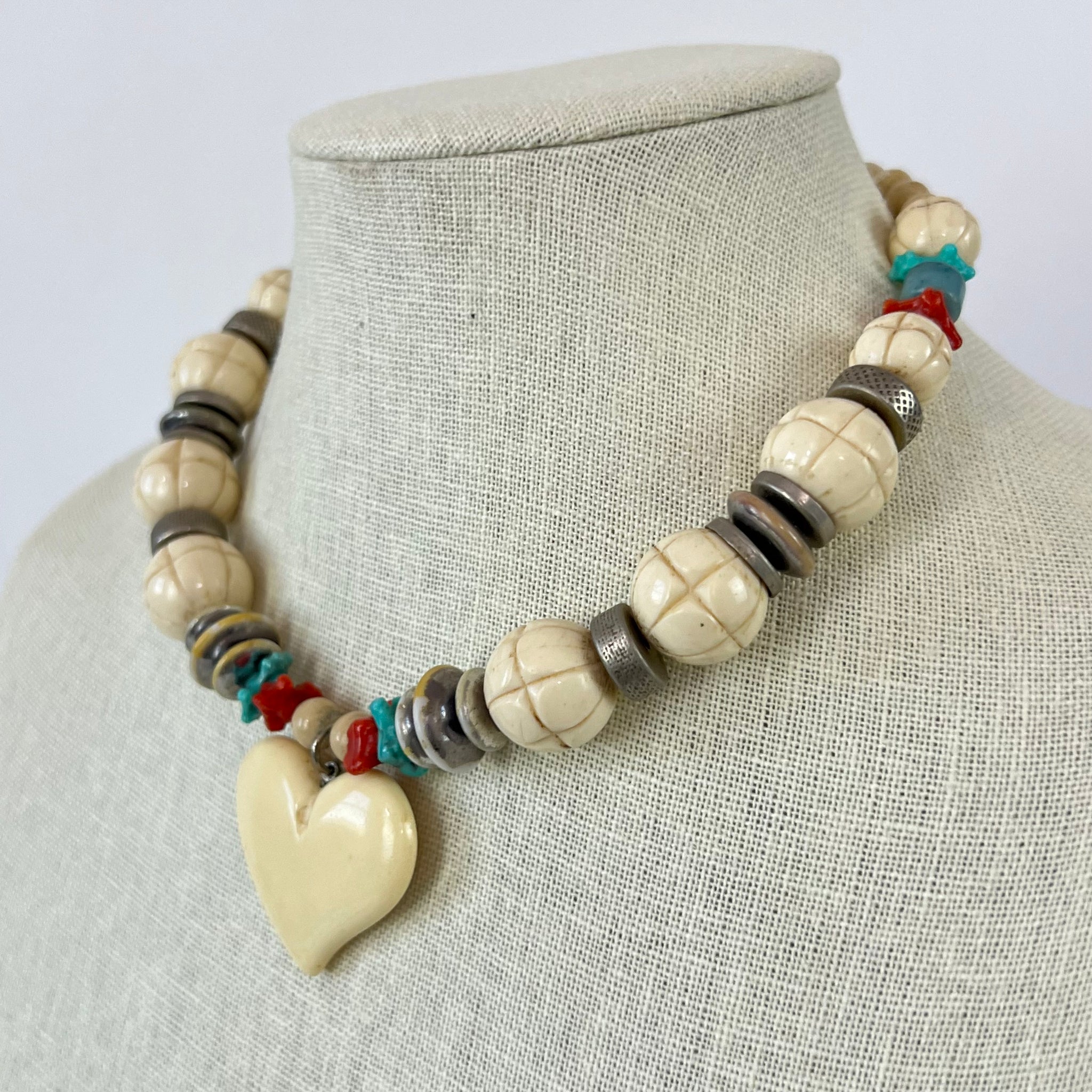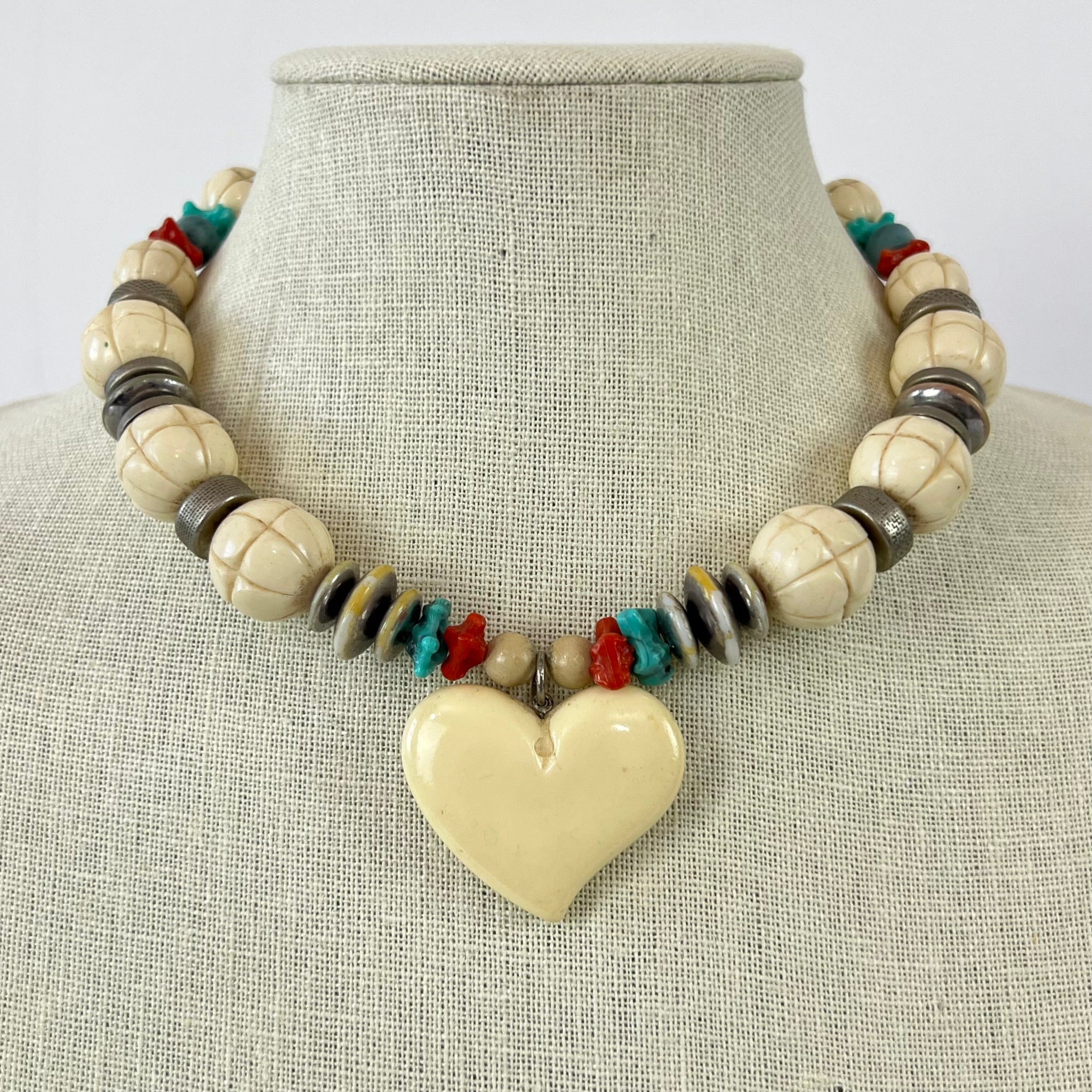 Beaded Chunky Heart Collar Necklace features faux turquoise and red coral.