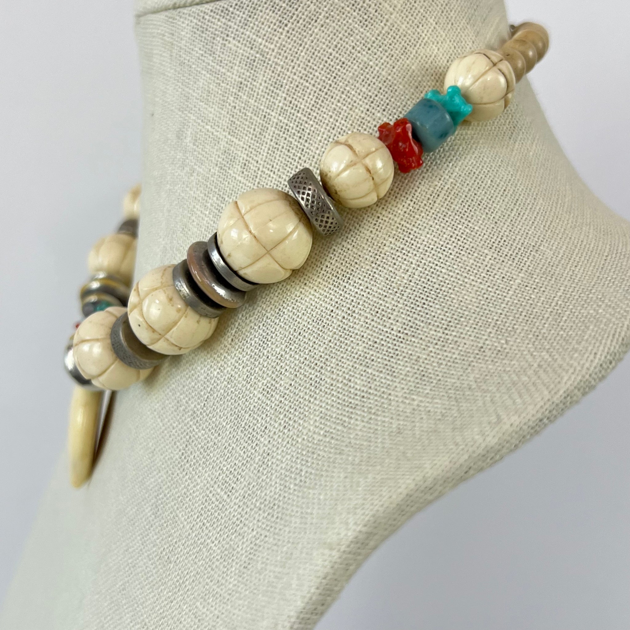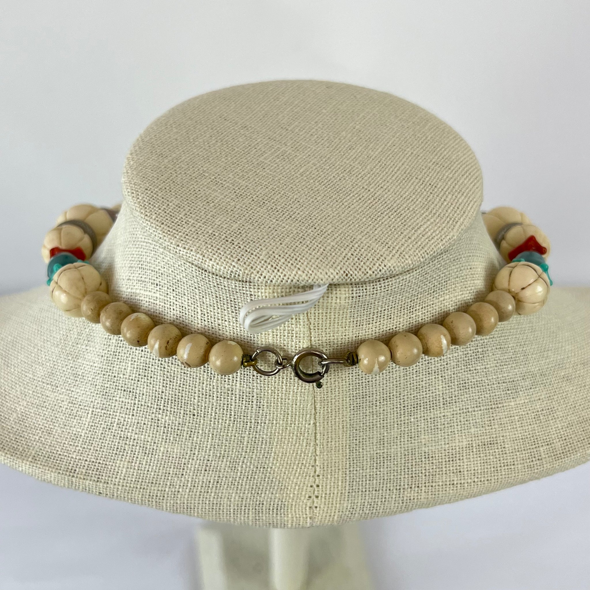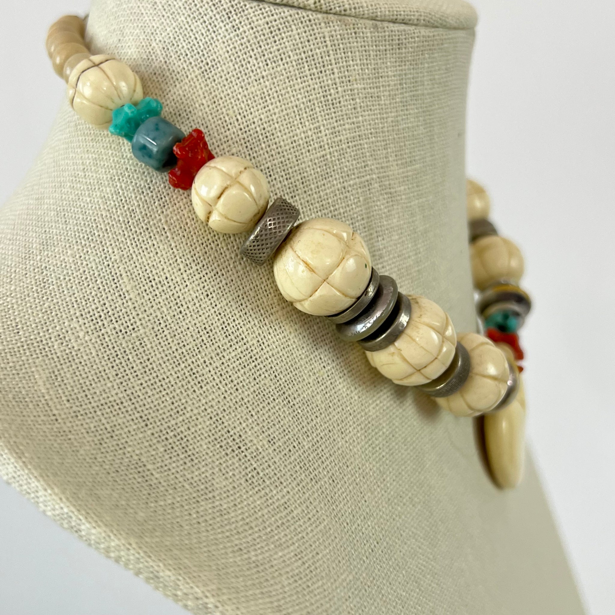 Beaded Chunky Heart Collar Necklace features faux turquoise and red coral.