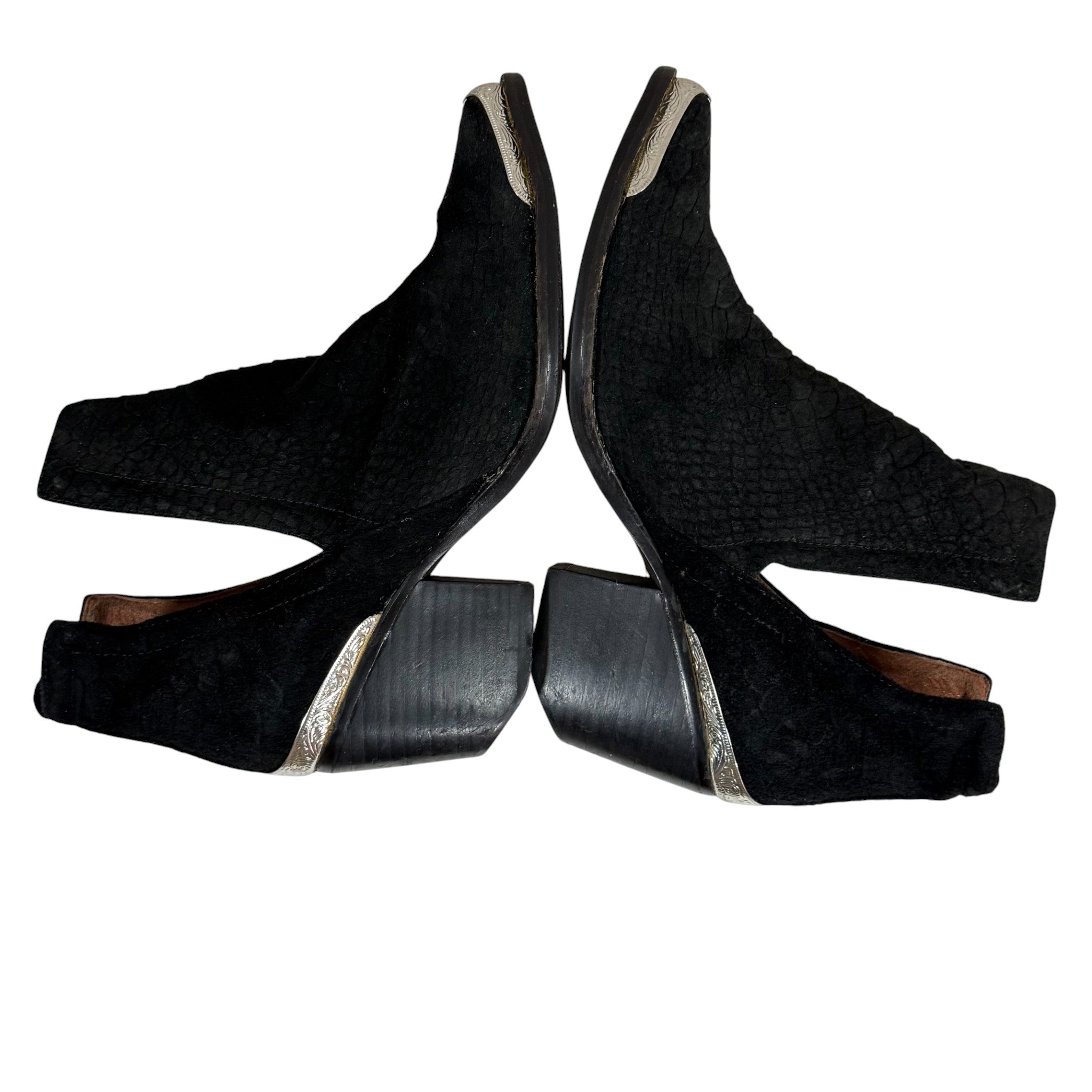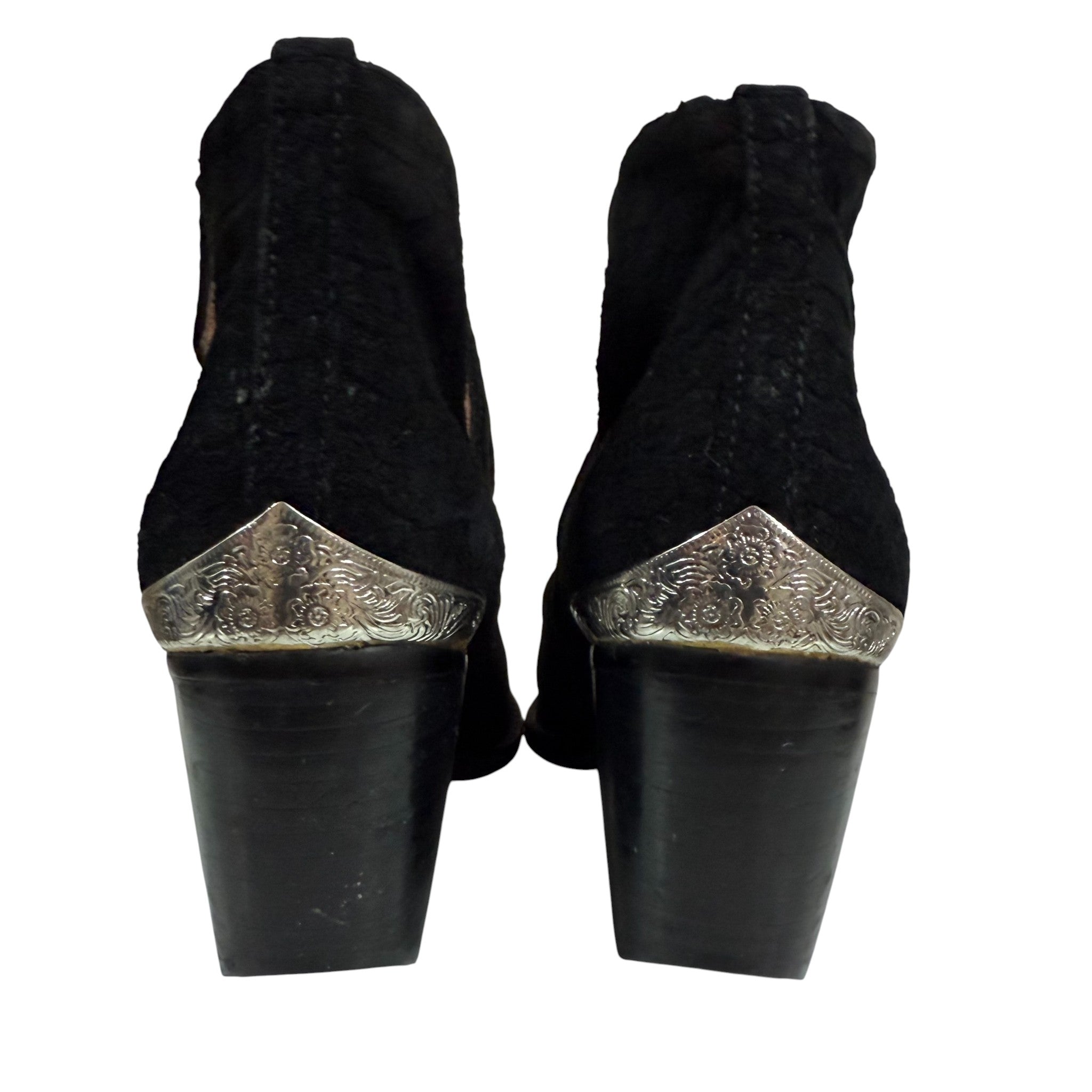 Western ankle boots by Jeffrey Campbell featuring black textured suede, deep side cutouts, and engraved silver-tone toe and heel caps. A block heel adds height with stability, and the western-meets-modern design pairs effortlessly with denim, dresses, or festival looks.