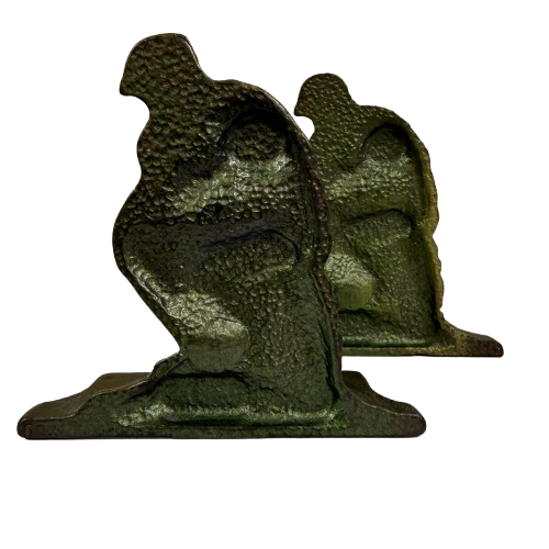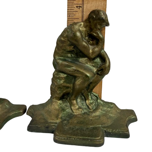 Description: Pair of vintage cast metal bookends inspired by Rodin’s The Thinker. Featuring a classic mid-century sculptural form with aged bronze-style patina. Solid and heavy for their size, with visible wear and oxidation consistent with age. A great accent for a bookshelf, office, or study.