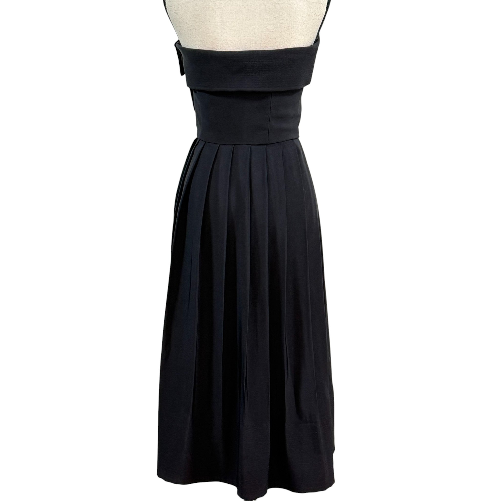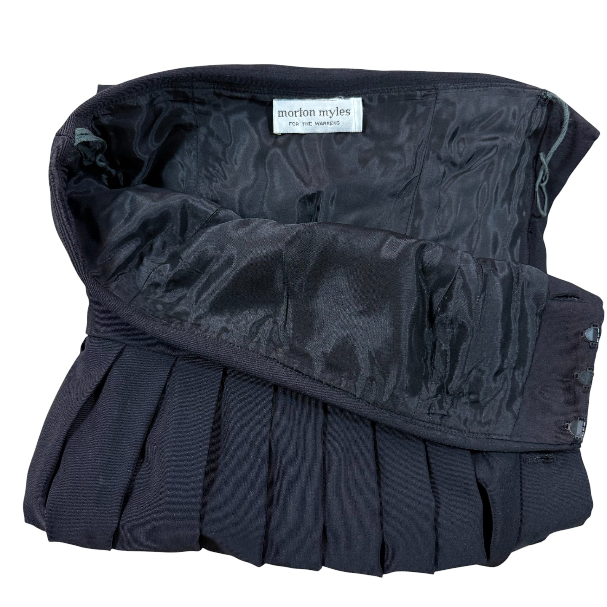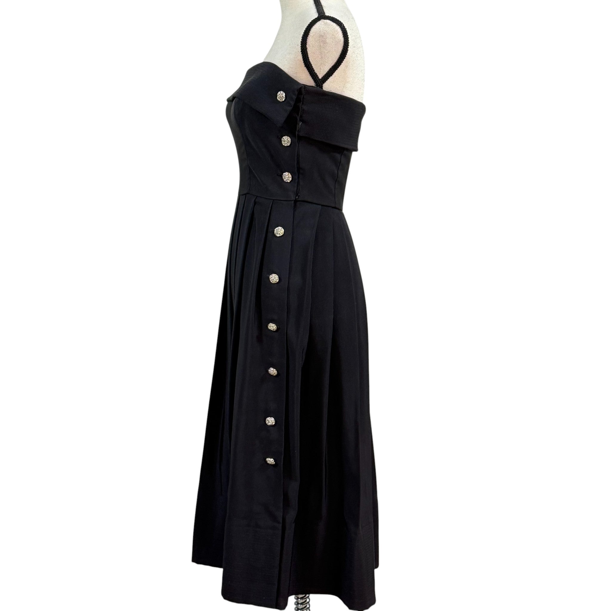 Stunning vintage early-1980s Morton Myles for The Warrens black formal dress featuring an elegant strapless neckline with fold-over detail and decorative rhinestone buttons down the side front. The bodice is structured while the skirt flows into soft pleats for a classic, flattering silhouette.