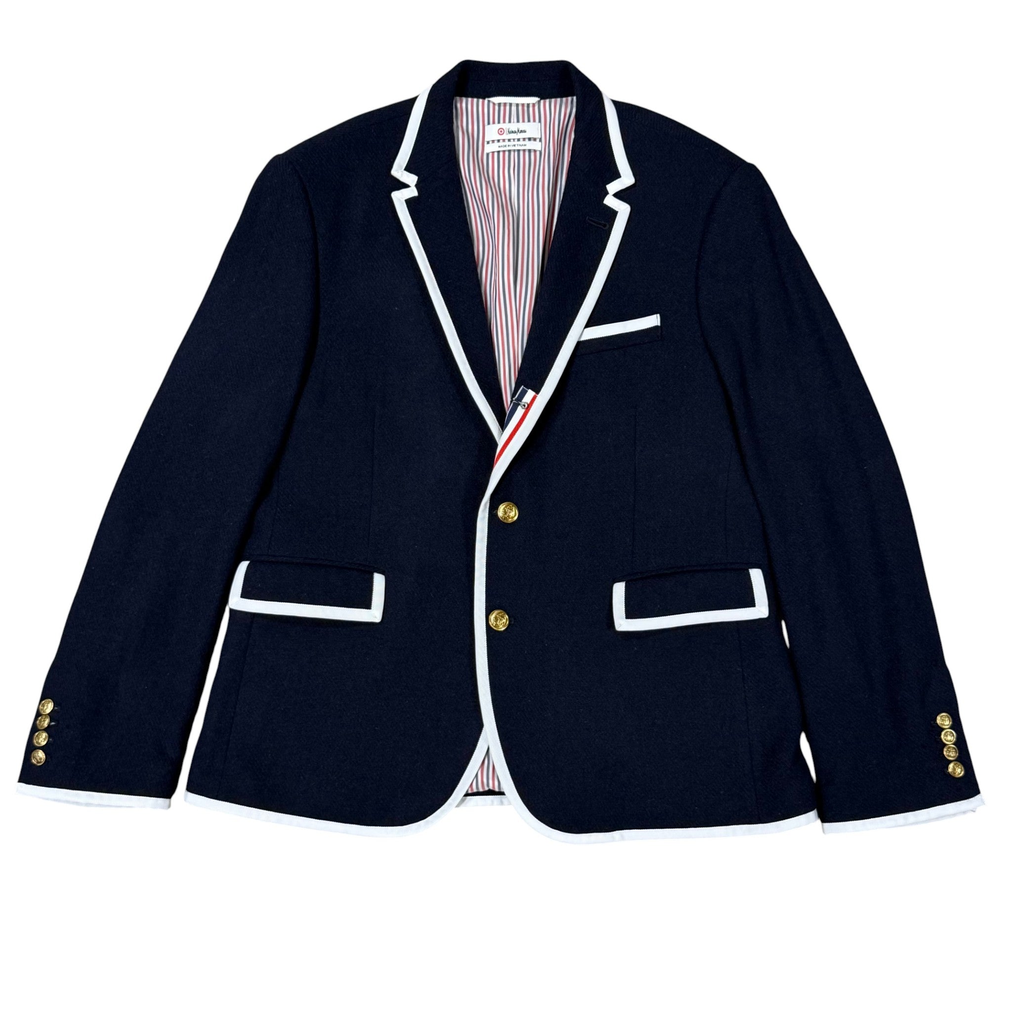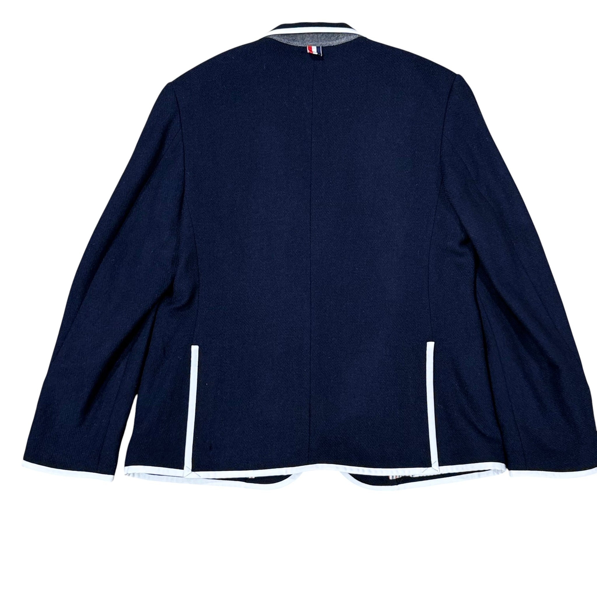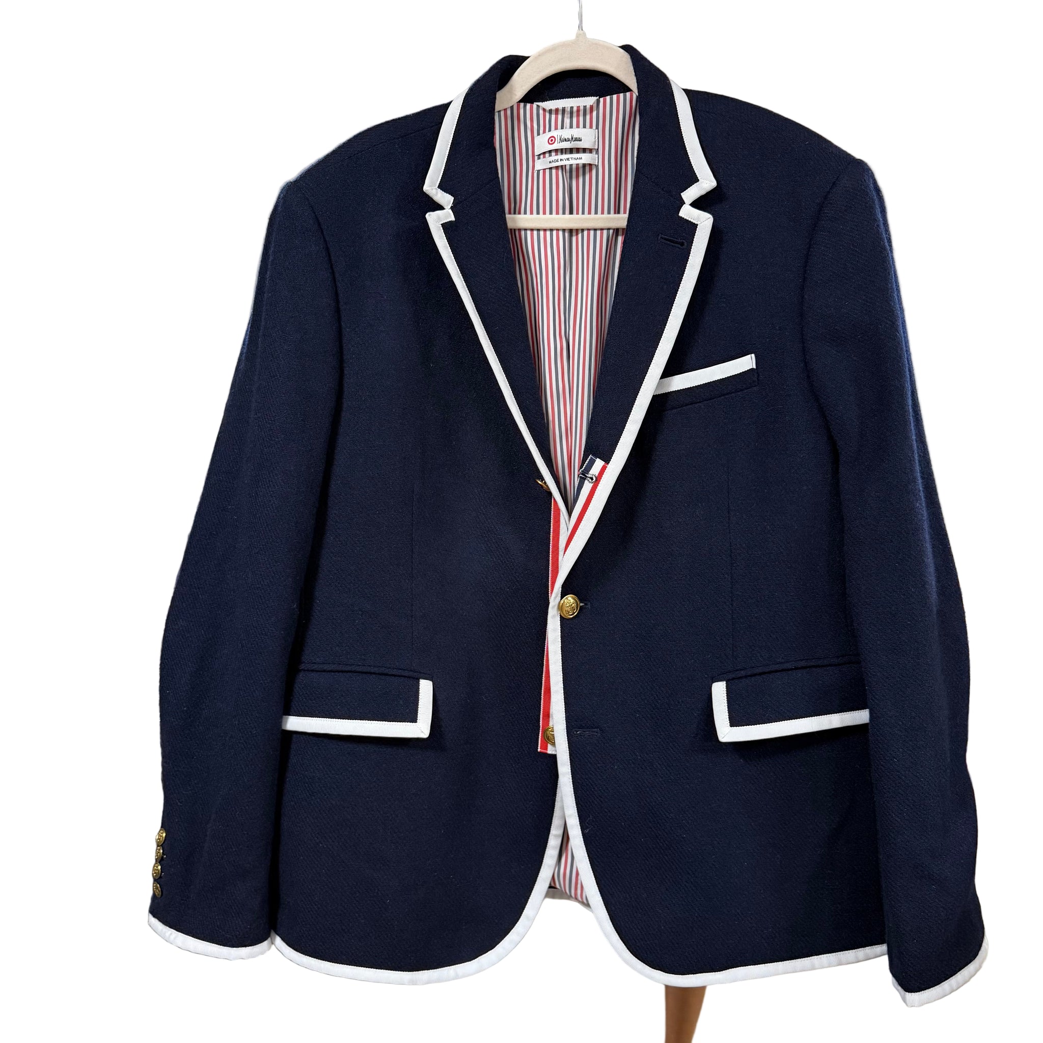 Men's Limited-edition Thom Browne x Neiman Marcus for Target blazer Size Large- Crafted in navy wool with white grosgrain trim, this tailored blazer captures Thom Browne’s signature preppy-meets-modern aesthetic. It features gold-tone buttons, three front pockets, and the iconic red, white, and blue striped lining—a nod to Browne’s American luxury design.