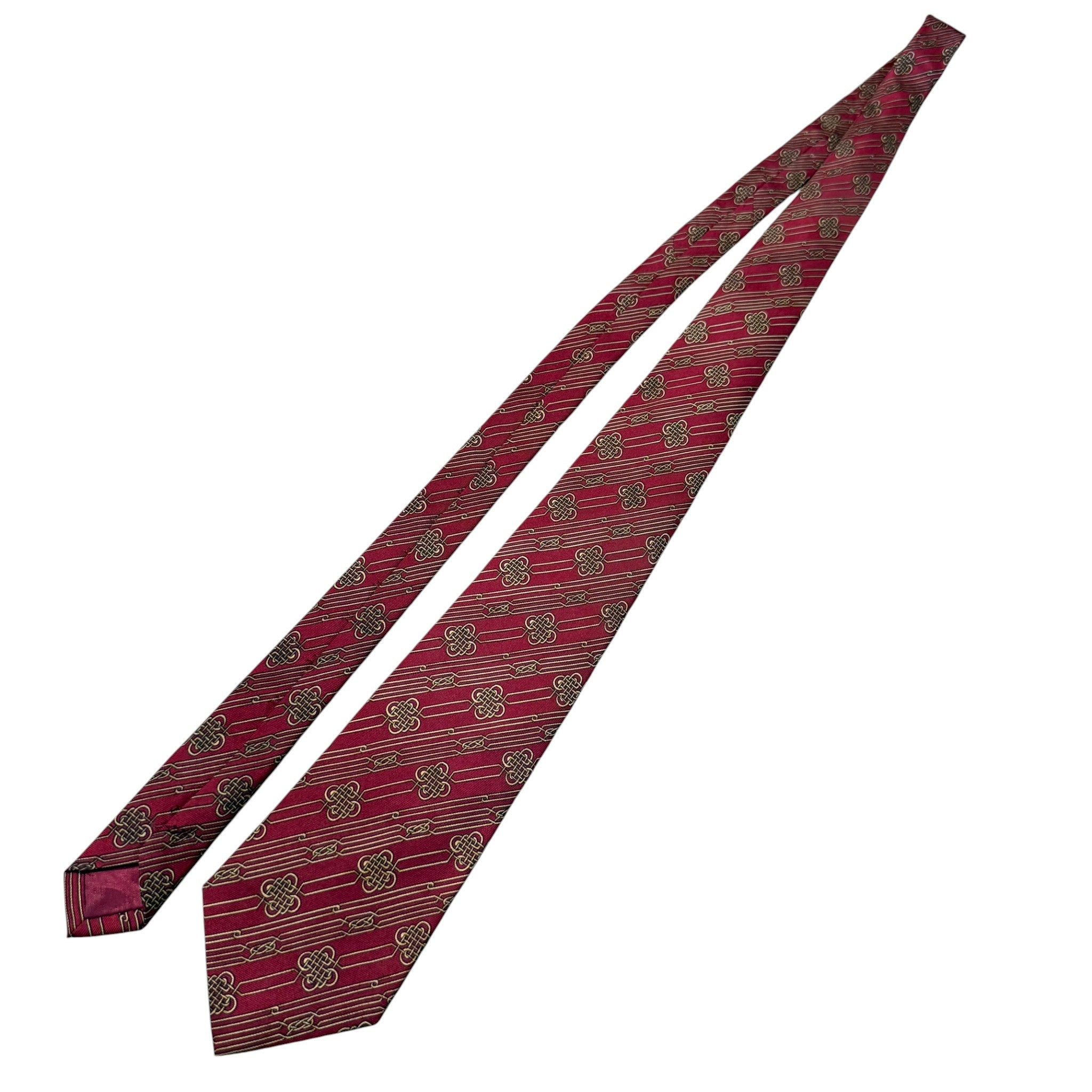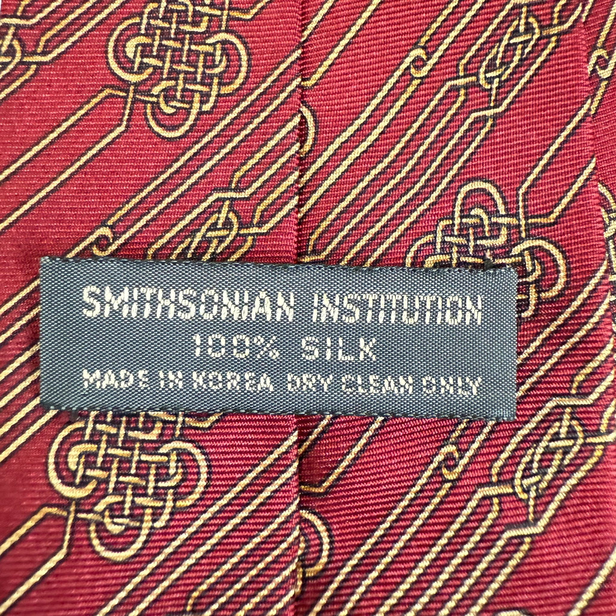Vintage late-80s/90s Smithsonian Institution 100% silk tie in a burgundy geometric chain-link pattern. Made in Korea. Smooth silk with a classic museum-gift-shop design, perfect for collectors, academics, or anyone who loves refined vintage menswear.