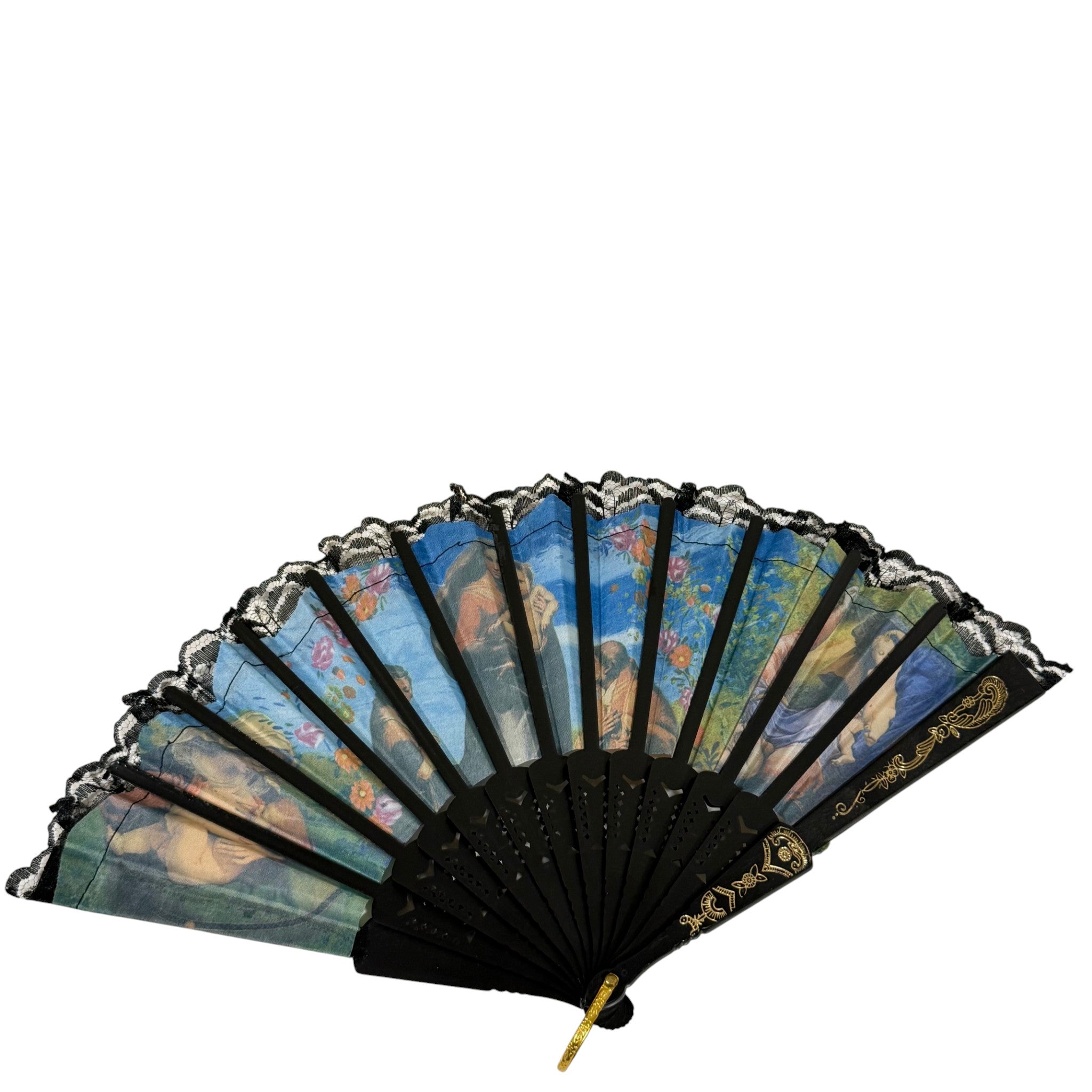 Vintage decorative folding hand fan featuring a religious sacred art scene depicting holy figures, framed with black lace trim and detailed fan guards. This style of devotional fan was commonly produced as a religious souvenir or decorative piece, often associated with Catholic imagery and spiritual themes.